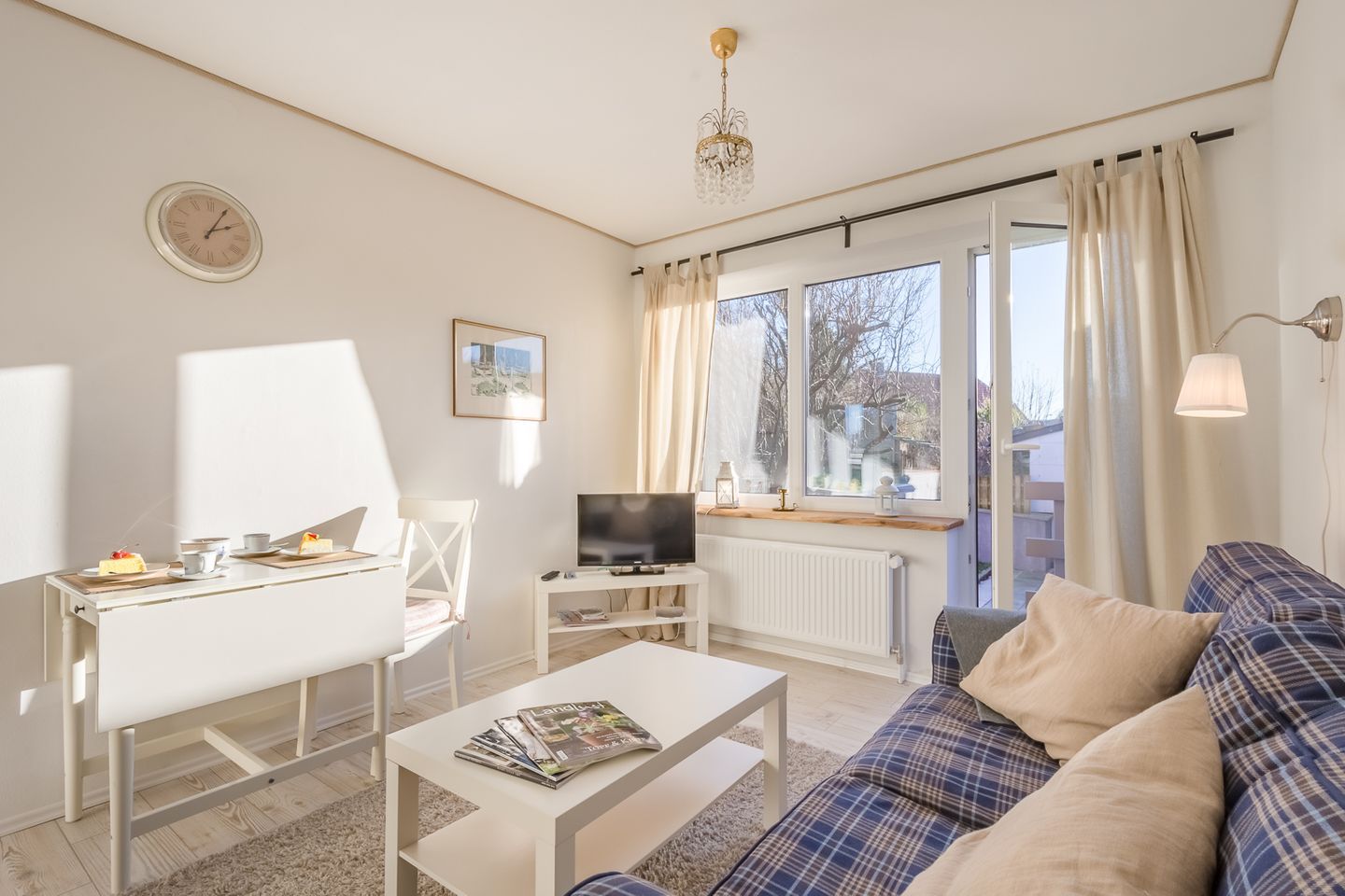 Der gemütliche Wohn-/ Essraum mit offener, hochwertiger Küche im Landhausstil mit Geschirrspüler, Mikrowelle und Backofen lädt zum Wohlfühlen ein.