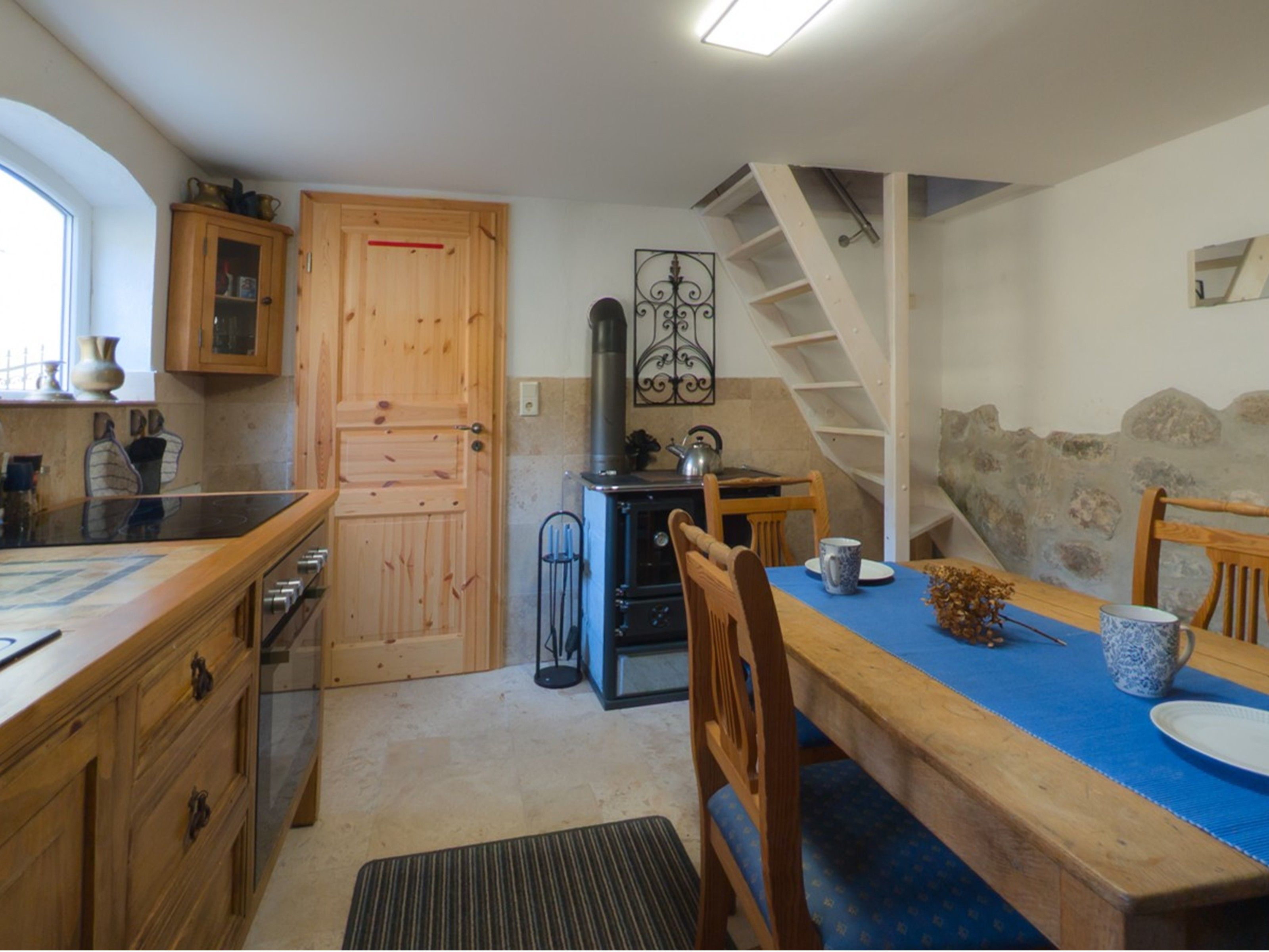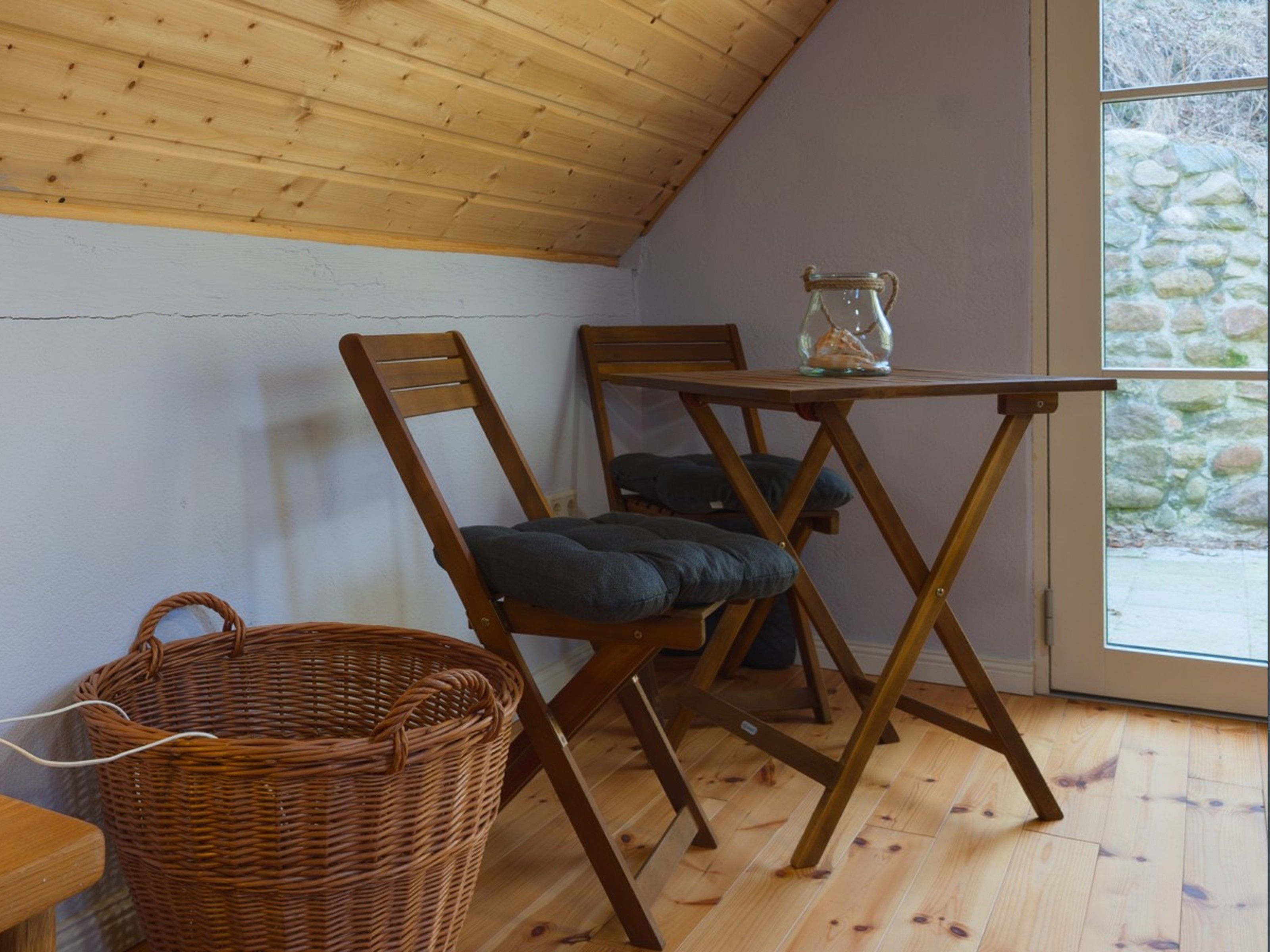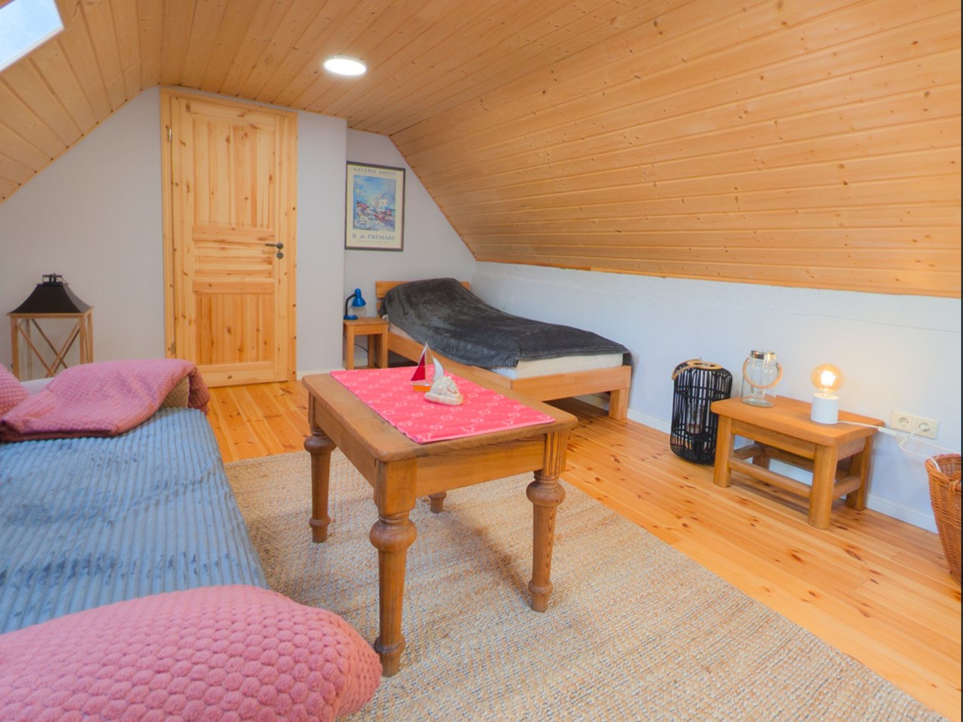 Das zweite Häuschen, „Antons Remise“, liegt hinter „Ellas Gehöft“ und überzeugt durch ebenso viel Charme. Im Erdgeschoss finden Sie eine gut ausgestattete Küche, ein Wohnzimmer mit Kachelofen und ein Badezimmer mit Dusche und WC. Auch hier führt eine steilere Treppe ins Obergeschoss, wo sich zwei Schlafzimmer mit Doppelbetten befinden.