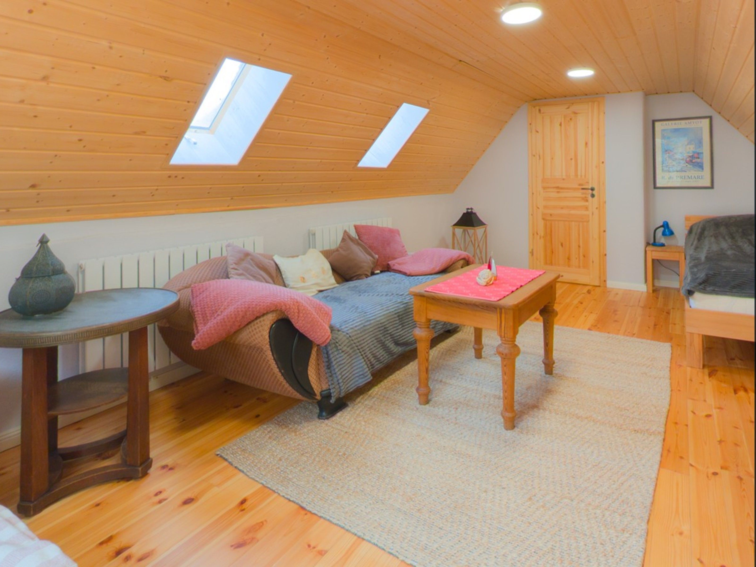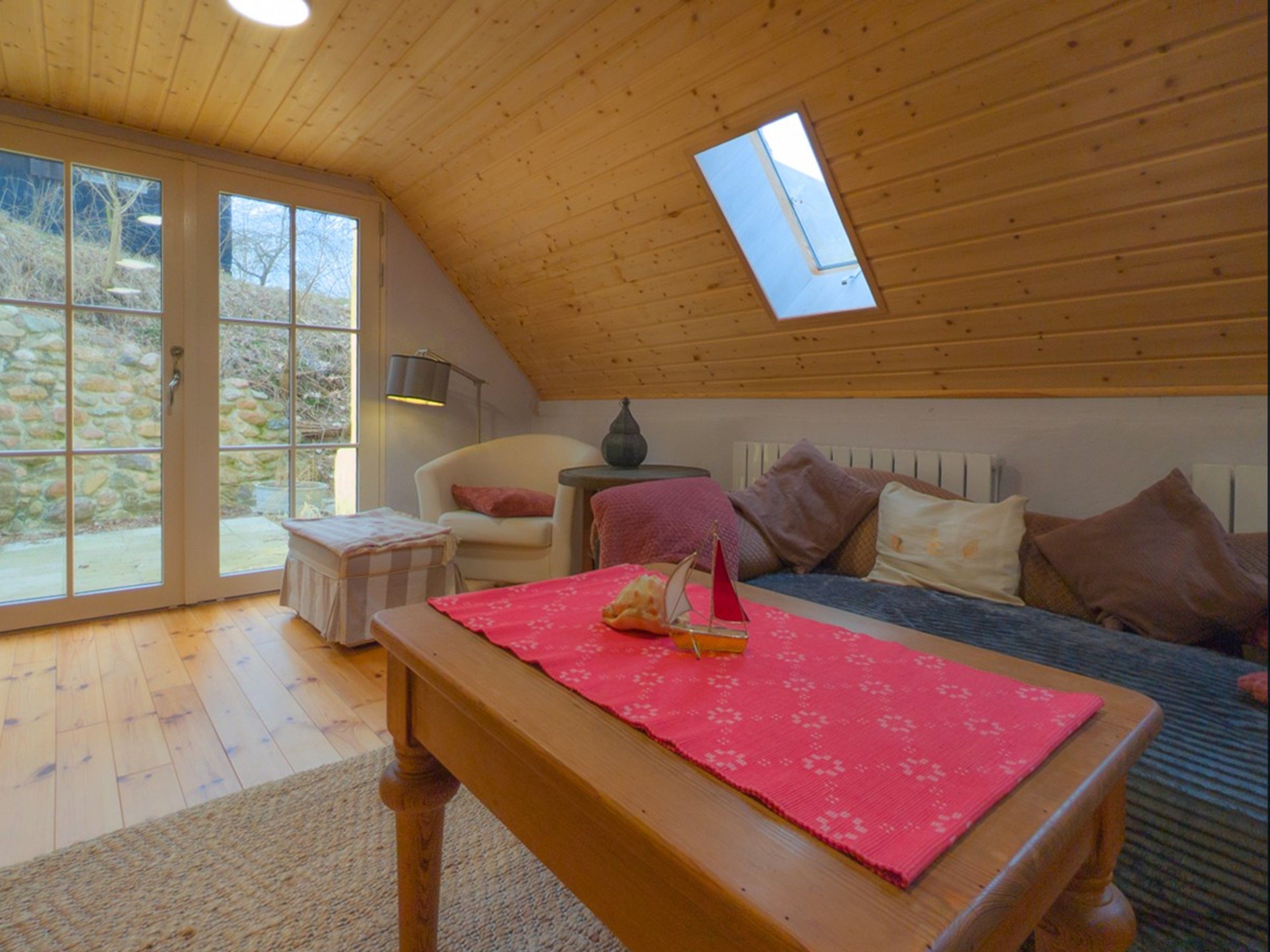 Das erste Häuschen, „Ellas Gehöft“, bietet im Erdgeschoss ein gemütliches Wohnzimmer, eine separate Küche mit rustikalem Holzofen und Zugang zur Terrasse sowie ein Badezimmer mit Dusche und WC. Eine charmante, steilere Holztreppe führt Sie in die oberen Etagen, wo sich zwei Schlafzimmer mit je einem Doppelbett und ein weiteres Badezimmer mit Dusche und WC befinden.