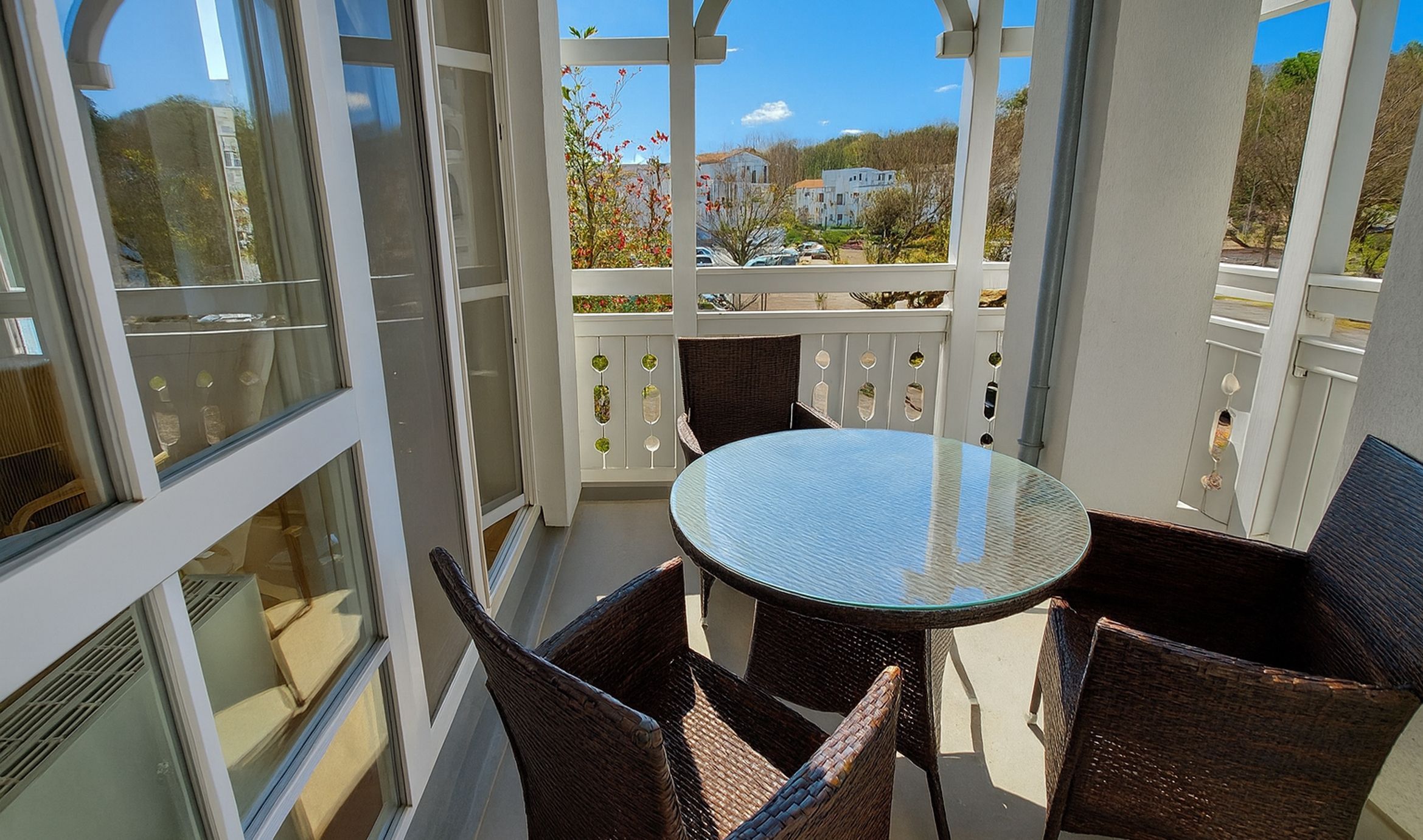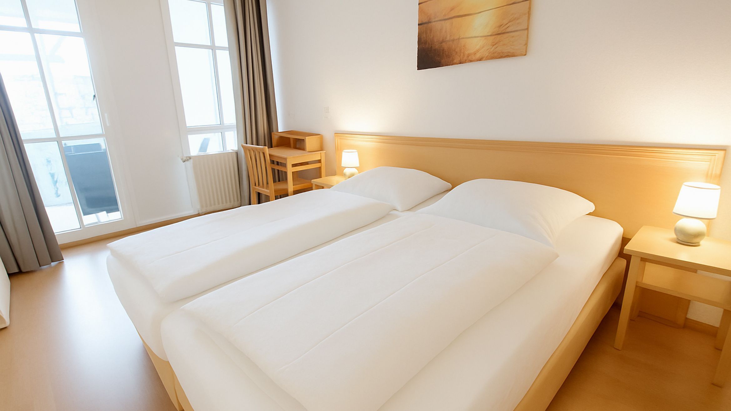 Das geräumige Schlafzimmer ist mit einem Doppelbett, einem Kleiderschrank und einem Schreibtisch für das HomeOffice ausgestattet. Es ist separat vom Flur zugänglich und zusätzlich durch eine Schiebetür vom Wohnraum abtrennbar. Der überdachte Balkon mit moderner Polyrattansitzecke ist sowohl vom Schlafzimmer als auch vom Wohnbereich aus erreichbar.