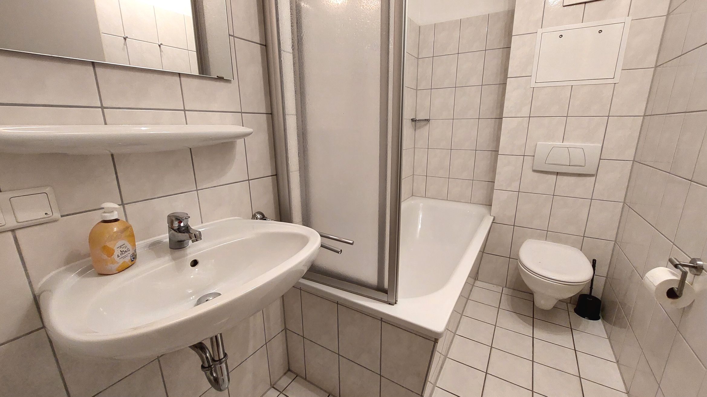 Das Badezimmer ist modern und hell gefliest und verfügt über eine Badewanne mit integrierter Duschmöglichkeit sowie ein WC. Ein Fön ist vorhanden. Eine kleine Abstellkammer gehört ebenfalls zur Wohnung.