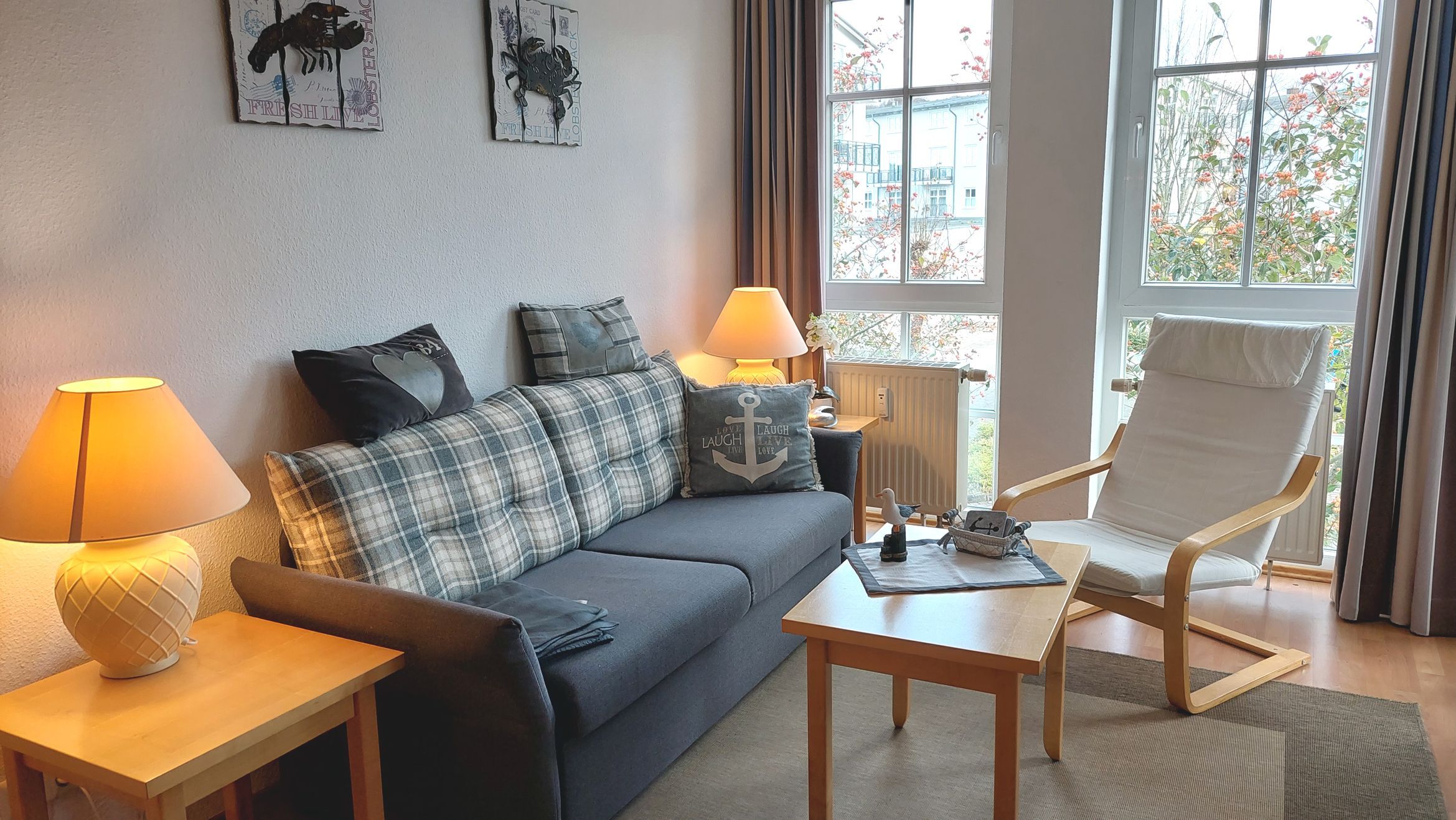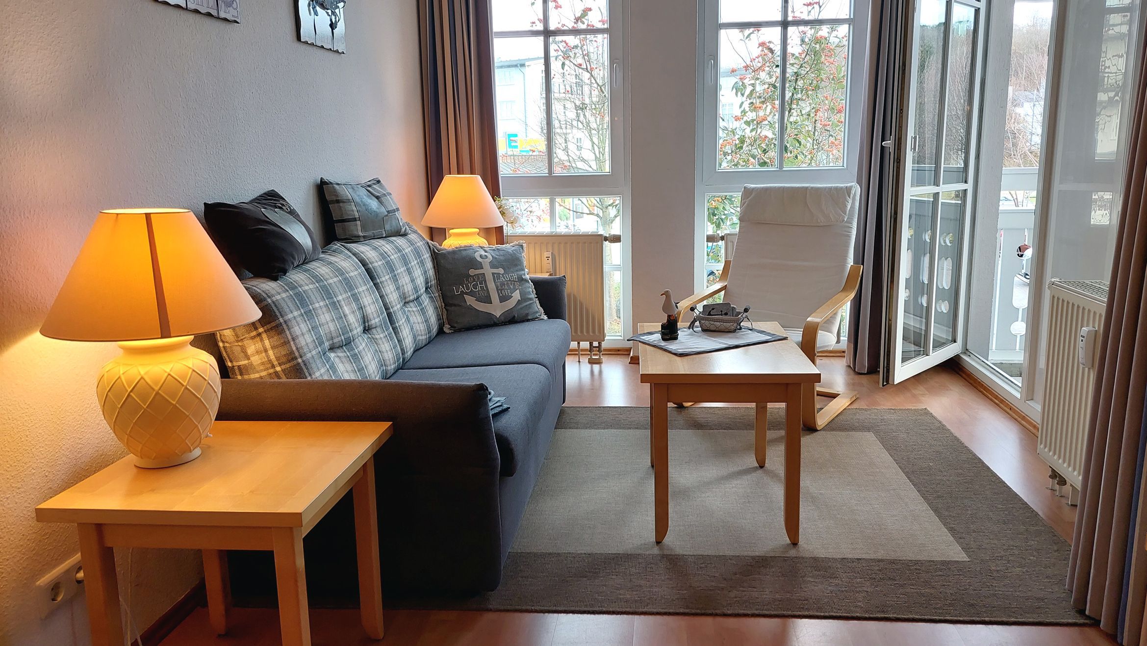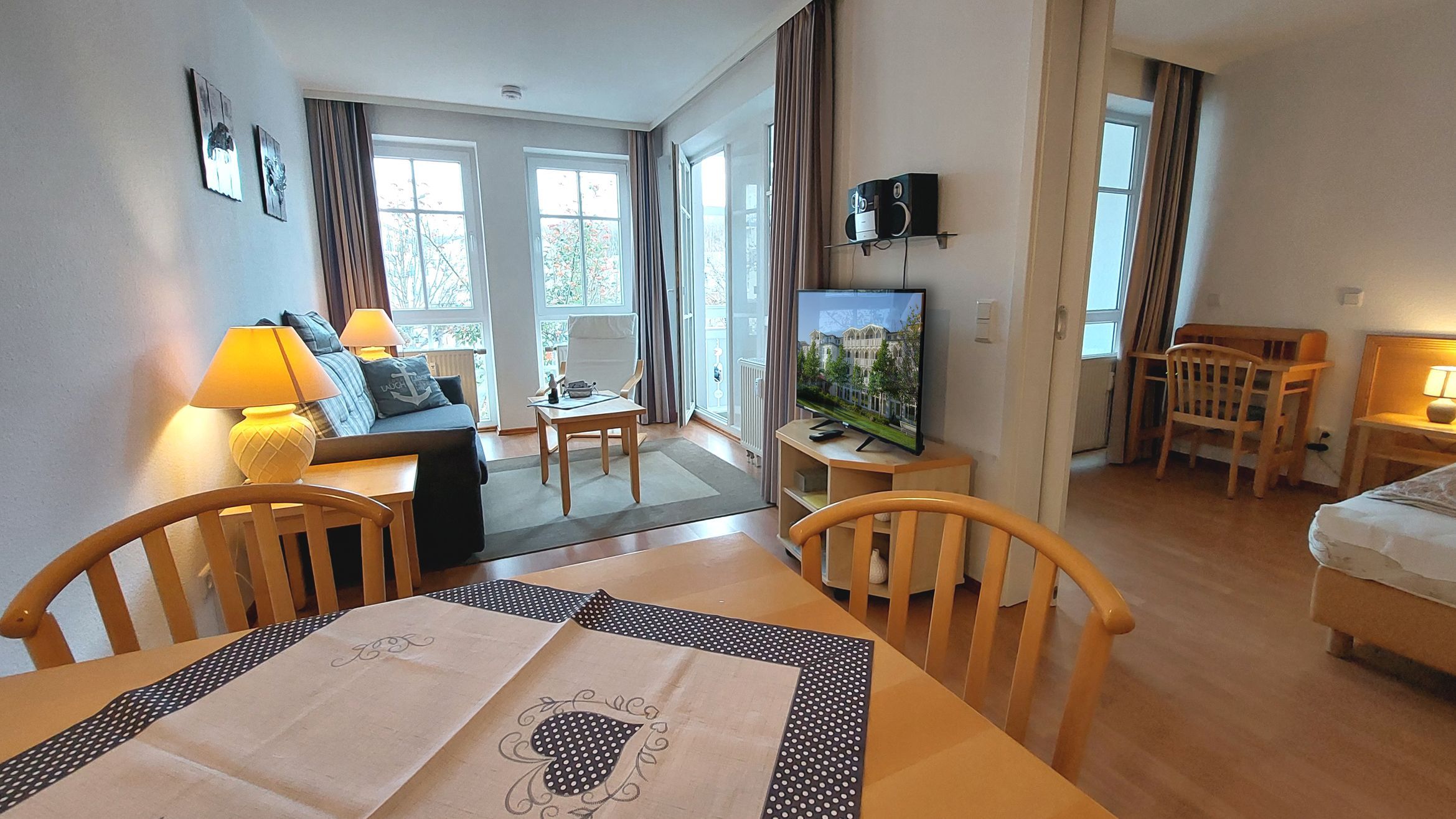 Das Wohn- und Esszimmer bildet das Herzstück der Wohnung und ist mit einer ausklappbaren Couch, Couchtisch, Sessel, einem Flachbild-TV, Radio, Stereoanlage mit CD-Player, Esstisch und einem angrenzenden Balkon ausgestattet. Eine kostenfreie WLAN-Verbindung ist vorhanden. Die moderne Einbauküche ist komplett ausgestattet und verfügt unter anderem über einen Geschirrspüler, einen Kühlschrank mit Gefrierfach, eine Mikrowelle, ein 2-Platten-Cerankochfeld sowie einen Toaster, eine Kaffeemaschine, einen Eierkocher und einen Wasserkocher.