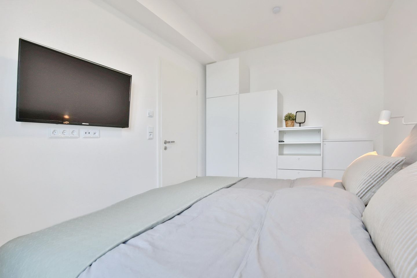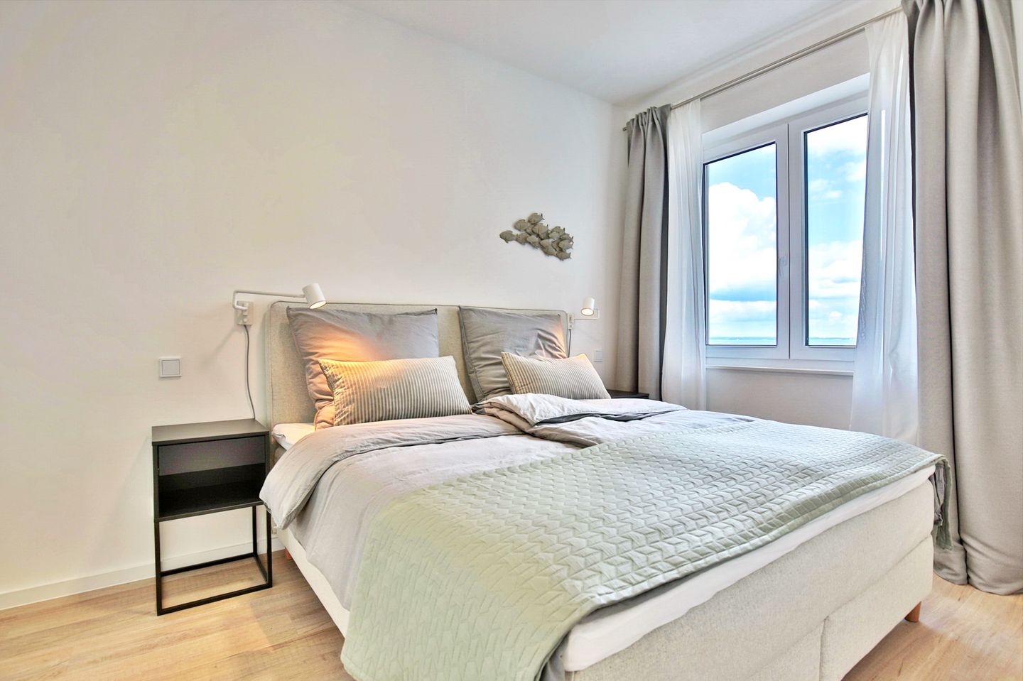 Ausgehend vom Wohnungsflur gelangen Sie in das Schlafzimmer, welches mit einem Boxspringbett, einer Kommode, ausreichend Stauraum für Ihre Kleidung und einem Fernsehgerät ausgestattet ist. Auch von hier aus sehen Sie die Weiten des Meeres.