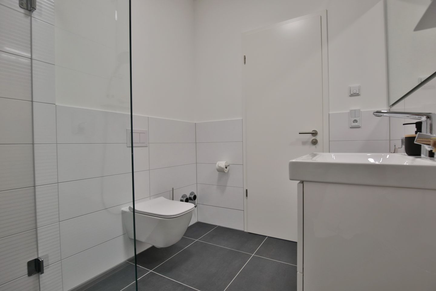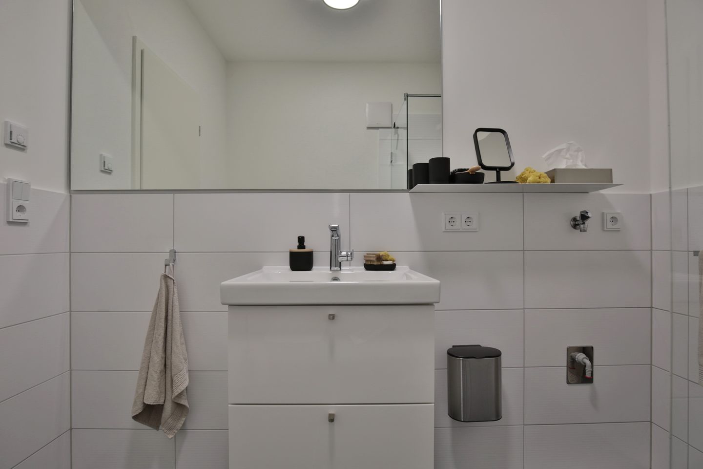 Das Badezimmer mit Tageslicht verfügt über eine ebenerdige Dusche mit Glasfront, einen großzügigen Waschtisch und genügend Stauraummöglichkeiten für Ihre Hygieneartikel.
