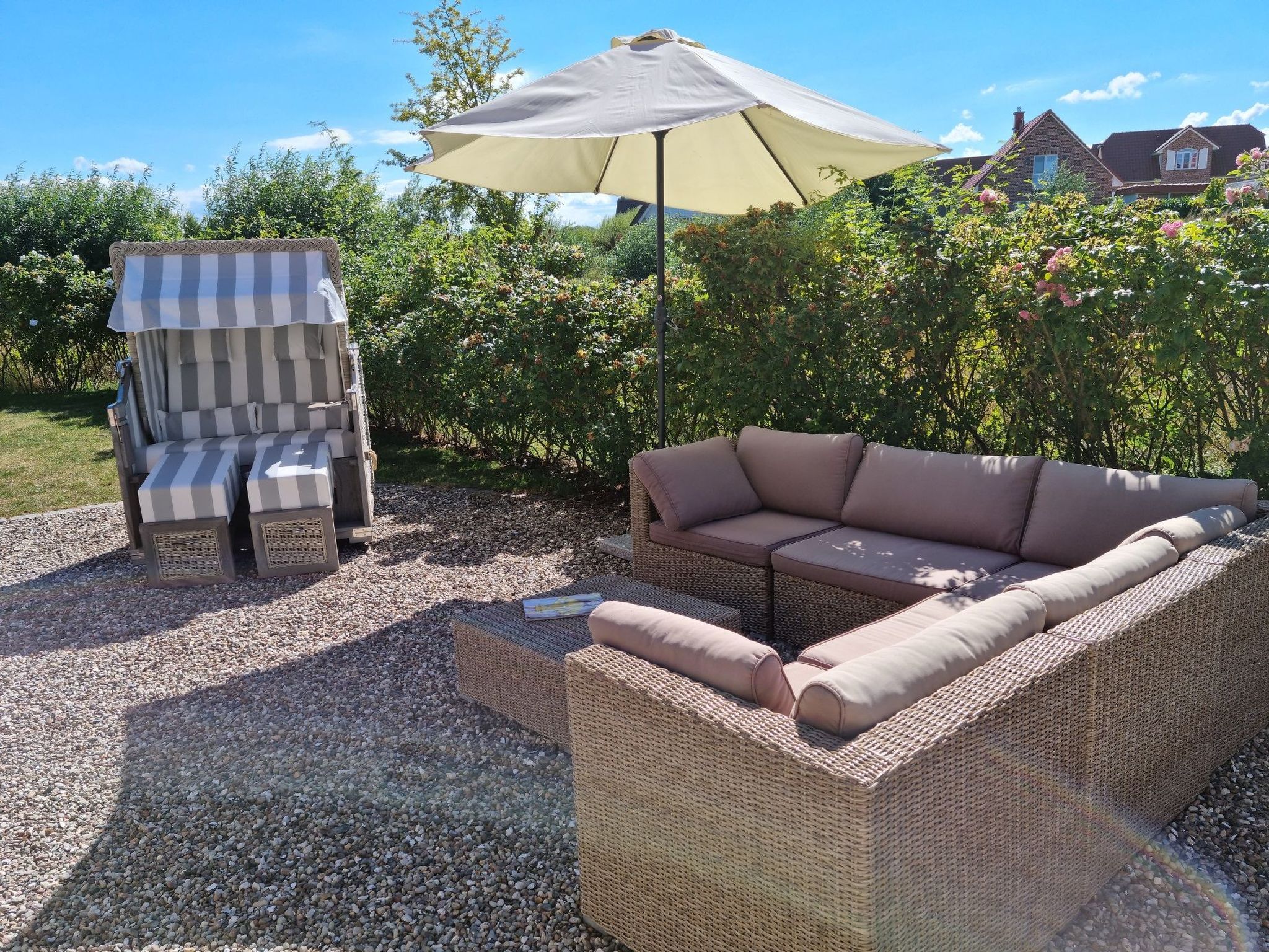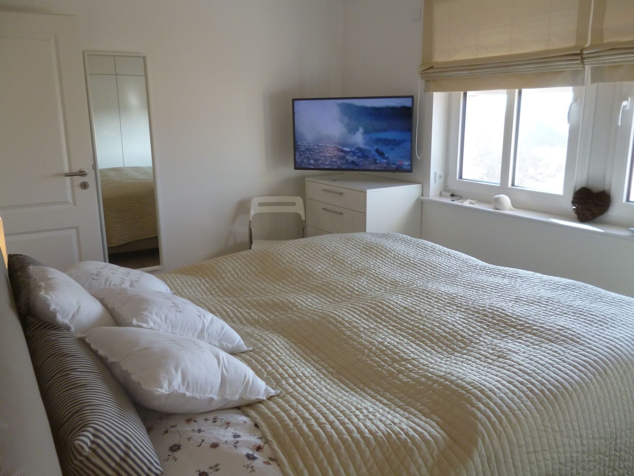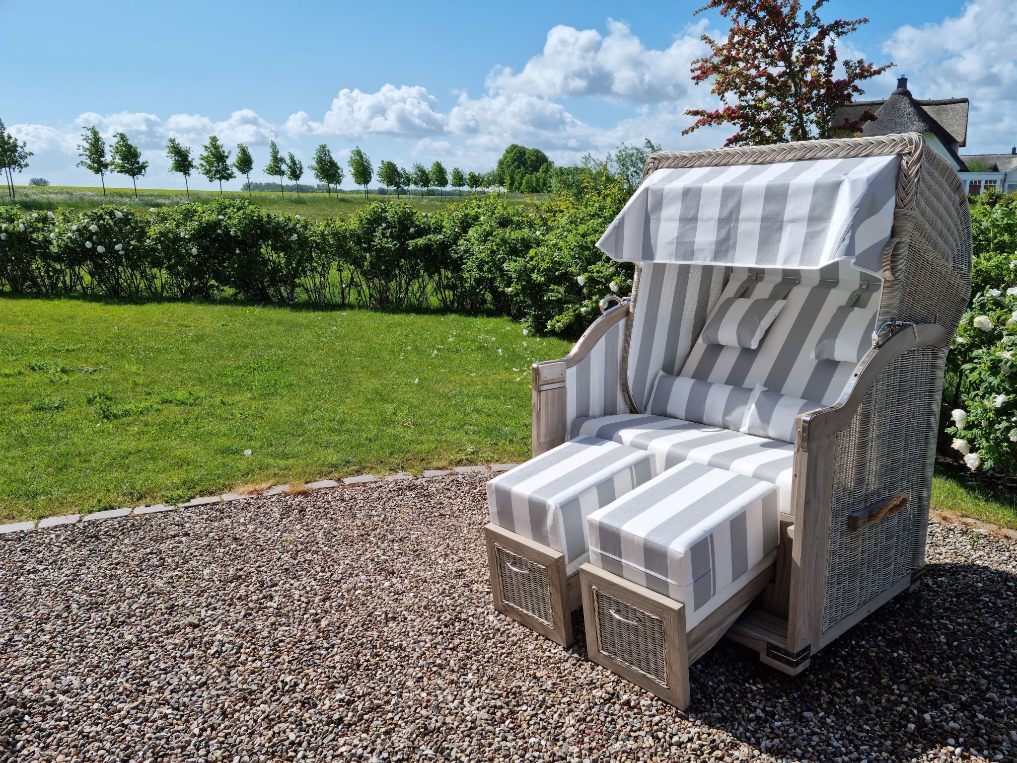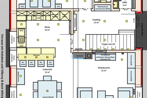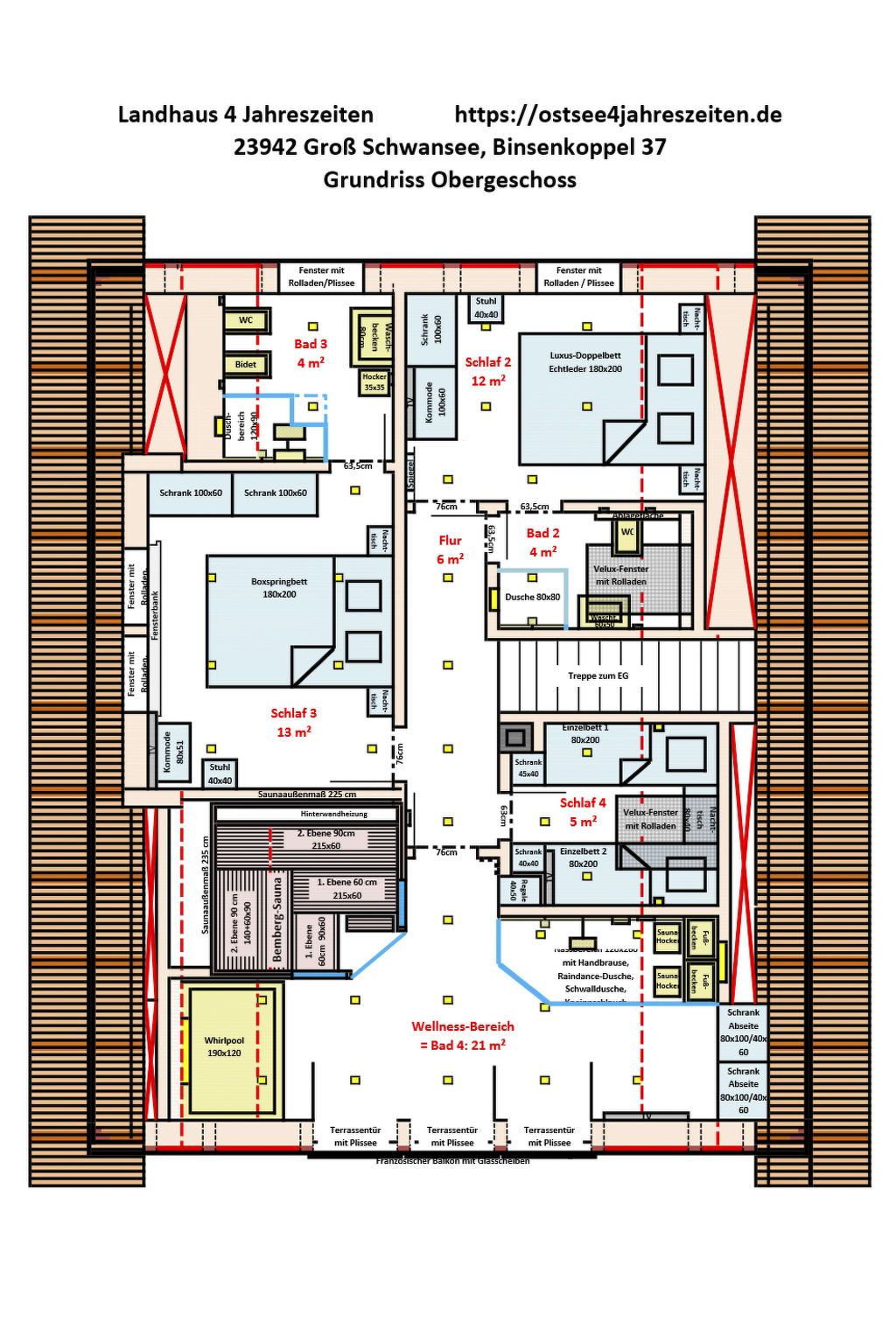 Wellness-Landhaus***** Luxus, Sauna, 2xWhirlpools, Dampfbad, Kamin, Boxspringb., Bäder en suite, WLAN Das Landhaus 4 Jahreszeiten liegt in Groß Schwansee auf einem 1.000m² großen Traumgrundstück inmitten von bunten Blumenwiesen und goldgelben Raps- und Getreidefeldern. Die Ostsee liegt in Sichtweite und der Strand ist nur wenige Gehminuten entfernt. Groß Schwansee liegt an der Ostsee zwischen Travemünde (10km) und Boltenhagen (15km), inmitten der unberührten Mecklenburger Landschaft mit herrlichem Natursandstrand, Wiesen und Feldern. Das Landhaus 4 Jahreszeiten ist bestens eingerichtet für Ihre Erholung! Das ruhig gelegene, moderne Fachwerkhaus wurde 2017 erbaut, hochwertig eingerichtet und mit viel Liebe zum Detail und Charme dekoriert. Der Fokus liegt darauf, Ihren Urlaub so komfortabel und angenehm wie möglich zu gestalten. Es soll Ihnen in dieser schönen Zeit an nichts fehlen. Der Deutsche Tourismus Verband hat unser Landhaus 2023 erneut für 8 Personen mit sehr gutem Ergebnis klassifiziert und mit 5 Sternen ausgezeichnet!!! Gruppen mit bis zu 16 Personen finden hier und in unserem zweiten baugleichen Landhaus auf demselben Grundstück Platz. Im Prüfbericht bescheinigt uns der DTV: Ein sehr exklusives Haus mit viel Liebe zum Detail, super Einrichtung, eigener Wellnessbereich, hochwertig eingerichtet - einfach toll. Schöne Außenanlage mit Außenpool, Lounge-Möbeln und Spielplatz. Auf insgesamt 150 m², die sich über zwei Etagen erstrecken, haben Sie die Möglichkeit mit bis zu 8 Erwachsenen und 2 Kleinkindern zu wohnen. Es gibt insgesamt 8 Betten in vier Schlafzimmern, eins im Erd- und drei im Obergeschoss. Drei Schlafzimmer haben direkt angrenzende „En-Suite-Badezimmer“. Zwei der Schlafzimmer, jeweils eins im OG und eins im EG, sind mit luxuriösen Boxspringbetten (180 cm x 200 cm) ausgestattet. Im dritten Schlafzimmer schlafen Sie auf einem komfortablen Doppelbett (180 cm x 200 cm) in Echtleder mit verstellbaren Kopfteilen. Das vierte, kleine Schlafzimmer besitzt zwei bequeme Einzelbetten (90 cm x 200 cm). Hier fühlen sich besonders Kinder und Jugendliche wohl. Das Aufstellen von Kinderbetten ist in den Schlafzimmern 1-3 möglich. Alle Schlafzimmer sind geschmackvoll dekoriert und mit geräumigen Kleiderschränken, Nachttischen mit Leselampen, Safes, Außenjalousien und SMART-TVs ausgestattet. Bei bis zu 4 Personen stehen Ihnen 2 Schlafräume zur Verfügung, bis zu 6 Personen 3 Schlafräume und bis zu 8 Personen 4 Schlafräume. Einzelbelegung ist mit Aufpreis möglich. Sollten 9 oder 10 Personen >3 Jahre untergebracht werden müssen, können wir bis zu 2 Gästebetten im Wohnraum oder Wellnessbereich aufstellen. Die 3 modernen En-suite-Badezimmer verwöhnen mit ebenerdigen und stufenlosen Duschbereichen mit Rainduschen, eleganten Glaswänden und beleuchteten Ablagefächern. Die V&B-Waschtische mit Unterschränken sowie weitere Ablagen bieten Ihnen viel Platz für Ihre Bad- und Kosmetikaccesoires. In zwei Bädern befindet sich ein Bidet. Exklusive beleuchtete Badspiegel, Kosmetikspiegel und Bluetooth-Radios sind hier weitere Highlights. Der Wohn- und Essbereich bietet mit seinen 50 m² genügend Platz für die ganze Familie oder größere Gruppen. An dem großen Eichen-Esstisch mit bequemen Armlehnstühlen und Platz für 8-10 Personen sowie im gemütlichen Wohnbereich, ausgestattet mit hochwertigen Sofas mit 8 Sitzplätzen, lassen sich entspannte Stunden verbringen. Für die perfekte Wohlfühl-Atmosphäre sorgt die Fußbodenheizung und der Gas-Kamin, der optional buchbar ist. Eine hochwertige Samsung/Marantz/Elac-Heimkino-Anlage mit 55-SMART-TV, Blu-Ray-Player und High-End-Receiver stehen Ihnen hier zur Verfügung. Im TV ist Netflix-Streaming installiert. Ebenfalls können Sie eine Playstation PS 4 sowie unser DVD- und CD-Sortiment nutzen. Eine Spielesammlung und eine Urlaubsbibliothek mit Auswahl für Groß und Klein stehen auch bereit. Wir bieten Ihnen hier weiterhin ein Weindepot mit erlesenen internationalen Weinen zu moderaten Preisen. Die offene moderne Küche mit Bartresen ist komplett und sehr hochwertig ausgestattet. Hier finden Sie alles, um Ihren Aufenthalt so angenehm wie möglich zu gestalten: eine Kühl- Gefrierkombination, Cerankochfeld mit Dunstabzugshaube, Geschirrspülmaschine und Backofen. Für Ihren Kaffeegenuss wählen Sie zwischen einem SAECO-Kaffeevollautomaten mit integriertem Milchbehälter für 6 Kaffeespezialitäten und einer Filterkaffeemaschine. An Elektrogeräten stehen Toaster, Eierkocher, Wasserkocher, Küchenmaschine und ein Mixer zur Nutzung bereit. Ein großes Pfannen- und Topfsortiment mit vielen Küchenutensilien ermöglichen Ihnen perfektes und angenehmes Kochen. Auch hier sorgt ein großer SMART-TV für Unterhaltung. Elegantes V&B-Geschirr, Silberbesteck und ein hochwertiges Gläser-Sortiment sorgen für den perfekt gedeckten Tisch. Ein absolutes Highlight des Hauses ist der eigene 25 m² große Indoor-Wellnessbereich im Obergeschoss mit tollem Weitblick über Wiesen und Felder. Genießen Sie die Ruhe in der großen Sauna mit Glasfront für sechs Personen, dem Klima-Dampfbad und einem Innen-Whirlpool 190 cm x 120 cm für 2 Personen. Nach dem wohltuenden Saunagang können Sie sich unter der Regendusche sowie mit dem Kneippschlauch abkühlen, um sich danach in den zwei Kneipp-Fußbadebecken oder in den Liegestühlen vor dem großen SMART-TV zu entspannen. Zur sportlichen Betätigung nutzen Sie gerne unsere Fitnessgeräte: einen Crosstrainer, eine Sit-up-Bank, Hanteln und eine Gymnastikmatte. ACHTUNG: der Indoor-Wellnessbereich muss zusätzlich gebucht werden. Es können leider keine Einzelleistungen gebucht werden. Die Buchung kann nur für den gesamten Reisezeitraum erfolgen. Im Haus gibt es eine eigene Telefonanlage, mit der Sie kostenfrei in alle deutschen Netze telefonieren können. Im Hauswirtschaftsraum stehen Ihnen eine Waschmaschine und ein Trockner kostenlos zur Verfügung. Vom Wohn- und Essbereich gelangen Sie direkt 