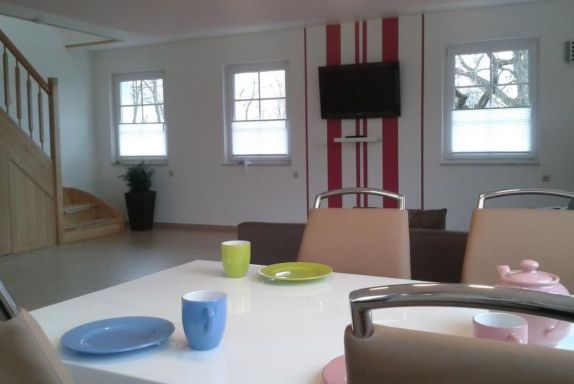 Diese Ferienwohnung für maximal sechs Personen liegt im schönen Johannstorf, zwischen Dassow und Pötenitz. Es handelt sich um ein Haus mit insgesamt vier Ferienwohnungen, in schöner Alleinlage. Zum Strand sind es nur rund viereinhalb Kilometer. Es ist in der Nachbarschaft zu Travemünde. Die gemeinschaftliche Terrasse ist mit Gartenmöbeln ausgestattet. Diese Wohnung verfügt über drei Zimmer, zwei Schlafzimmer und eine 45qm große Wohnküche, verteilt auf zwei Etagen. Die Wohnküche und das Bad befinden sich im Erdgeschoss. Die Wohnküche ist ausgestattet mit einer Wohnlandschaft mit Schlaf- funktion, 1,40 breit, mit Tisch und Stühlen für vier Personen und einer komplett eingerichteten Einbauküche. Diese Ferienwohnung bietet zum Beispiel einen Backofen, einen Kühlschrank mit Gefrierfach, einen Geschirrspüler, ein Ceranfeld, eine Kaffemaschine, einen Toaster, einen Wasserkocher und und und.... Da in der Wohnküche viele Fenster sind, ist diese sehr hell und freundlich mit einem schönen Blick auf Wiesen und Felder. Im Obergeschoss gibt es zwei Schlafzimmer und ein Gäste-WC. In den Schlafzimmern gibt es jeweils ein Doppelbett (1,80m breit) mit Schlafzimmerschrank. Die Wohnküche und das Bad sind ausgestattet mit einer Fußbodenheizung. Die Wohnung liegt zentral zum Umfeld, so das es nur sechs Kilometer nach Travemünde sind, 25 km nach Lübeck, 30 km nach Wismar und etwas weiter 60 km nach Schwerin. Einkaufsmöglichkeiten sind vor Ort, eine medizinische Versorgung ist in der Nähe. Supermärkte, Restaurants, Ausgehmöglichkeiten sind gegeben und in vier Kilometer zu erreichen. Kinder bis 12 Jahre sind selbstverständlich kostenfrei. Bitte weisen Sie bei einer Buchung darauf hin. Auf Anfrage können bei Bedarf Babybett und Hochstuhl bereitgestellt werden. Motorradfahrer sind sehr gerne willkommen. Basisinformationen - Erlaubte Haustiere: keins - Unterkunftstyp: Ferienwohnung - befindet sich in: Anlage - Art d. Wohnung: Einliegerwohnung - Art d. Gebäudes: Mehrparteienhaus - Etage, auf der sich das Objekt befindet: EG - Gesamtanzahl d. Stockwerke im Gebäude über EG: 2 - letzte umfassende Renovierung: 2013 - Anbieter wohnt auf dem Grundstück - Nichtraucherunterkunft - Höhe über dem Meeresspiegel: 17 - Schlafzimmeranzahl: 2 - Badezimmeranzahl: 2 Top Merkmale - WLAN - Klimaanlage: keine - Heizung: überall - Fußbodenheizung: teilweise - Terrasse - Garten: zur gemeinschaftlichen Nutzung - komplett eingefriedet (mit Mauer, Zaun oder Hecke) - Private PKW-Stellplätze insgesamt für diese Unterkunft: 2 - ㄴ davon Garagenstellplätze: keinen - ㄴ davon Carport-Stellplätze: keinen - ㄴ davon private Außenstellplätze: 2 Schlafen im Wohnbereich - 2x Doppelbett (1,80m Breite) - Schlafsofa 2 Personen - Kinder-/Babybett Schlafzimmer 1 - Doppelbett (1,80m Breite) Schlafzimmer 3 - Doppelbett (1,80m Breite) Badezimmer Badezimmer 1 - Dusche - Waschbecken - Toilette - Beheizbarer Handtuchhalter Badezimmer 3 - Waschbecken - Toilette - Beheizbarer Handtuchhalter Sanitäre Einrichtungsgegenstände in der Ferienunterkunft - Dusche - Toilette - Föhn Kochen/Wohnen - Kaffeemaschine: Kaffeemaschine - Kühl-/Gefrierschrank: Gefrierfach, Tiefkühlschrank, Kühlschrank - Herd: Herd - Dunstabzugshaube - Backofen - Toaster - Wasserkocher - Spülmaschine - Anzahl Esstische: keine - Gesamtzahl Sitzplätze: keine Entertainment - Fernseher: TV - Musikanlage - Radio - CD-Player Für Kinder - Kinderstuhl Hauswirtschaft - Waschmaschine: zur gemeinschaftlichen Nutzung im Gebäude - Bügeleisen - Staubsauger - Rauchmelder Nachhaltigkeit - Solarenergie - Solarthermie (Wassererwärmung) - Photovoltaikanlage - Hausisolierung - Isoliertes Dach Außenbereich - Outdoormöbel Umgebung - Lebensmittelhandel: 3,0 km - Bars/Clubs/Ausgehen: 6,0 km - Cafés/Restaurants: 3,0 km - Bahnhof: 8,0 km - Flughafen: 50,0 km - nächste Haltestelle ÖPNV: 100 m - Sandstrand: 4,5 km - Meer: 4,5 km - Angelplatz: 35,0 km - Öffentliches Schwimmbad: 45,0 km - Golfplatz: 40,0 km - Reitmöglichkeit: 4,0 km