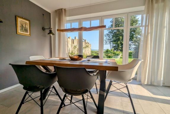Das Haus liegt am Ufer des Boddens mit unverbaubarem Blick auf die weiten Wasserflächen des Boddens. Es liegt am Ende eines Privatweges, ca. 60 Meter entfernt von der Straße 'Bauernreihe'. Zur Gaststätte 'Kum rin' gehen Sie 60 Meter, zum Kinderbadestrand und zum Wiecker Hafen 300 Meter. Zur Ostsee sind es 5 km. Idealerweise fahren Sie mit dem Fahrrad den ausgeschilderten und gut befestigten Fahrradweg entlang und werfen dabei mehrere Blicke auf die weiten Wiesenflächen, auf denen Rinder weiden und im Frühjahr und Herbst viele Zugvögel rasten. Der nach Süden ausgerichtete Terrassenbereich bietet ausreichendes Sitzmobiliar für alle Bewohner des Hauses. Von der Terrasse haben Sie einen phantastischen Blick ins Grüne und auch auf den Bodden. Das Haus ist ruhig gelegen, da es ca. 60 m zurückversetzt von der Straße „Bauernreihe“ am Ende eines Privatweges errichtet wurde. Die Doppelhaushälfte Luv ist nach Süd-Westen ausgerichtet. Google/Maps erlaubt eine gute Übersicht über die 'Lage'. Das Ferienhaus Luv wurde zum Jahresende 2019 bezugsfertig. Lee und Luv sind die beiden Haushälften eines Doppelhauses, daher sind sie baugleich und auch gleich eingerichtet. Luv verfügt über eine Wohnfläche von 115qm, über 3 Schlafzimmer mit insgesamt 6 Betten und 2 Bädern. Die Einbauküche umfasst einen Küchenblock mit Kühl-Gefrierkombination, Backofen, Spülmaschine, Mikrowelle, Kaffeemaschine, Toaster etc. Eine Kochinsel mit vier Induktionskochfeldern und vielen Schubfächern für Vorräte usw. komplettiert die Küche. Im Wohnzimmer laden ein 3-sitziges Sofa, ein 1,5-sitziger Ohrensessel und zwei Cocktailsessel zum Verweilen ein. Das Ferienhaus wurde mit viel Liebe zum Detail eingerichtet - schließlich sollen Sie sich als Gast pudelwohl fühlen! Highlight ist der freie Blick auf die weiten Wasserflächen des Boddens, vom Esszimmer und dem Ruheraum im Obergeschoß. Nach langen Ausflügen können Sie den Tag in kuscheliger Wärme der Sauna und im Ruheraum ausklingen lassen. Der Blick auf den Bodden und in die Natur wirkt beruhigend. Er lässt Sie den Alltagsstress vergessen. Sie können dort auch in harmonischer Zweisamkeit Pläne für den nächsten Tag schmieden. Die Nutzung der Sauna können Sie über ein Münzgerät aktivieren.30 Minuten kostet eine Zwei-E u r o-Münze. Für den Betrieb des Saunaofens benötigen Sie zwei E u r o Münzen. Sie erreichen nach 30-minütigem Betrieb des Saunaofens eine Temperatur von ca. 45 Grad, die im Laufe der nächsten 30 Minuten auf ca. 65 Grad steigt. Manche Saunagänger mögen diese Temperatur für zu gering erachten. Wir halten sie für ausreichend und haben mehr Wert gelegt auf eine komfortable Größe der Sauna und einen Ruheraum mit toller Aussicht. Wir bitten unsere Gäste eigene Saunatücher und Bademäntel mitzubringen. Diese - und auch andere Wäscheteile - können Sie in der Waschmaschine waschen, anschließend auf dem Wäscheständer aufhängen und trocknen lassen. Der Nationalpark Vorpommersche Boddenlandschaft, der am Ortsrand von Wieck beginnt, schützt Flora und Fauna. Beeindruckende Eindrücke vom Nationalpark erhalten Sie bei einem Gang rund um den Leuchtturm in Prerow, am nördlichen Ende der Halbinsel. Nördlich von Wieck liegt – in fußläufiger Entfernung - einer der größten Kranichrastplätze Europas. Mehr als 40.000 dieser Zugvögel bieten in Frühjahr und Herbst ein einzigartiges Naturschauspiel. Boddenblick, Sauna - großzügig geschnitten & mit tollem Ausblick, Badewanne, stilvolle Einrichtung, 3 Schlafzimmer, 3 Parkplätze, abschließbares Holzhäuschen für Fahrräder mit Lademöglichkeit für E-Bikes. E-Auto an Haushaltssteckdose laden ist nicht erlaubt. Die lange Ladezeit belastet das häusliche Stromnetz dauerhaft, das dafür nicht ausgelegt ist. Bei dieser starken Belastung kann es zum Kurzschluss oder sogar einem Brand kommen. Internet: Das Ferienquartier verfügt über einen kostenlosen und frei zugänglichen Internetzugang. Der Vermieter übernimmt keine Haftung für die einwandfreie Funktion der Geräte sowie der Leistung des Providers. Schadensersatzansprüche wegen einer störungsanfälligen oder 'langsamen' Verbindung sind ausgeschlossen. Die Gäste sind verantwortlich für alle Aktivitäten im Internet während der vereinbarten Mietzeit. Basisinformationen - Erlaubte Haustiere: keins - Art d. Gebäudes: Doppelhaushälfte - Gesamtanzahl d. Stockwerke im Gebäude über EG: 1 - Grundstücksfläche: 486 m² - Baujahr: 2019 - keine Gruppenbuchung - keine Jugendgruppen - Nichtraucherunterkunft - Schlafzimmeranzahl: 3 - Badezimmeranzahl: 2 Top Merkmale - WLAN - Heizung: überall - Terrasse - Garten: zur alleinigen Nutzung - Private PKW-Stellplätze insgesamt für diese Unterkunft: 3 - ㄴ davon Garagenstellplätze: keinen - ㄴ davon Carport-Stellplätze: keinen - ㄴ davon private Außenstellplätze: keinen Schlafen Schlafzimmer 1 - Doppelbett (1,80m Breite) Schlafzimmer 3 - Doppelbett (von 1,51 m bis 1,79 m Breite) Schlafzimmer 5 - 2x Einzelbett Badezimmer Badezimmer 1 - Dusche - Föhn Badezimmer 3 - Dusche - Badewanne - Föhn Kochen/Wohnen - Kaffeemaschine: Filter-Kaffeemaschine - Kühl-/Gefrierschrank: Tiefkühlschrank, Kühlschrank - Herd: Induktionsherd - Backofen - Toaster - Mikrowelle - Wasserkocher - Spülmaschine - Anzahl Esstische: 1 - Gesamtzahl Sitzplätze: 6 - Anzahl Wohnzimmer: 1 Entertainment - Fernseher: Sat.-TV Für Kinder - Kinderstuhl Hauswirtschaft - Waschmaschine: zur alleinigen Nutzung im Objekt - Bügeleisen - Staubsauger Nachhaltigkeit - Hausisolierung Umgebung - Aussicht: Meer/See - nächstgelegene Ortsmitte: 1,0 km - Lebensmittelhandel: 5,0 km - Cafés/Restaurants: 200 m - Bahnhof: 18,0 km - Flughafen: 50,0 km - Autobahn: 45,0 km - Hafen: 300 m - nächste Haltestelle ÖPNV: 1,0 km - Strand: 5,0 km - Hundestrand: 700 m - Grasstrand: 300 m - Sandstrand: 300 m - Wasser (Meer, See etc.): 300 m - Meer: 5,0 km - See: 300 m - Anlegeplatz: 300 m - Öffentliches Schwimmbad: 25,0 km - Fahrrad-V