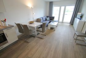 Geschmackvoll eingerichtete barrierefreie zwei Zimmer Parterre-Ferienwohnung mit Strandkorb auf der Terrasse, nur 100 Meter vom Strand entfernt. Sie verfügt über ein Schlafzimmer, Wohn-/Esszimmer mit Sofa und mit offener Küche und direktem Zugang zur Südterrasse. Alles auf einer Ebene wurde für Sie mit viel Liebe eingerichtet. Duschbad und Abstellraum vervollständigen die Ausstattung der Wohnung. Der Waschtrockner steht Ihnen im Technikraum des Haus kostenfrei zur Verfügung. Hier wird Ihr Urlaubstraum wahr. Jede Wohnung verfügt über einen eigenen PKW-Stellplatz direkt am Haus. Genießen Sie die Gemütlichkeit und allen Komfort, den diese Ferienwohnung bietet.