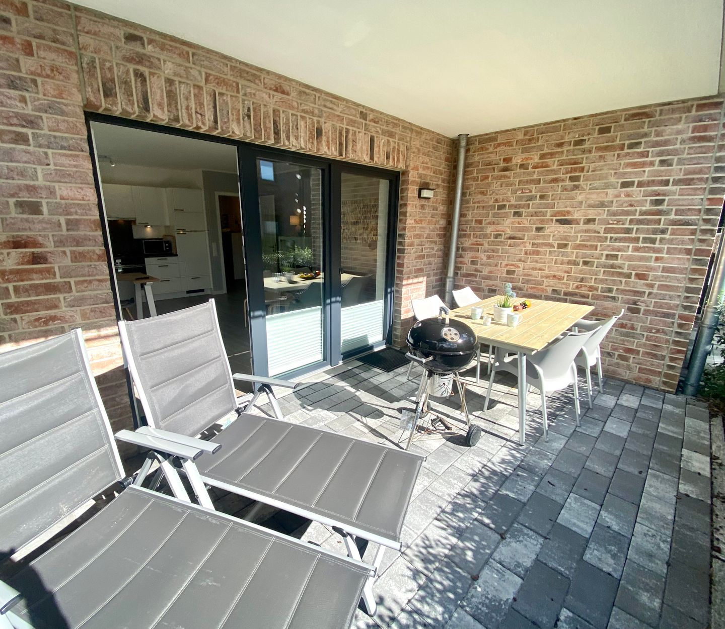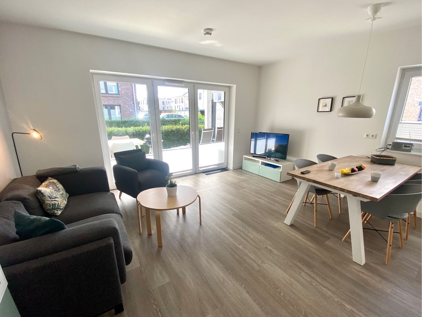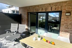 Es erwartet Sie eine bestens ausgestattete Wohnküche mit anschließendem Ess- und Wohnbereich mit Blick auf die möblierte Terrasse ( teilweise überdacht) und den Garten. Die Wohnung verfügt zudem über ein Schlafzimmer mit Doppelbett (2 x 80x200 cm) und ein Schlafzimmer mit zwei Einzelbetten (90x200 cm). Im großzügigen Badezimmer mit Fenster finden Sie ebenerdige Dusche, Waschbecken, Toilette und eine Waschmaschine.