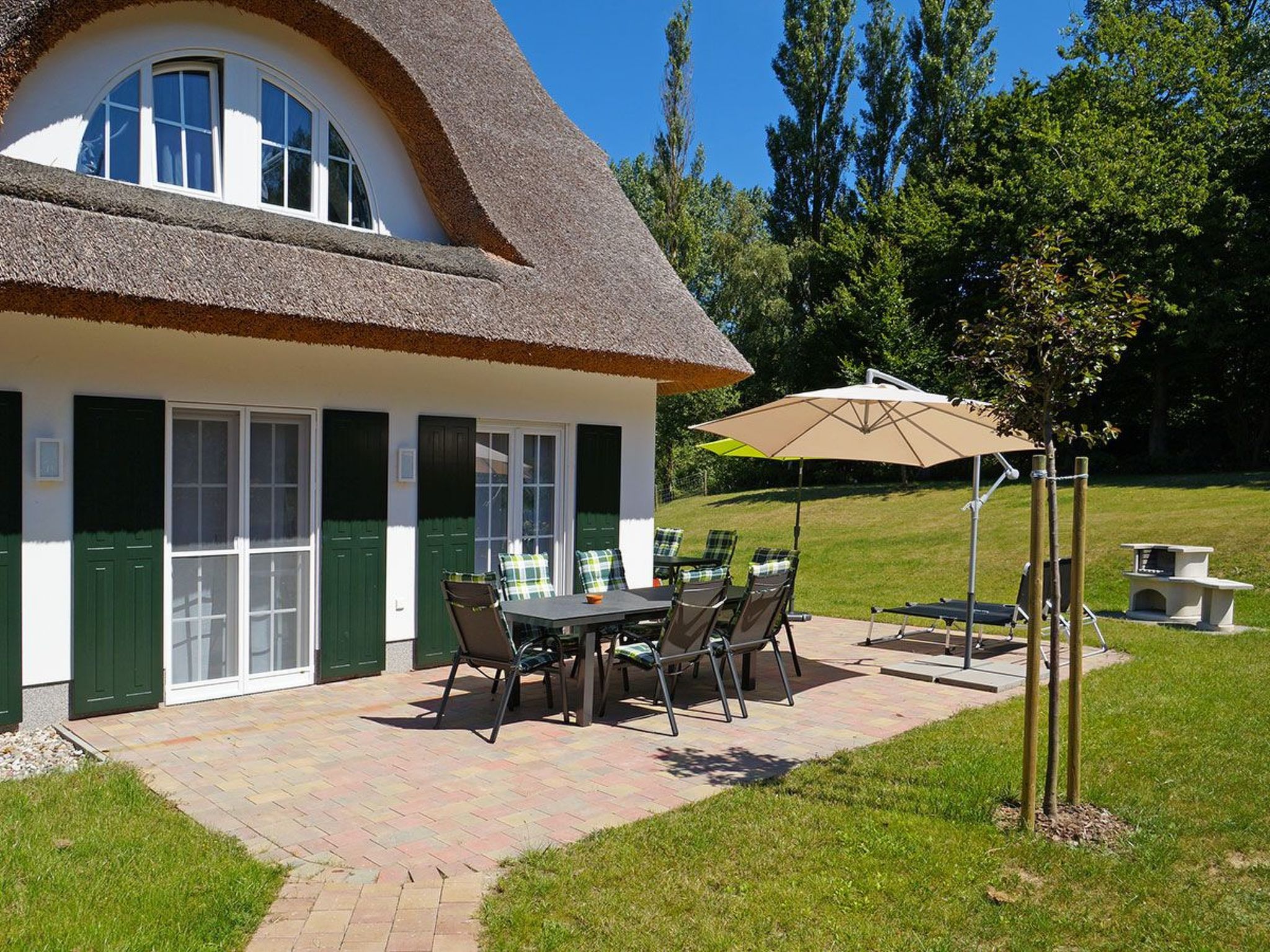 Entdecken Sie das bezaubernde Reetdachhaus Leda in Glowe, einem malerischen Ort an der Ostseeküste. In dieser idyllischen Ferienoase finden bis zu 10 Personen in fünf gemütlichen Schlafzimmern komfortabel Platz. Das freistehende Ferienhaus ist die perfekte Wahl für Urlauber, die Wert auf Privatsphäre und eine umfangreiche Ausstattung legen. Ob mit Familie, Freunden oder Ihren vierbeinigen Begleitern – hier genießen Sie unvergessliche Urlaubsmomente in unmittelbarer Nähe zum Strand und zur lebendigen Ortsmitte von Glowe. Das Innere des Ferienhauses vermittelt mit seiner durchdachten Ausstattung sofort ein Gefühl von Wärme und Zuhause. Dank der Fußbodenheizung in allen Räumen herrscht auch an kühleren Tagen eine behagliche Atmosphäre. Für zusätzliche Gemütlichkeit sorgt der Kamin, der gerade in den Abendstunden zum Verweilen einlädt. Eine Waschmaschine steht Ihnen zur alleinigen Nutzung bereit, was vor allem bei einem längeren Aufenthalt äußerst praktisch ist. Auch für Unterhaltung ist mit Stereoanlage, DVD-Player und LCD-Fernseher gesorgt. Der Außenbereich des Hauses lädt mit seiner großen, nach Südosten ausgerichteten Terrasse zum Entspannen im Freien ein. Der komplett eingezäunte Garten garantiert nicht nur die Sicherheit Ihrer Kinder, sondern auch der mitreisenden Hunde. Hier können Sie die Zeit unbeschwert genießen, während Ihre Hunde frei herumlaufen. Drei PKW-Stellplätze sorgen für ausreichend Parkmöglichkeiten und im geräumigen Gartenhaus finden Sie genügend Stauraum. Der Abenteuerspielplatz im alten Baumbestand bildet das Highlight für unsere jüngsten Gäste und macht das Reetdachhaus Leda zu einem Paradies für Familien. Die Lage in Glowe verbindet nahtlos den Charme der Ostseeküste mit der Lebendigkeit eines Ferienortes. Nur wenige Gehminuten trennen Sie vom feinsandigen Strand, dem erfrischenden Meer und vielseitigen Wassersportangeboten. Auch der Hundestrand befindet sich in angenehmer Nähe, was dieses Haus besonders attraktiv für Hundebesitzer macht. Für den täglichen Bedarf erreichen Sie den nächsten Lebensmittelhandel und die Ortsmitte innerhalb von 500 Metern. Diese günstige Lage macht es Ihnen leicht, den Alltag hinter sich zu lassen und voll und ganz in das Urlaubsfeeling einzutauchen. Im Reetdachhaus Leda erwartet Sie eine unvergleichliche Auszeit mit allem, was das Herz begehrt. Genießen Sie die einmalige Kombination aus Komfort, Natur und der Nähe zum Meer. Hier können Sie abschalten, sich entspannen und wertvolle Zeit mit Ihren Liebsten verbringen. Freuen Sie sich auf einen unvergesslichen Aufenthalt in Glowe, wo das Reetdachhaus Leda als Ihr Zuhause fernab der Heimat darauf wartet, entdeckt zu werden. Basisinformationen - Erlaubte Haustiere: 2 - erlaubte Hundegröße: groß (über 60 cm) - befindet sich in: Ferienpark - Art d. Gebäudes: Einfamilienhaus - Gesamtanzahl d. Stockwerke im Gebäude über EG: 2 - Grundstücksfläche: 700 m² - Baujahr: 2012 - freistehend - keine Einsicht von der Straße - Nichtraucherunterkunft - Höhe über dem Meeresspiegel: 33 - Schlafzimmeranzahl: 5 - Badezimmeranzahl: 2 Top Merkmale - WLAN - Heizung: überall - Fußbodenheizung: überall - Terrasse - Garten: zur alleinigen Nutzung - komplett eingefriedet (mit Mauer, Zaun oder Hecke) - hundesicher durch einen Zaun (komplett eingezäunt) - Private PKW-Stellplätze insgesamt für diese Unterkunft: 2 - ㄴ davon Garagenstellplätze: keinen - ㄴ davon Carport-Stellplätze: keinen - ㄴ davon private Außenstellplätze: 2 Schlafen Schlafzimmer 1 - 2x Doppelbett (1,80m Breite) - Kinder-/Babybett Schlafzimmer 3 - 2x Doppelbett (1,80m Breite) Schlafzimmer 5 - 2x Einzelbett Schlafzimmer 7 - 2x Einzelbett Schlafzimmer 9 - 2x Einzelbett Badezimmer Badezimmer 1 - Dusche - Waschbecken - Toilette Badezimmer 3 - Badewanne - Waschbecken - Toilette Gäste-WC - Waschbecken - Toilette Wellness - Sauna Kochen/Wohnen - Kaffeemaschine: Kaffeemaschine - Kühl-/Gefrierschrank: Tiefkühlschrank, Kühlschrank - Herd: Herd - Dunstabzugshaube - Backofen - Toaster - Mikrowelle - Wasserkocher - Spülmaschine - Anzahl Esstische: 1 - Gesamtzahl Sitzplätze: 10 - Anzahl Wohnzimmer: 1 - Kamin Entertainment - Fernseher: TV, Sat.-TV - Musikanlage - Radio - Gesellschaftsspiele für Erwachsene Für Kinder - Kinderstuhl - Gesellschaftsspiele für Kinder Hauswirtschaft - Waschmaschine: zur alleinigen Nutzung im Objekt - Staubsauger Nachhaltigkeit - Abfallrecycling - Wassersparende Geräte - Hausisolierung Außenbereich - Grill: Grill Umgebung - nächstgelegene Ortsmitte: 500 m - Lebensmittelhandel: 500 m - Bars/Clubs/Ausgehen: 1,5 km - Cafés/Restaurants: 500 m - Bahnhof: 20,0 km - Flughafen: 50,0 km - Autobahn: 15,0 km - nächste Haltestelle ÖPNV: 500 m - Strand: 774 m - Hundestrand: 1,0 km - Sandstrand: 774 m - Wasser (Meer, See etc.): 774 m - Meer: 774 m - Wassersport: 774 m - Angelplatz: 1,0 km - Spielplatz: 500 m - Golfplatz: 4,0 km - Wanderweg: 100 m Besonderheiten - Reetdachhaus