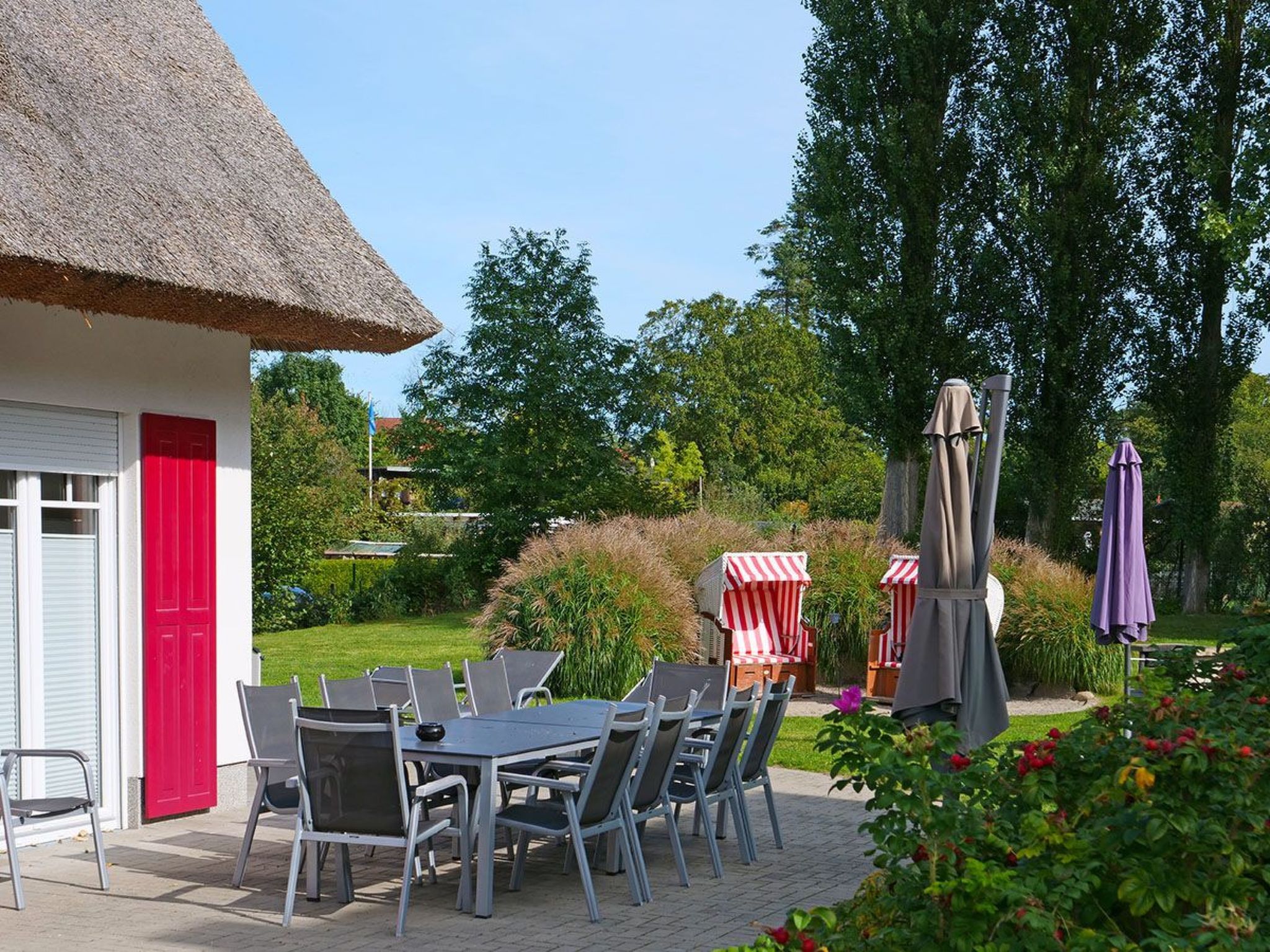 Das zauberhafte Reethaus Nixe liegt in der neu angelegten Ferienhaus-Siedlung Ostseepark Glowe, ganz in der Nähe des Ostseestrandes. Dieses prächtige Haus erhielt Anfang 2014 die begehrte Auszeichnung von 5 Sternen vom Deutschen Tourismus Verband (DTV), und das aus gutem Grund! Mit einer Wohnfläche von etwa 150 m² bietet es modernen Komfort und ist perfekt auf Familien abgestimmt. Der großzügige Wohn- und Essbereich im komplett gefliesten Erdgeschoss lädt zum Verweilen ein und öffnet sich zu zwei angrenzenden Terrassen. Im Obergeschoss erwarten Sie drei Schlafzimmer mit Doppelbetten, während das ausgedehnte Dachgeschoss zwei weitere Schlafzimmer mit Einzelbetten und ein Gäste-WC bietet. Zwei erstklassige Duschbäder, eines mit Whirlpool und TV im Obergeschoss, sorgen für erholsame Momente während Ihres Aufenthalts. Zur modernen Ausstattung gehören ein Kamin, eine Stereoanlage, DVD-Player, mehrere LCD-Fernseher, WLAN, Waschmaschine, Trockner, ein zusätzlicher Kühlschrank, ein Kinderhochstuhl und zwei Kinderreisebetten. Auf der großzügigen Terrasse in Süd-Ost-Ausrichtung können Sie sich herrlich entspannen und die Sonne genießen. Ein Strandkorb und ein Gartengrill stehen ebenfalls zur Verfügung. Für zusätzliche Entspannung sorgt die gemütliche Außensauna (Nutzung gegen Gebühr über Münzer). Zwei Parkplätze befinden sich direkt auf dem Grundstück, und auch Hunde sind herzlich willkommen. Das komplett eingezäunte Gelände bietet den Vierbeinern viel Freiraum, damit auch sie sich wie zu Hause fühlen können. Basisinformationen - Erlaubte Haustiere: 2 - erlaubte Hundegröße: groß (über 60 cm) - befindet sich in: Ferienpark - Art d. Gebäudes: Einfamilienhaus - Gesamtanzahl d. Stockwerke im Gebäude über EG: 2 - Grundstücksfläche: 700 m² - Baujahr: 2012 - freistehend - keine Einsicht von der Straße - Nichtraucherunterkunft - Höhe über dem Meeresspiegel: 33 - Schlafzimmeranzahl: 5 - Badezimmeranzahl: 2 Top Merkmale - WLAN - Heizung: überall - Fußbodenheizung: überall - Terrasse - Garten: zur alleinigen Nutzung - komplett eingefriedet (mit Mauer, Zaun oder Hecke) - hundesicher durch einen Zaun (komplett eingezäunt) - Private PKW-Stellplätze insgesamt für diese Unterkunft: 2 - ㄴ davon Garagenstellplätze: keinen - ㄴ davon Carport-Stellplätze: 1 - ㄴ davon private Außen­stellplätze: 2 Schlafen Schlafzimmer 1 - Doppelbett (1,80m Breite) - Kinder-/Babybett Schlafzimmer 3 - Doppelbett (1,80m Breite) Schlafzimmer 5 - Doppelbett (1,80m Breite) Schlafzimmer 7 - 2x Einzelbett Schlafzimmer 9 - 2x Einzelbett Badezimmer Badezimmer 1 - Dusche - Waschbecken - Toilette Badezimmer 3 - Waschbecken - Toilette Gäste-WC - Waschbecken - Toilette Wellness - Whirlpool Kochen/Wohnen - Kaffeemaschine: Kaffeemaschine - Kühl-/Gefrierschrank: Tiefkühlschrank, Kühlschrank - Herd: Herd - Dunstabzugshaube - Backofen - Toaster - Mikrowelle - Wasserkocher - Spülmaschine - Anzahl Esstische: 1 - Gesamtzahl Sitzplätze: 10 - Anzahl Wohnzimmer: 1 - Kamin Entertainment - Fernseher: TV, Sat.-TV - Musikanlage - Radio - Gesellschaftsspiele für Erwachsene Für Kinder - Kinderstuhl - Gesellschaftsspiele für Kinder Hauswirtschaft - Waschmaschine: zur alleinigen Nutzung im Objekt - Staubsauger Nachhaltigkeit - Abfallrecycling - Wassersparende Geräte - Hausisolierung Außenbereich - Grill: Grill Umgebung - nächstgelegene Ortsmitte: 500 m - Lebensmittelhandel: 500 m - Bars/Clubs/Ausgehen: 1,5 km - Cafés/Restaurants: 500 m - Bahnhof: 20,0 km - Flughafen: 50,0 km - Autobahn: 15,0 km - nächste Haltestelle ÖPNV: 500 m - Strand: 774 m - Hundestrand: 1,0 km - Sandstrand: 774 m - Wasser (Meer, See etc.): 774 m - Meer: 774 m - Wassersport: 774 m - Angelplatz: 1,0 km - Spielplatz: 500 m - Golfplatz: 4,0 km - Wanderweg: 100 m Besonderheiten - Reetdachhaus
