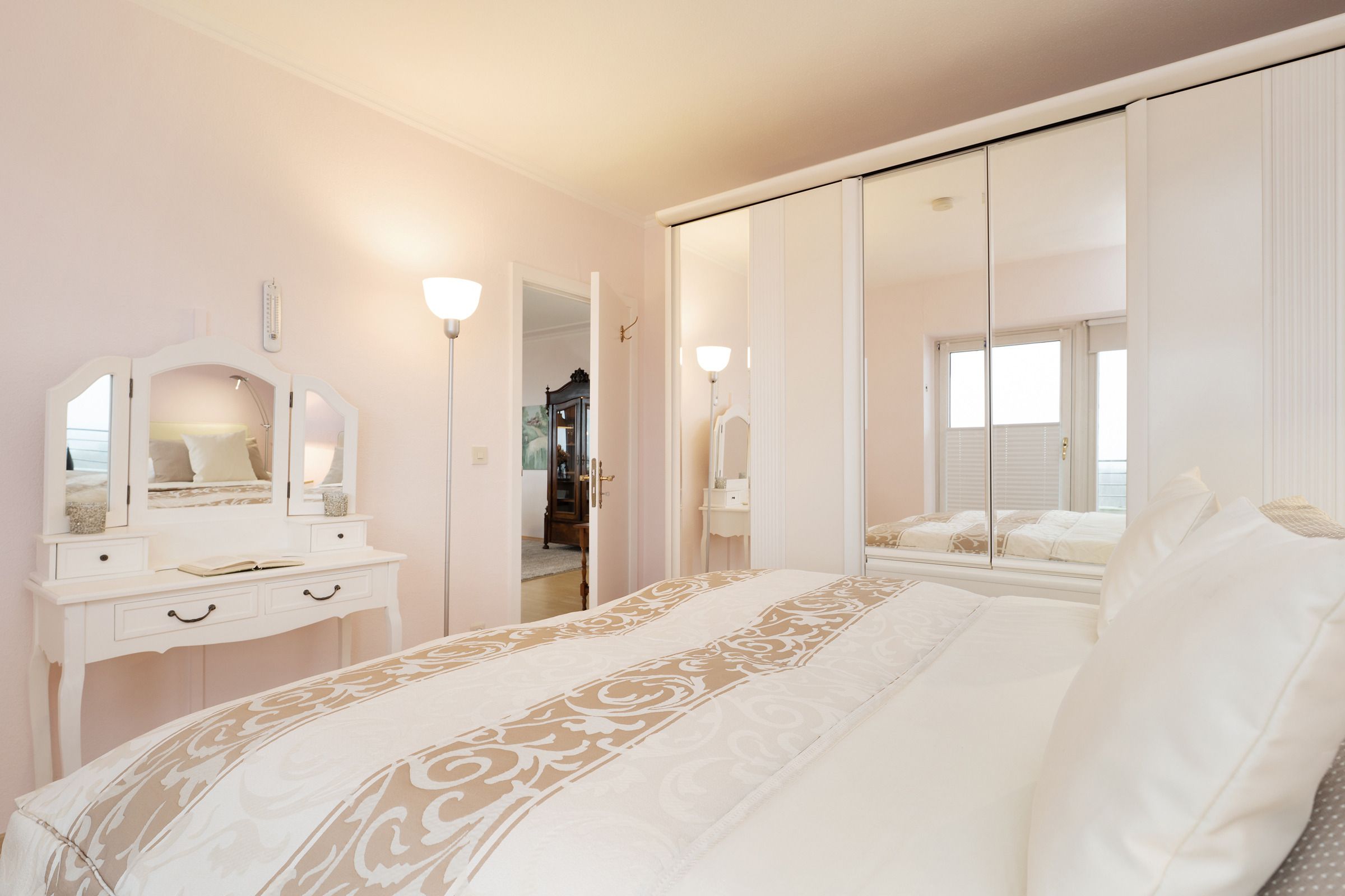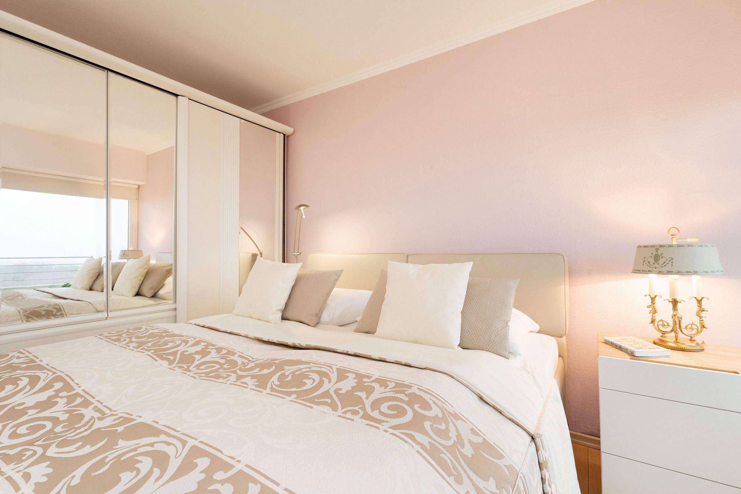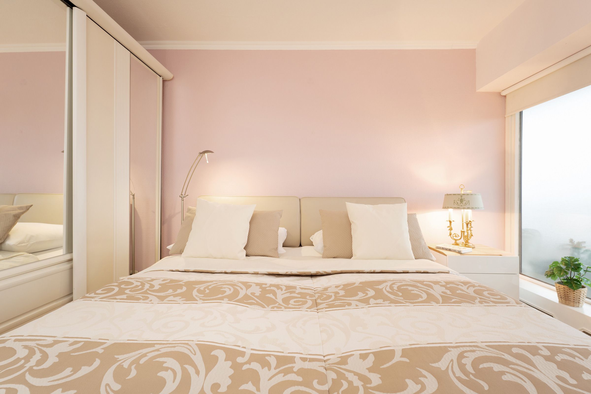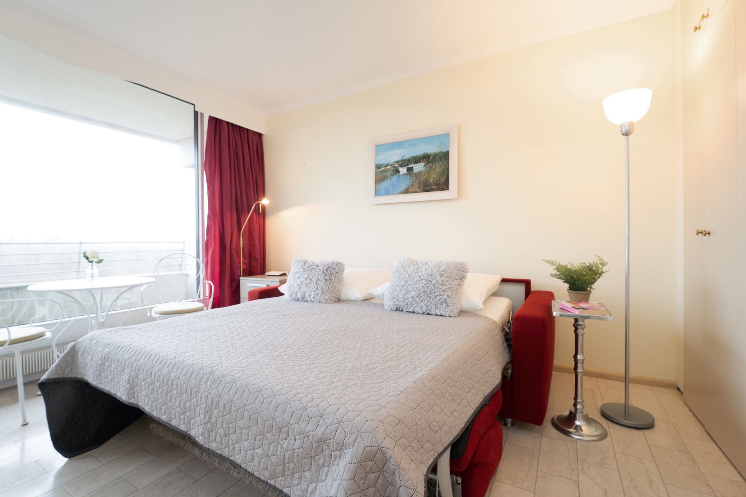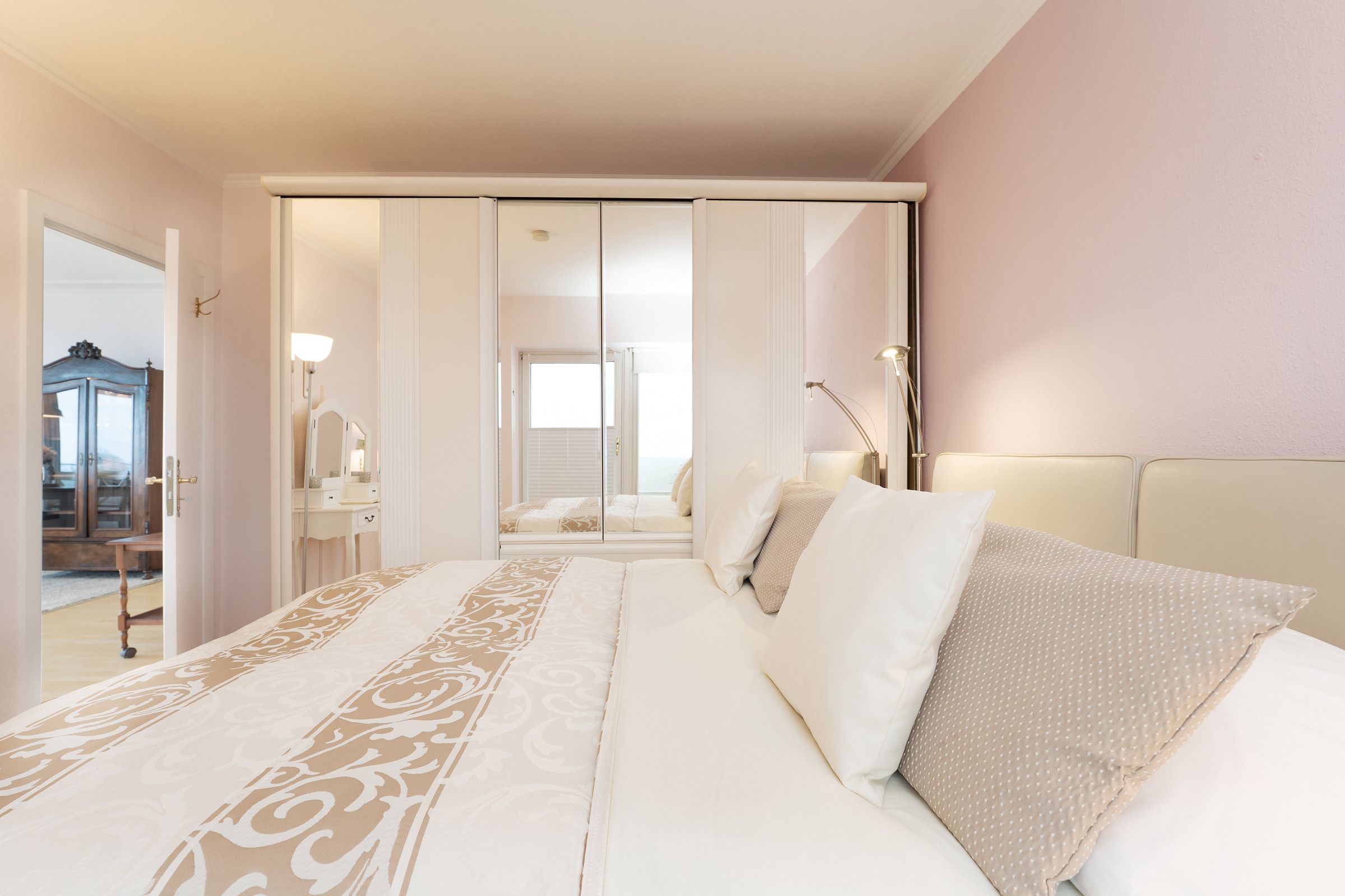 Schlafzimmer 1: 1 Boxspringdoppelbett (2x 90x200 cm), Kleiderschrank, Verdunkelung: Rollo und Plissee, kein Platz für ein Babybett vorhanden