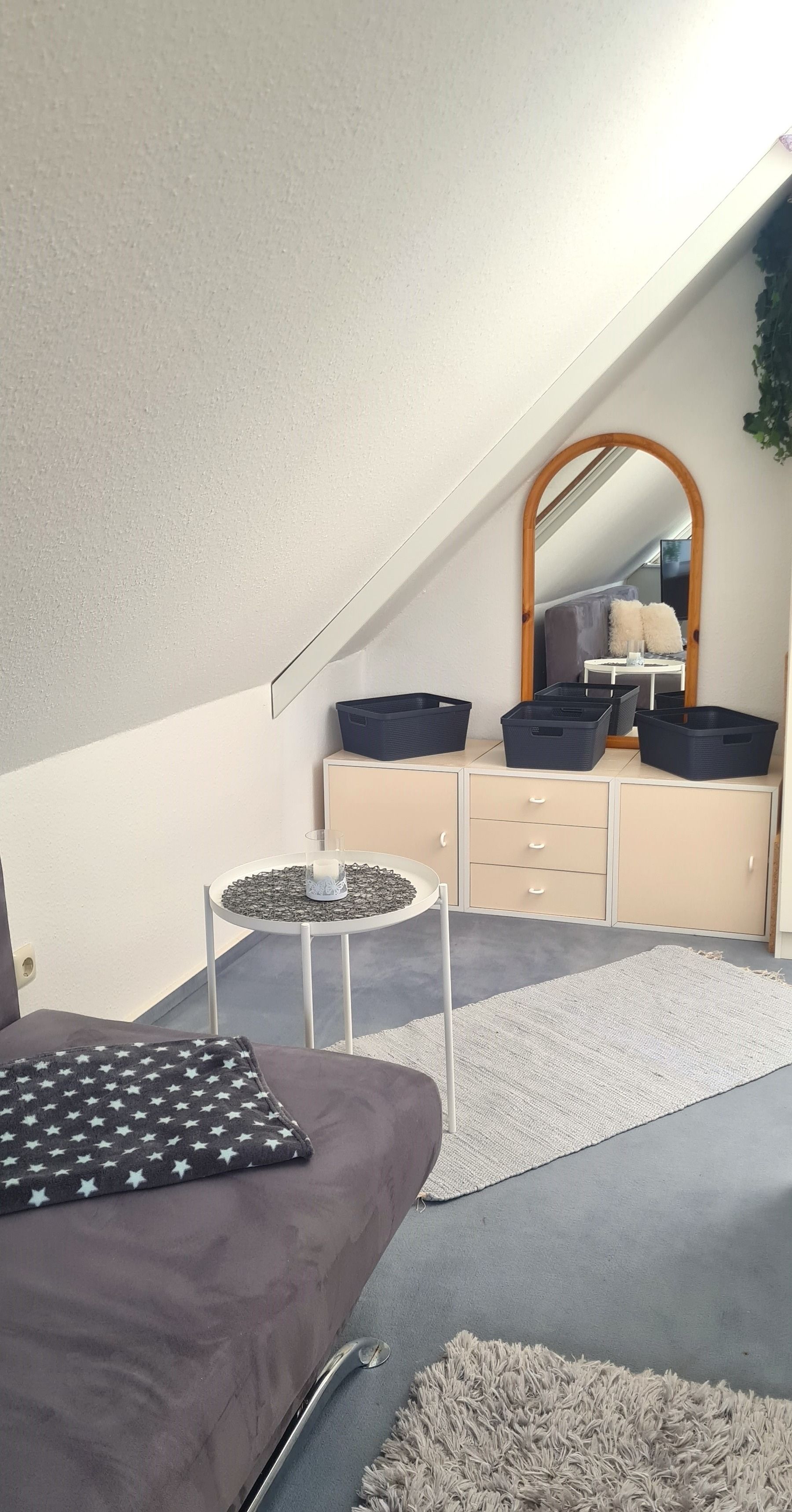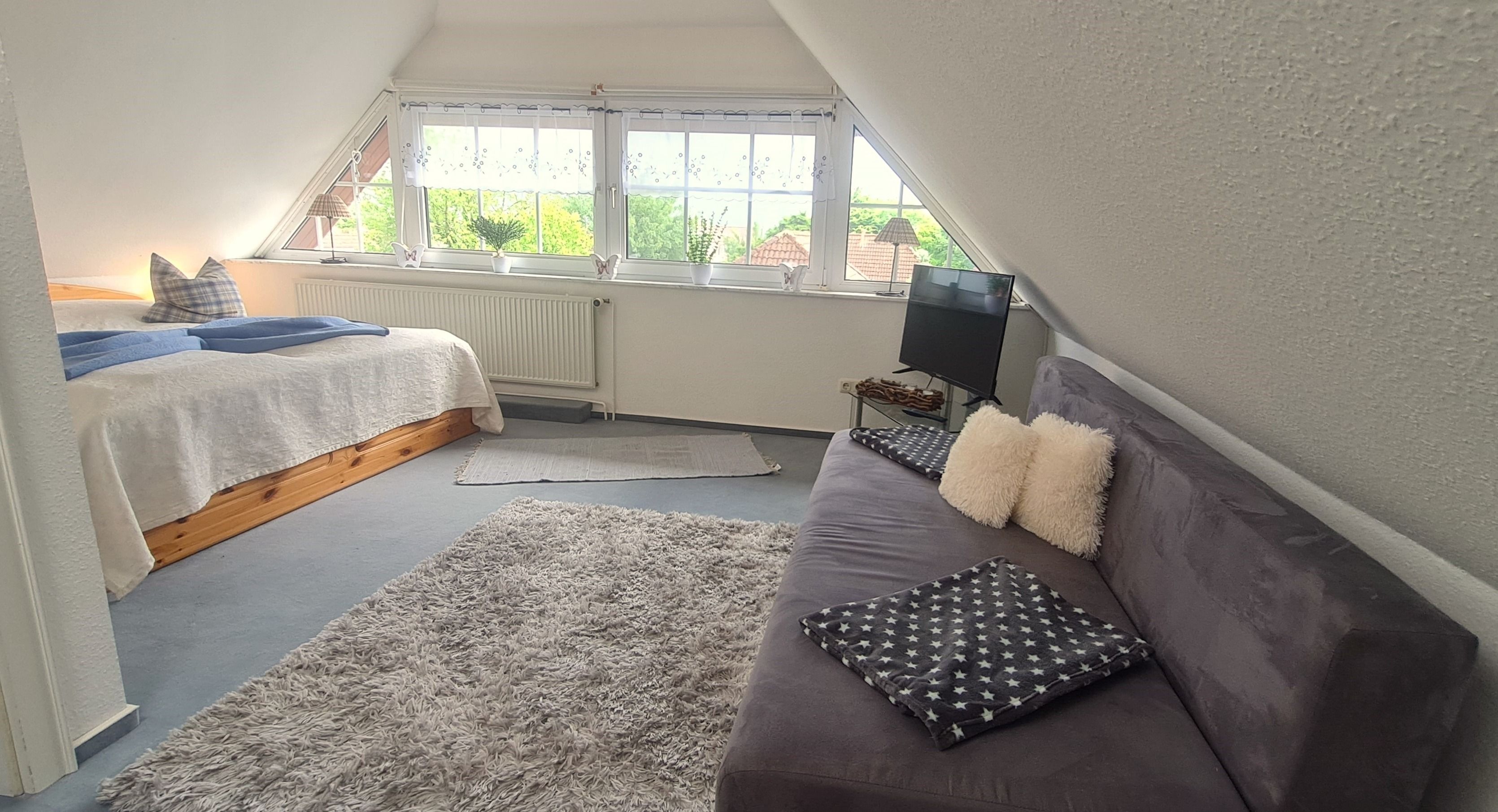 Im Dachgeschoss erwartet Sie ein charmantes Zimmer mit großem Doppelbett, Schlafsofa und Meerblick auf die Lübecker Bucht - ein ruhiger Rückzugsort unterm Spitzdach. Ein weiteres Schlafzimmer im Erdgeschoss bietet ein modernes Doppelbett sowie ein Einzelbett.