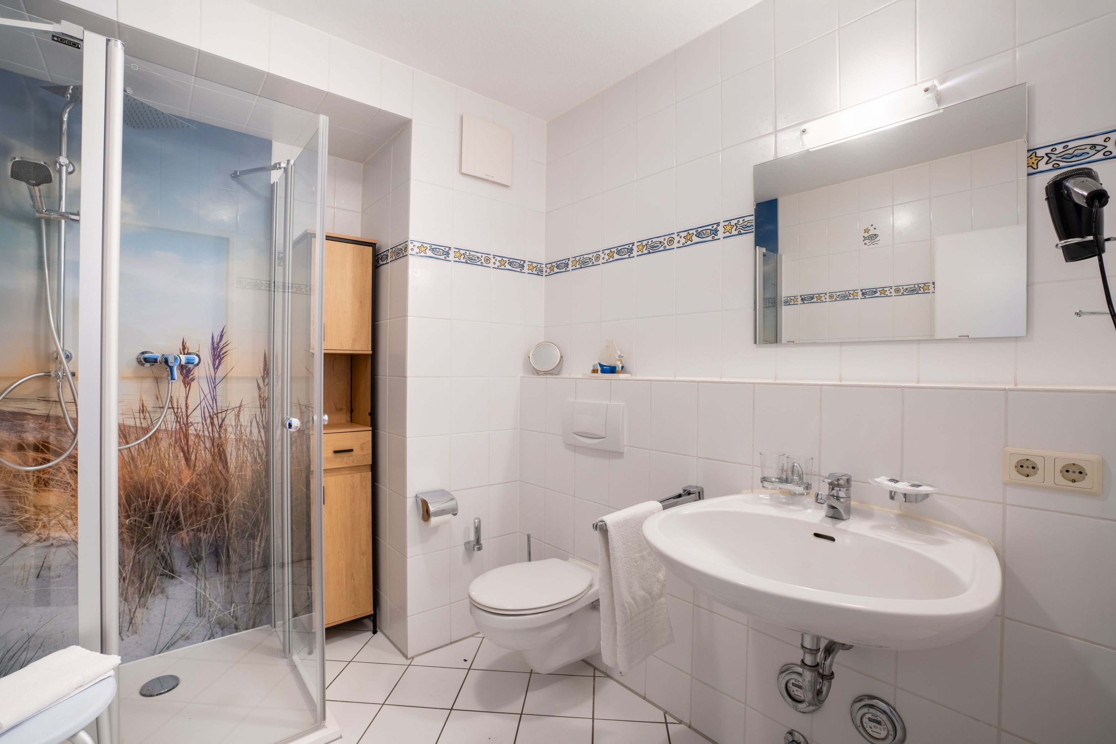 Die 42 m² große Ferienwohnung befindet sich in der zweiten Etage (mit Fahrstuhl erreichbar) und ist standardmäßig für 2 Personen ausgestattet; kann aber zusätzlich mit einem dritten Erwachsenen bzw. mit zwei Kindern belegt werden. Die Wohnung hat einen Wohnbereich mit ausklappbarer Doppelbettcouch, Sessel und Essplatz. Vom Wohnzimmer ist der Balkon erreichbar, von dem Sie den Blick auf die Ostsee genießen können. Das Schlafzimmer hat ein Doppelbett und ein zusätzliches TV-Gerät. Die separate und gut ausgestattete Küche verfügt über ein Fenster, Herd, Mikrowelle, Wasserkocher, Kaffeemaschine, Toaster, Kühlschrank mit Gefrierfach sowie Spülmaschine. Im Bad befindet sich eine ebenerdige Dusche, Waschbecken und WC.