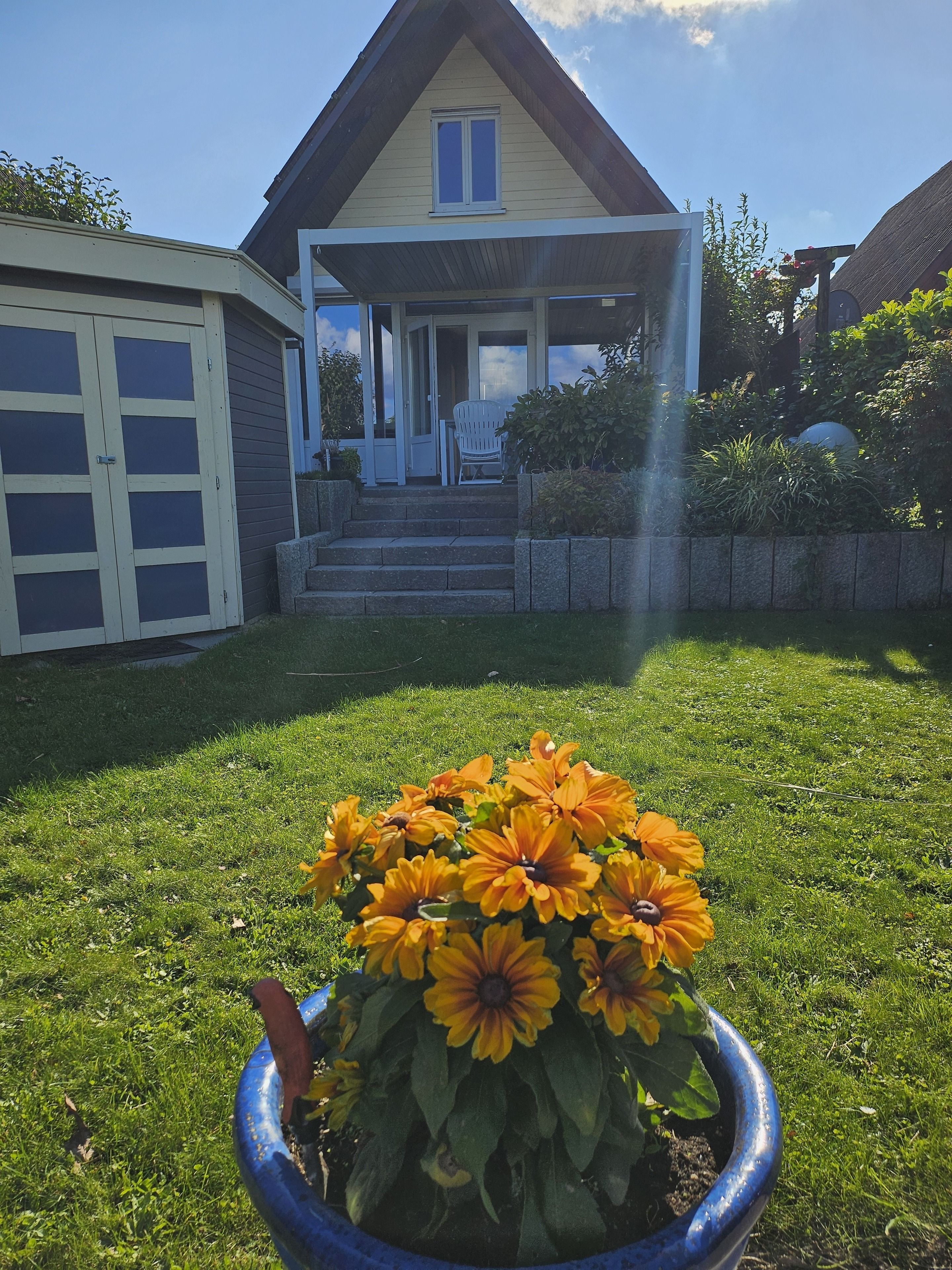 Wer sich neben dem Platz in der Natur auch ein betriebsbereites Haus wünscht, findet neben einer voll ausgestatteten Küche, Waschmaschine, Parkplatz vor dem Haus mit kostenlos nutzbarer Wallbox, 2 großzügige Terrassen (Nord und Süd) mit Regenschutz und vor dem Haus eine große Wiese, die zum Federballspielen einlädt.