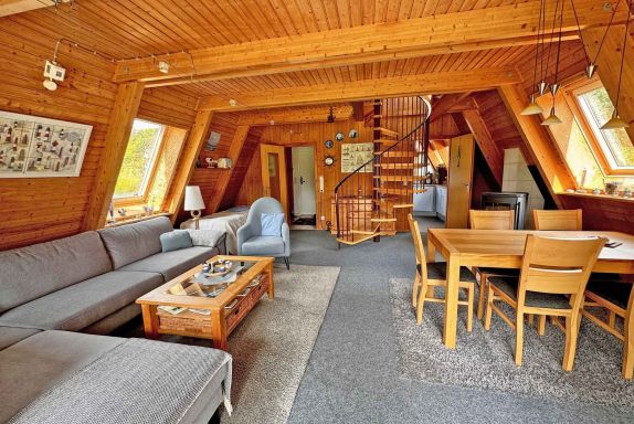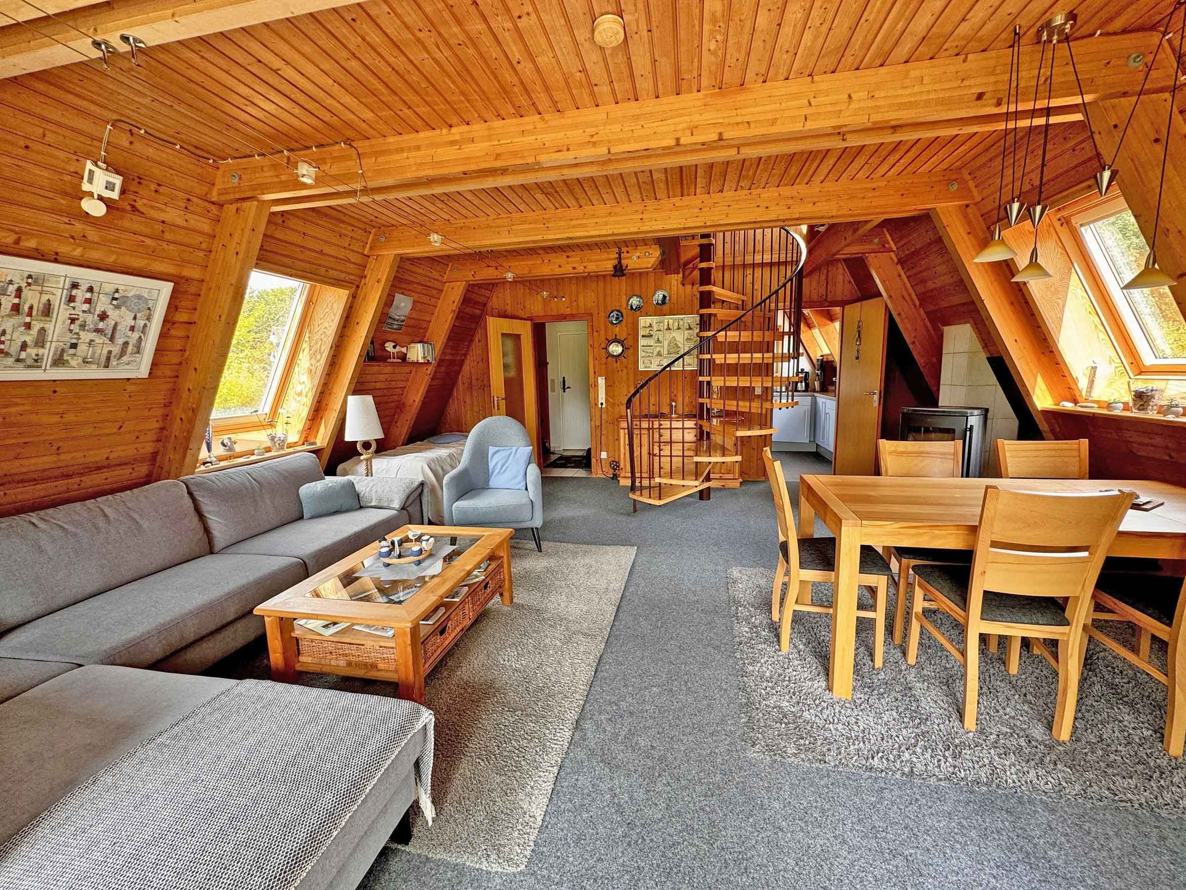 Das Zeltdachhaus verfügt über zwei getrennte Schlafräume (im oberen Bereich des Hauses), kombiniertes Wohn- und Esszimmer, vollwertige Küche und Terrasse. Ein Kinderreisebett und Kinderhochstuhl sind immer vorhanden und kostenlos nutzbar.