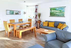 Der Mittelpunkt der Wohnung ist der kombinierte Wohn-, Ess- und Kochbereich mit gemütlicher Sofagarnitur, kostenlosem WLAN, Flachbild-SAT-TV, DVD-Player sowie Radio mit CD-Player.