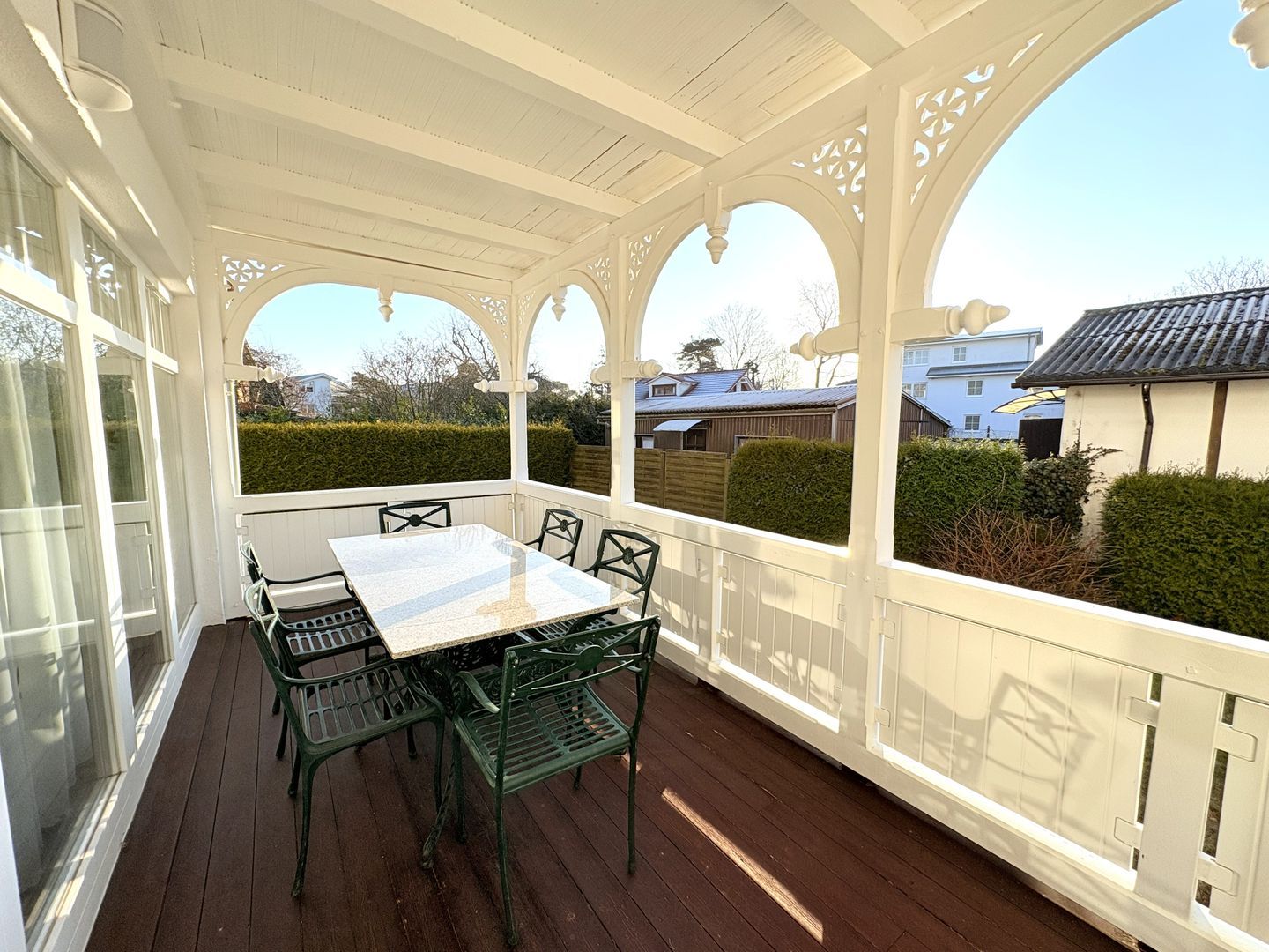 - Überdachter Balkon mit Tisch und Stühlen