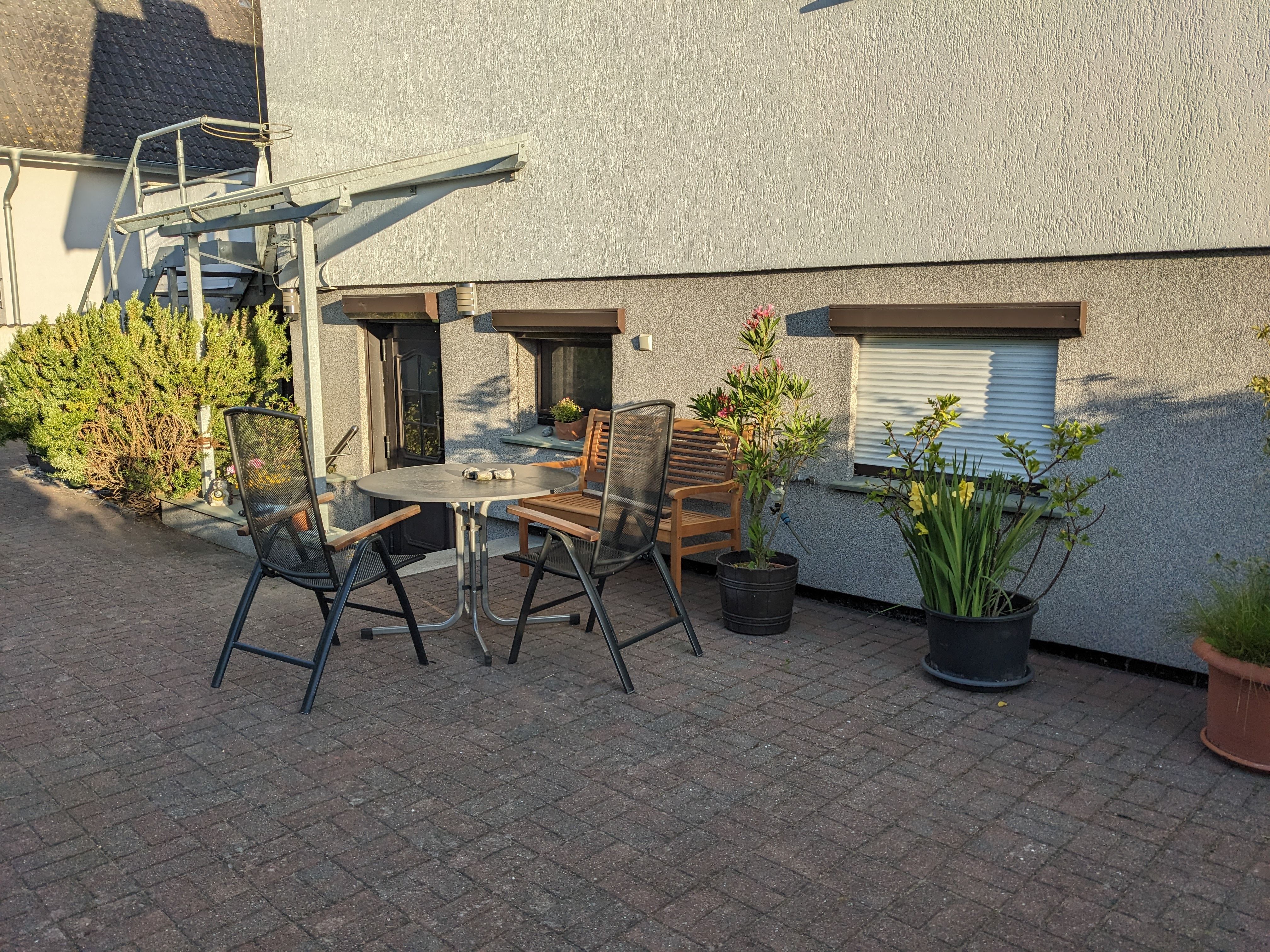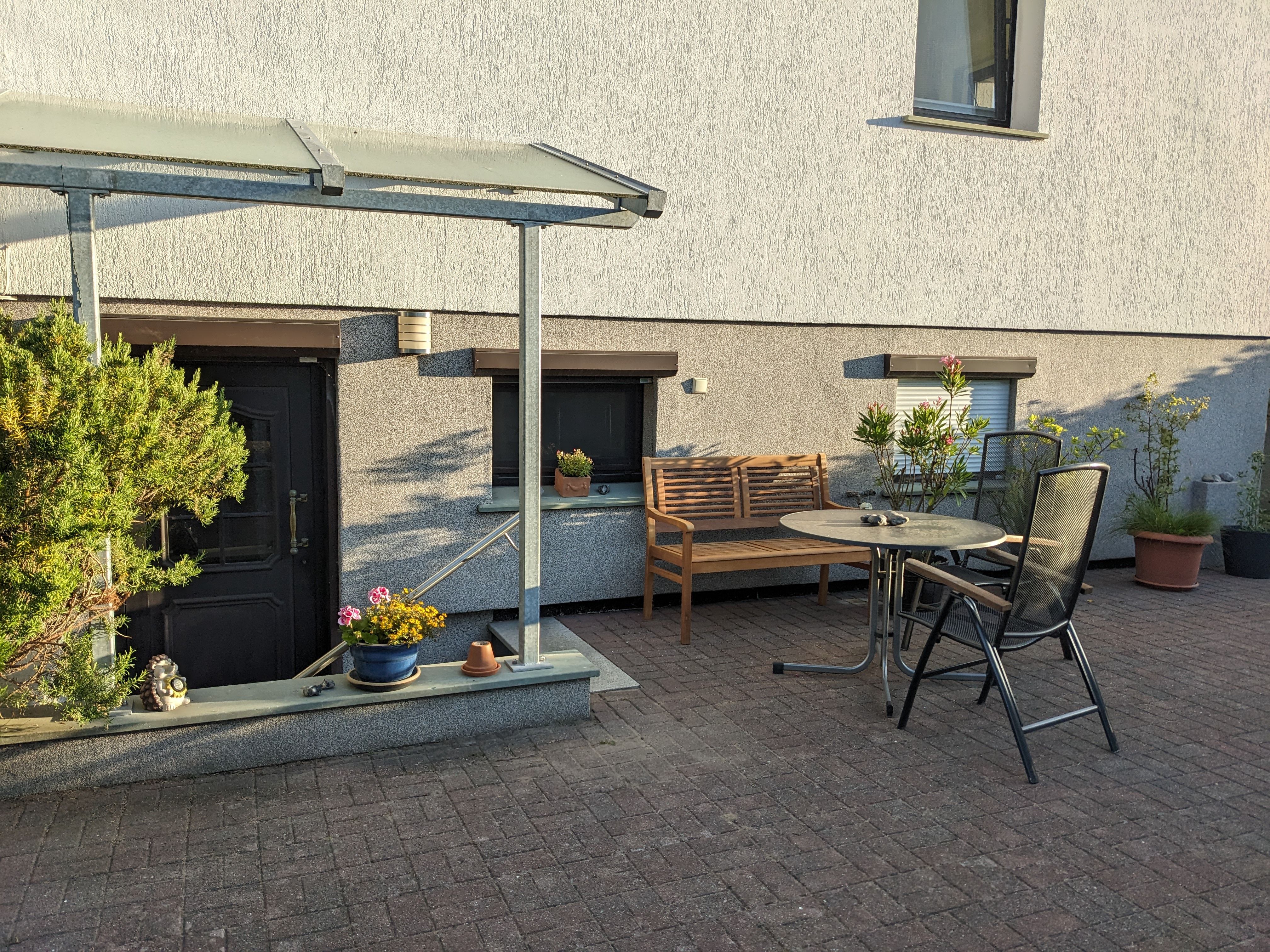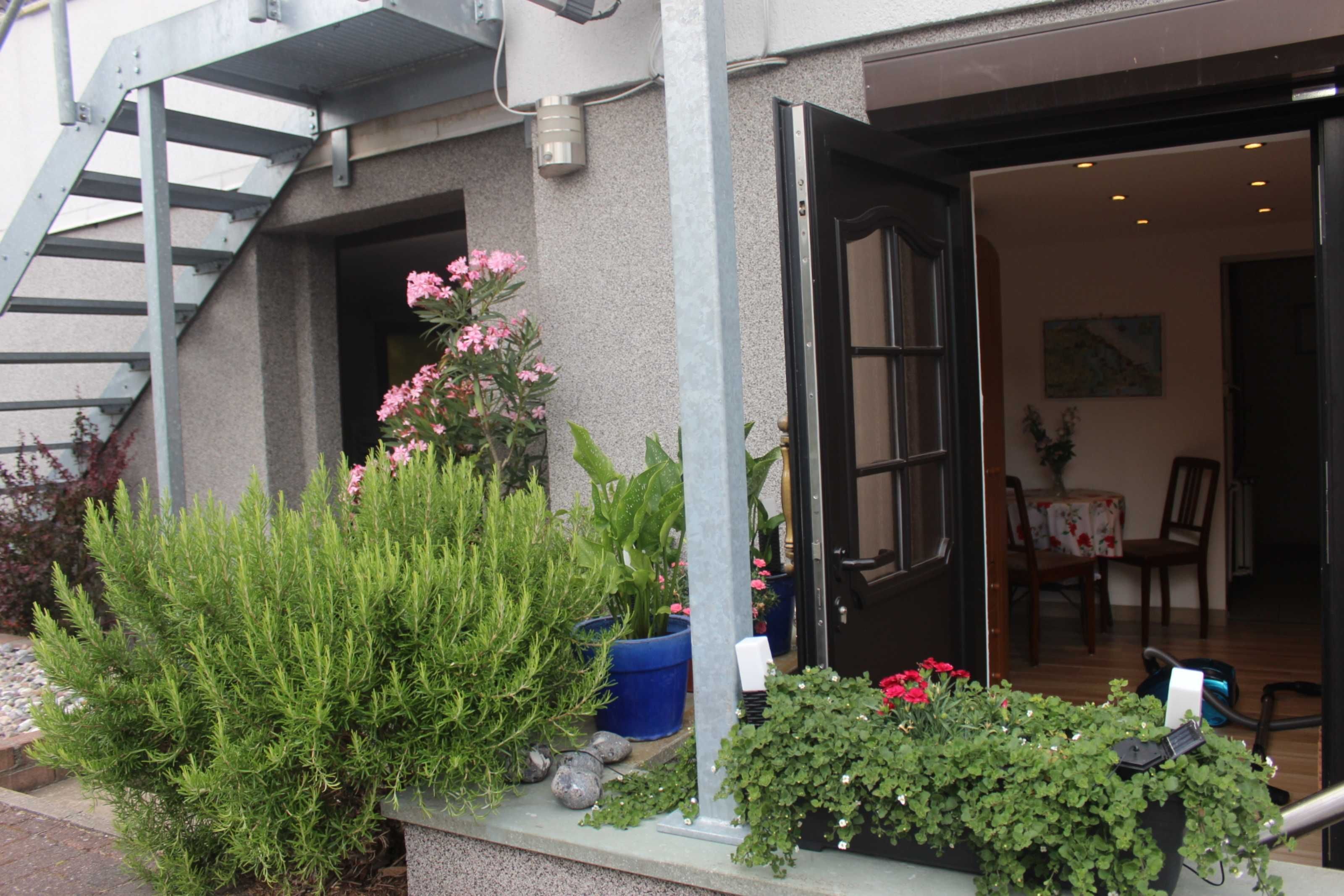 Die Ferienwohnung hat einen separaten Eingang mit Sitzecke. Genutzt werden können Liegewiese, Gartenmöbel und Holzkohlegrill.