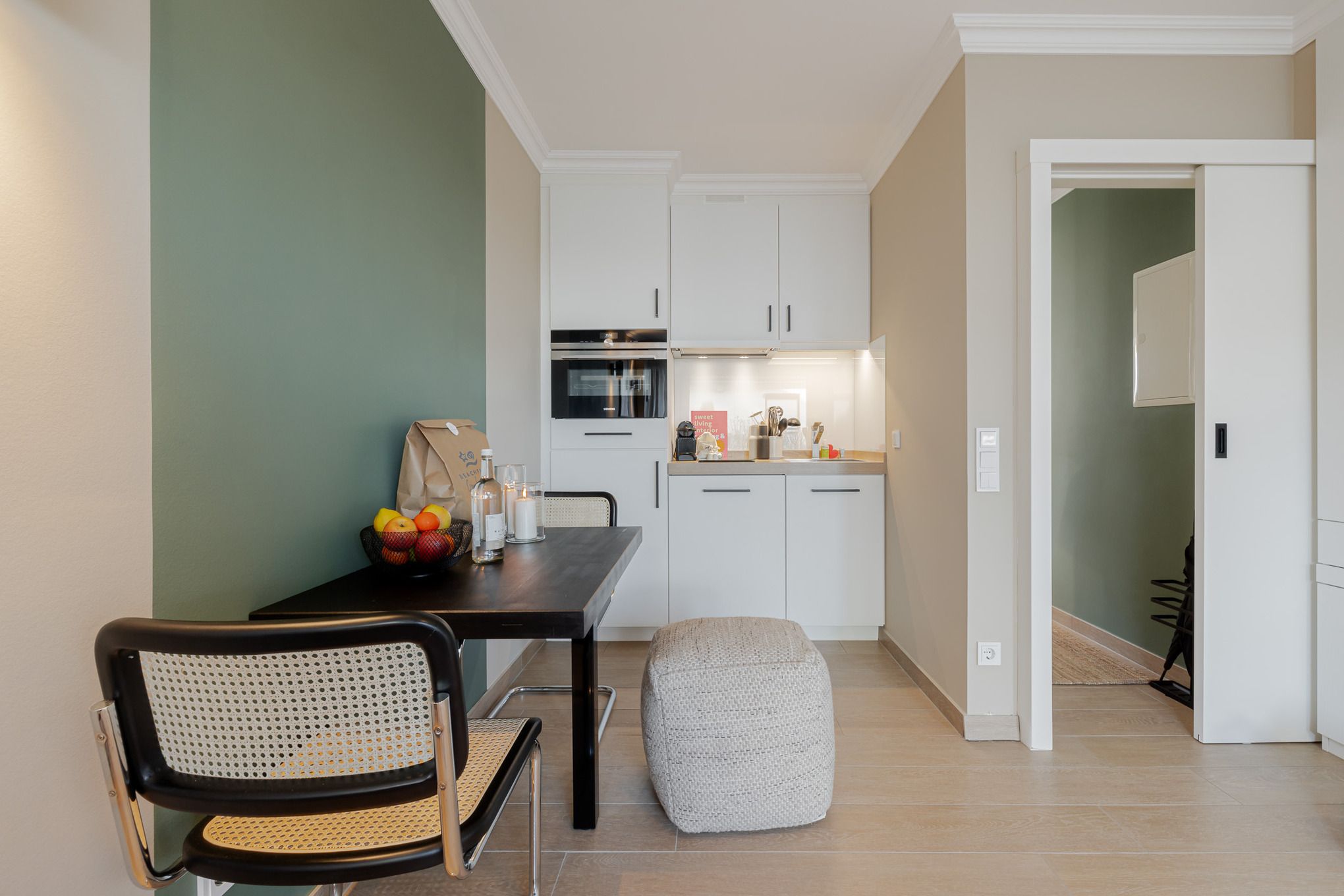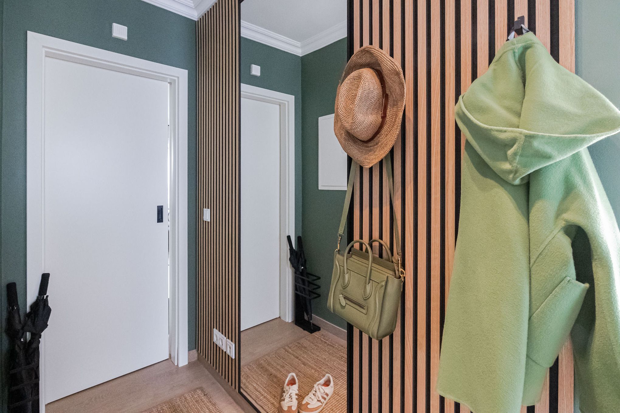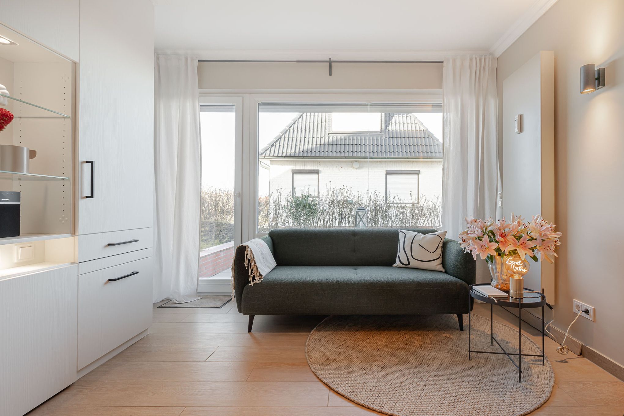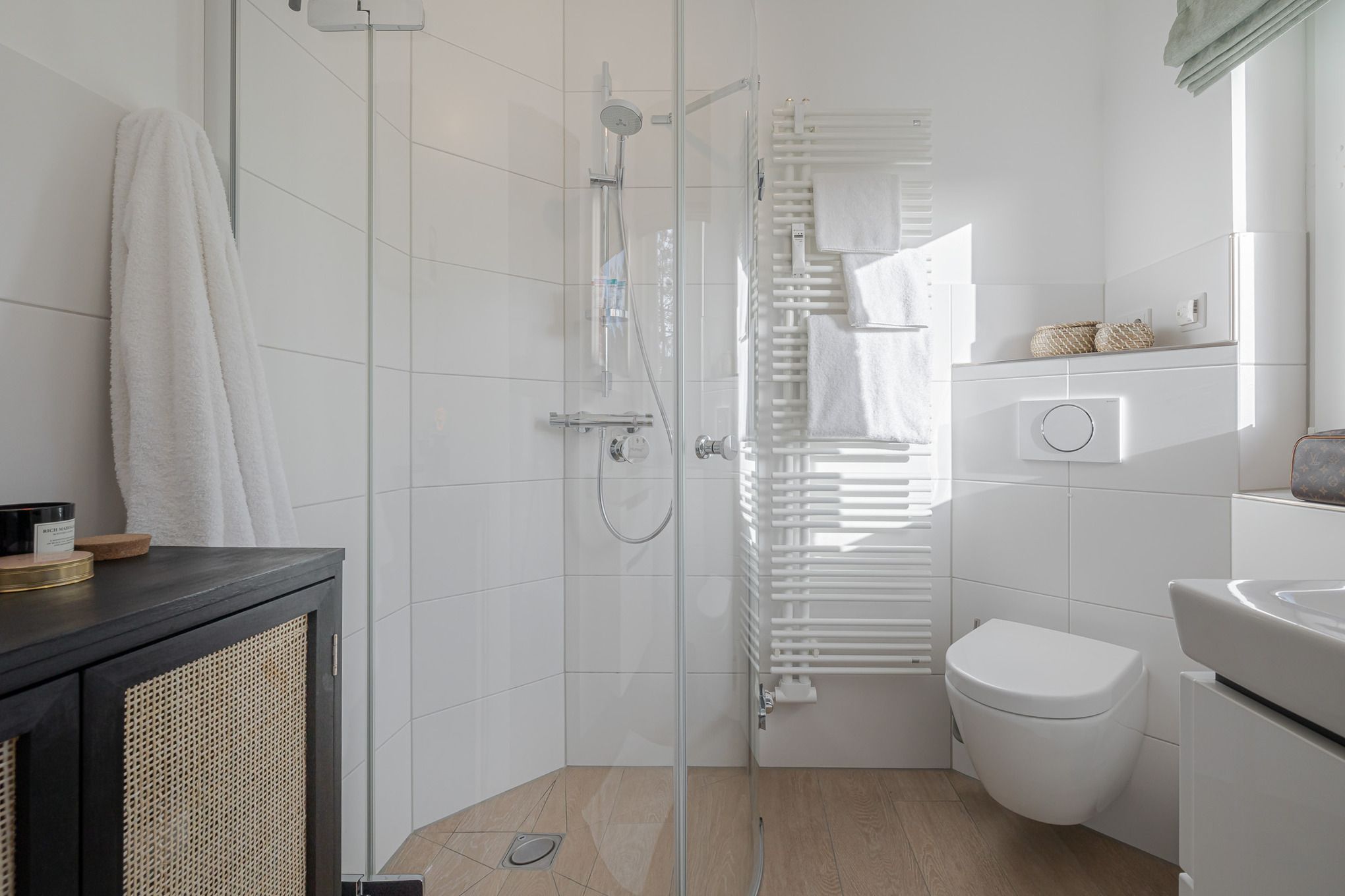 Schon beim Eintreten empfängt Sie ein heller Flur mit Akustikpaneelen, Garderobe und Ganzkörperspiegel, der direkt in den offenen Wohn- und Essbereich führt. Gleich daneben liegt das moderne Tageslichtbad mit ebenerdiger Dusche, viel Ablagefläche und warmen, scandinavisch anmutenden Holzoptik-Fliesen.