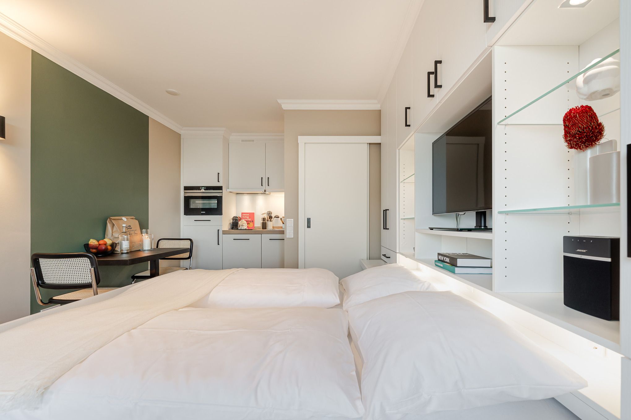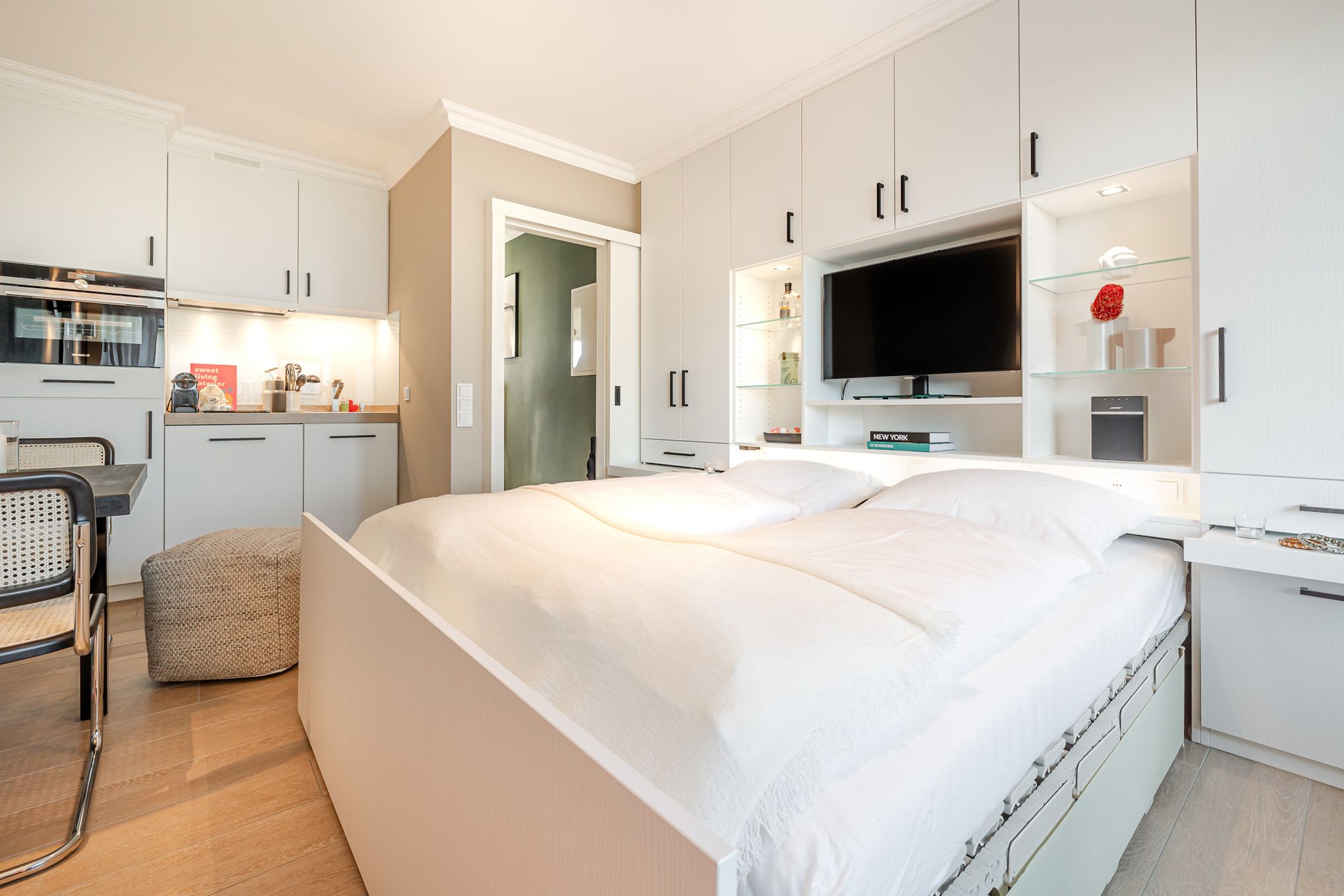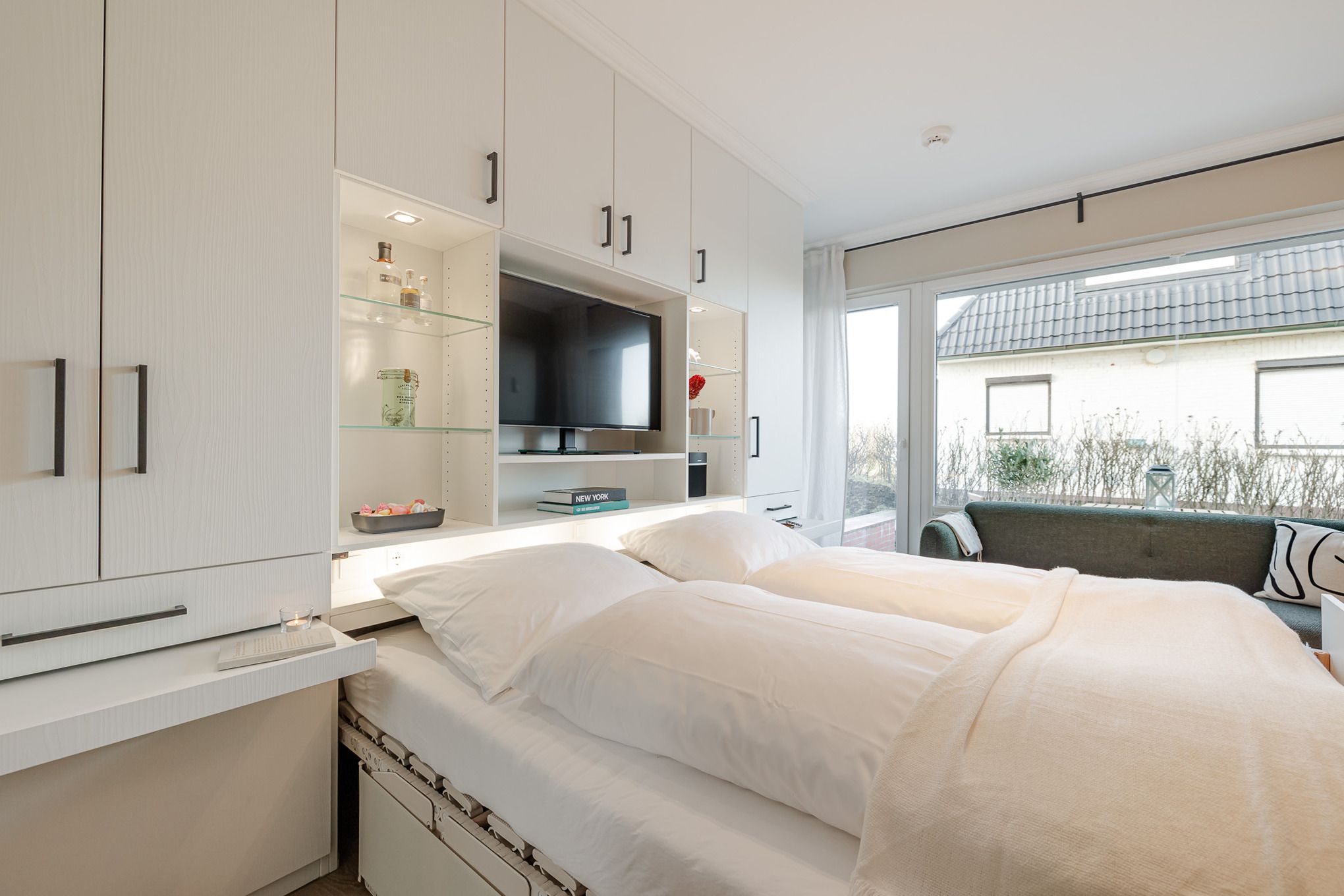 Im Wohnbereich genießen Sie den Blick Richtung Meer, entspannen auf der bequemen Couch, schauen Smart-TV oder hören Musik über die Bose-Bluetooth-Box. Abends verwandelt sich der Raum per Knopfdruck in einen Schlafbereich: Ein 1,80 m breites Bett fährt elegant aus dem Schranksystem, ergänzt durch ausziehbare Nachttische und clever integrierten Stauraum für Kleidung.