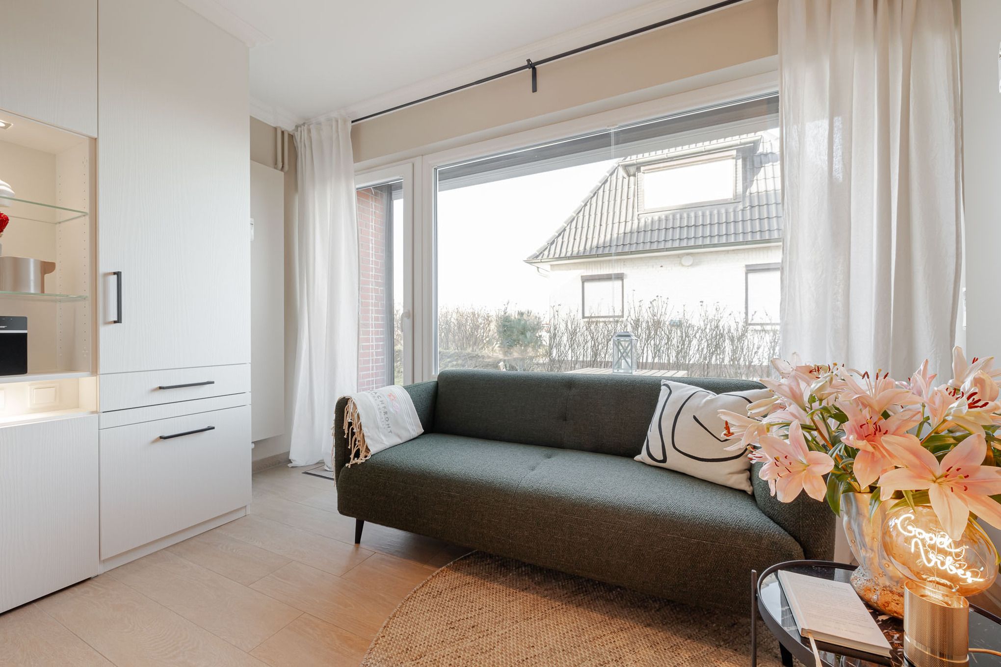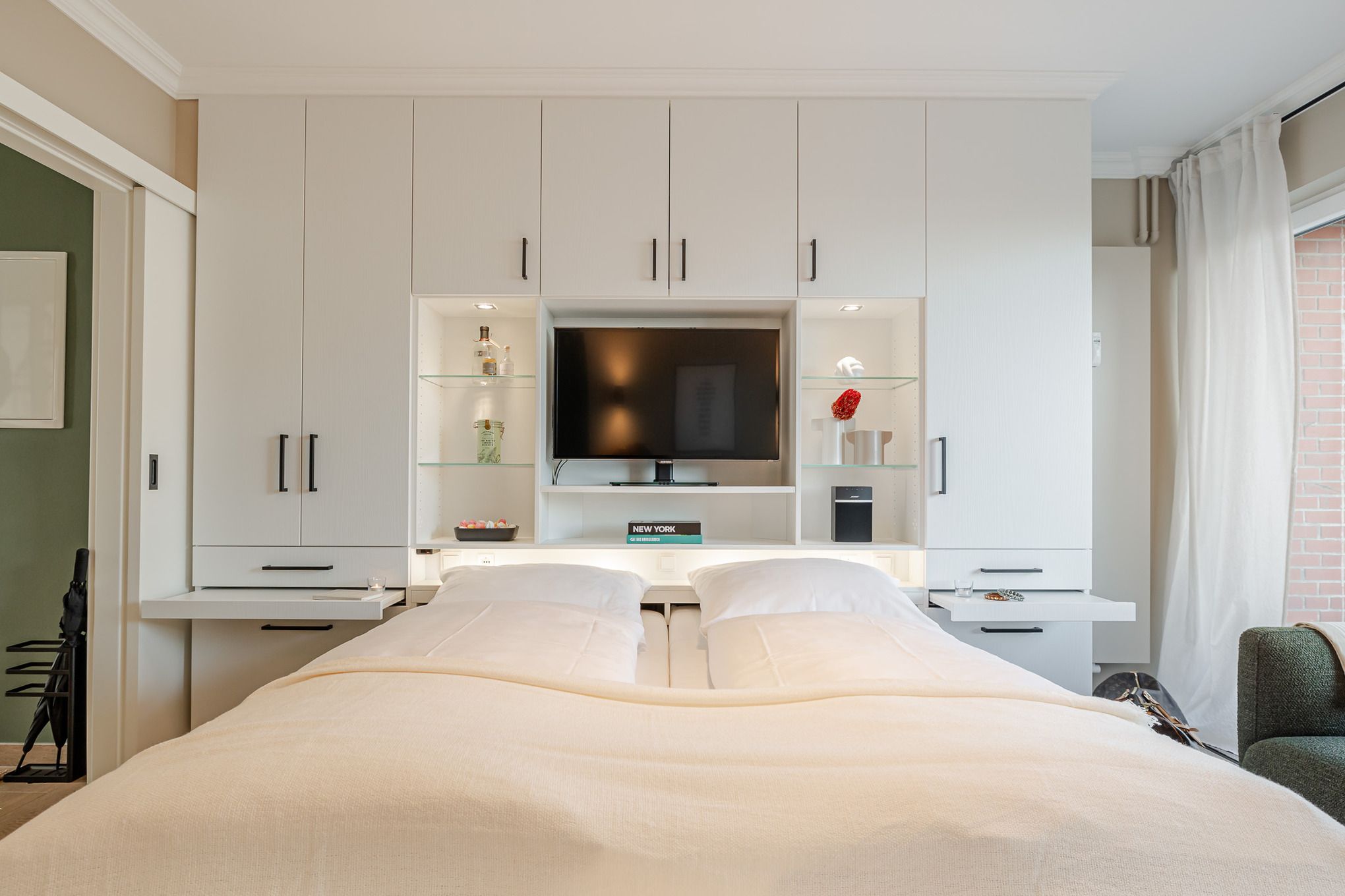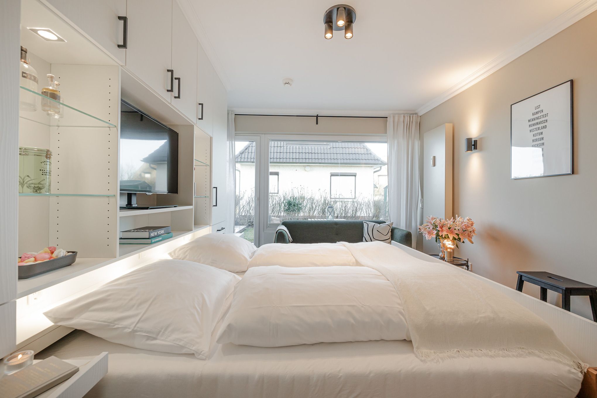 Im Wohnbereich genießen Sie den Blick Richtung Meer, entspannen auf der bequemen Couch, schauen Smart-TV oder hören Musik über die Bose-Bluetooth-Box. Abends verwandelt sich der Raum per Knopfdruck in einen Schlafbereich: Ein 1,80 m breites Bett fährt elegant aus dem Schranksystem, ergänzt durch ausziehbare Nachttische und clever integrierten Stauraum für Kleidung.