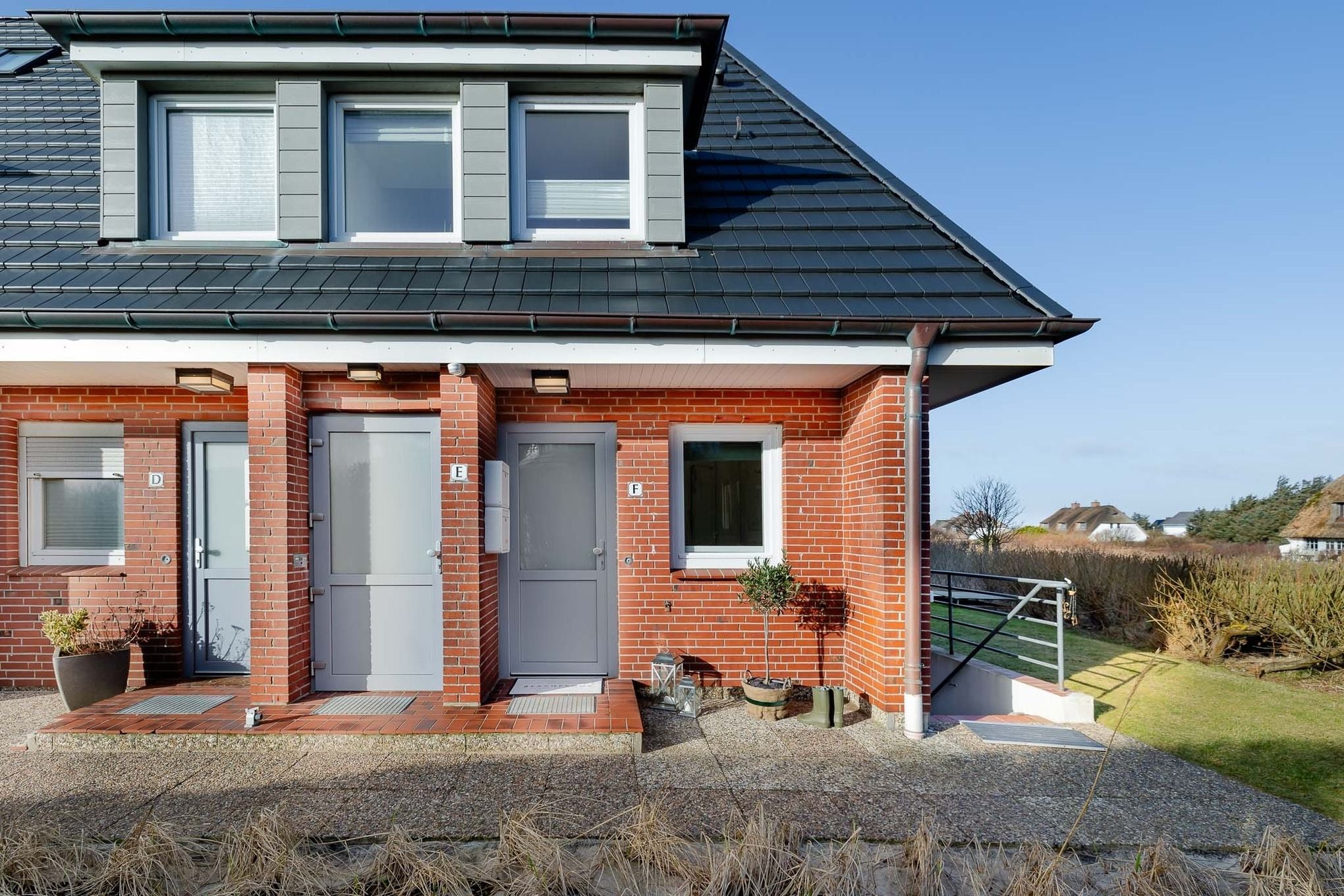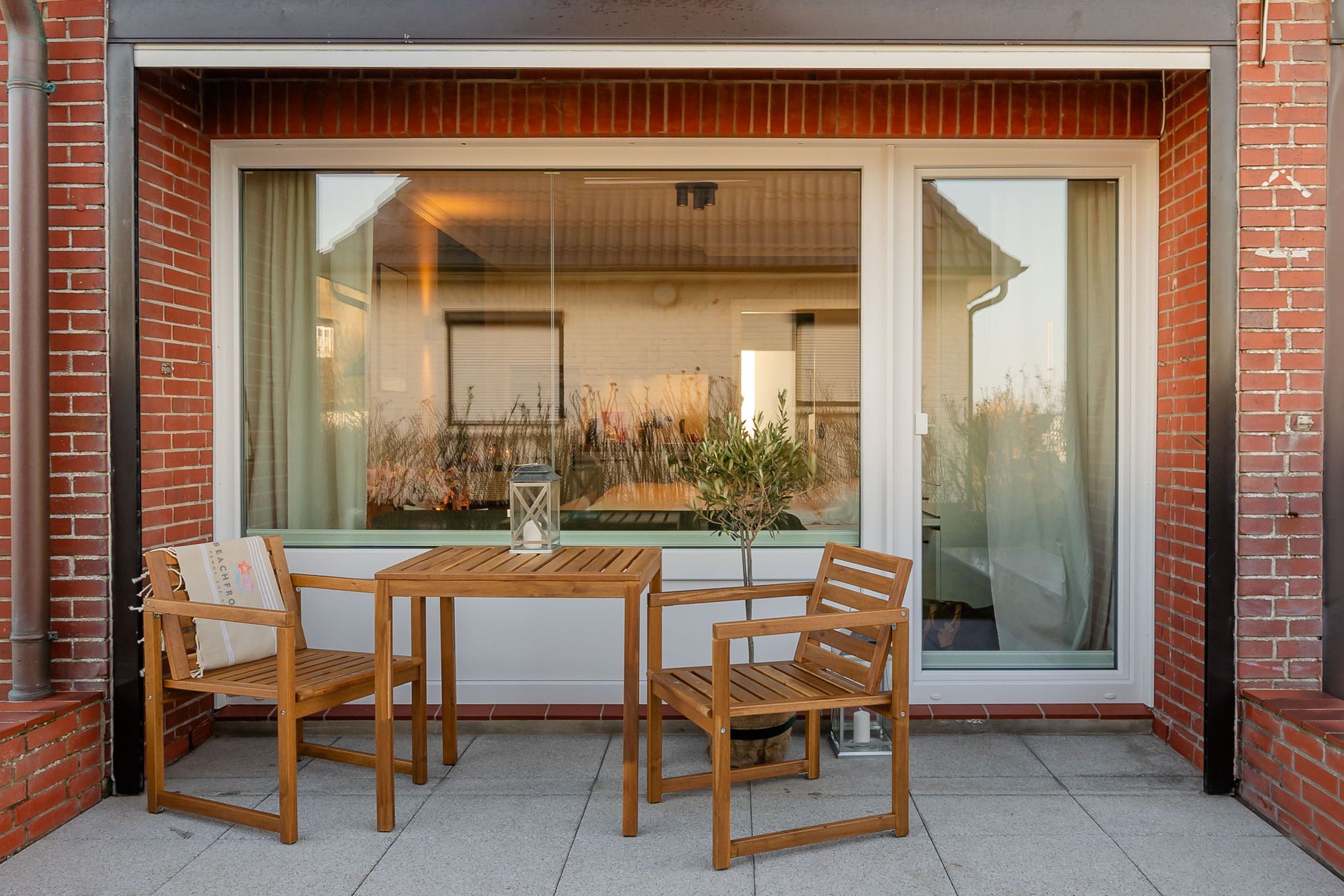 Draußen erwartet Sie Ihre eigene Terrasse mit Gartenteil und Strandkorb (Mai–Oktober). Hier lassen Sie den Tag mit einem Glas Wein ausklingen oder starten morgens mit Sonnenfrühstück – bei guter Sicht sogar mit kleinem Meerblick.
