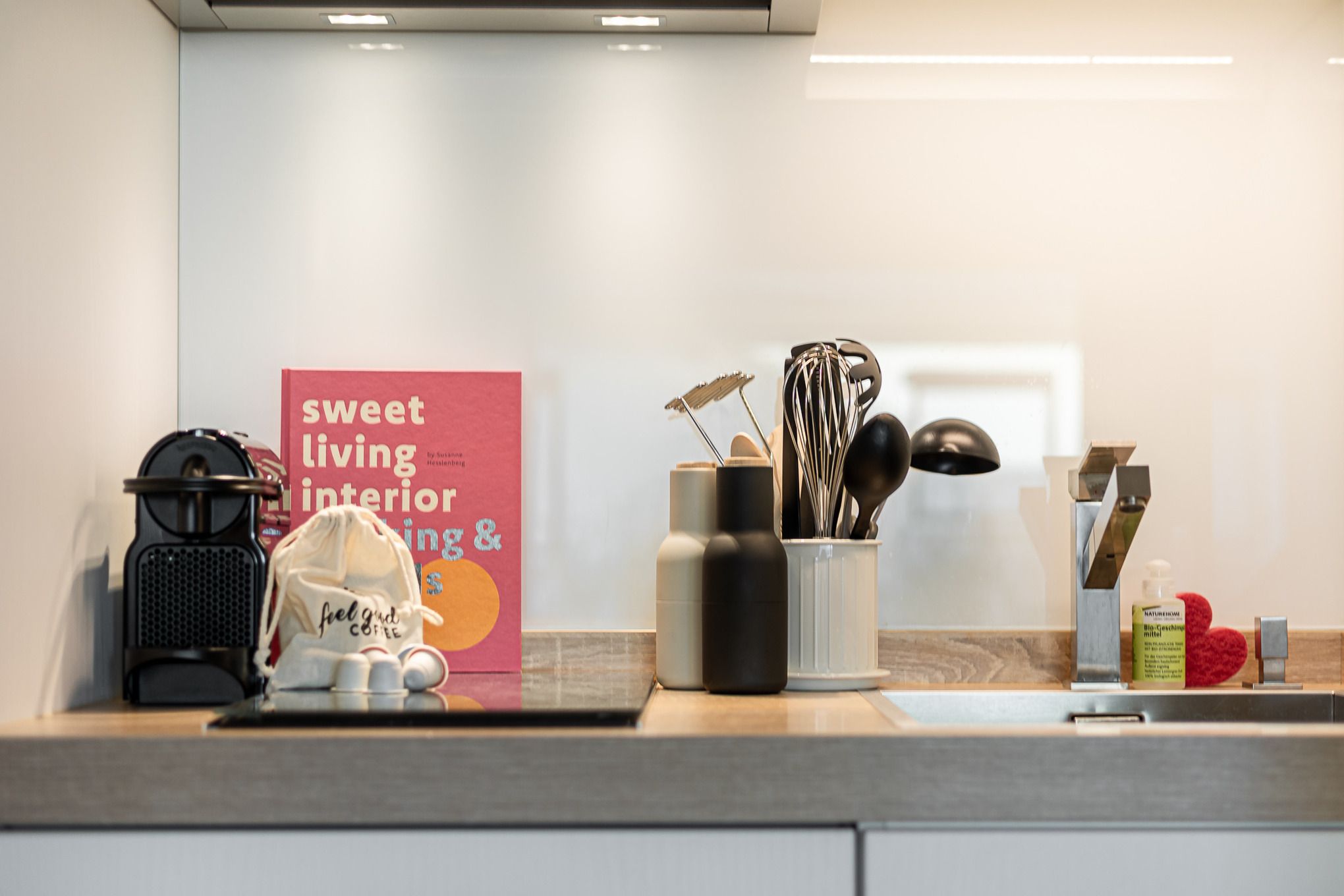 Die Küche ist clever integriert und voll ausgestattet: Siemens-Markengeräte, Induktionskochfeld, großer Geschirrspüler, tiefes Edelstahlbecken und ein Backofen in Griffhöhe mit praktischer Vorwärmfunktion für Geschirr machen auch das Kochen im Urlaub zum Vergnügen.