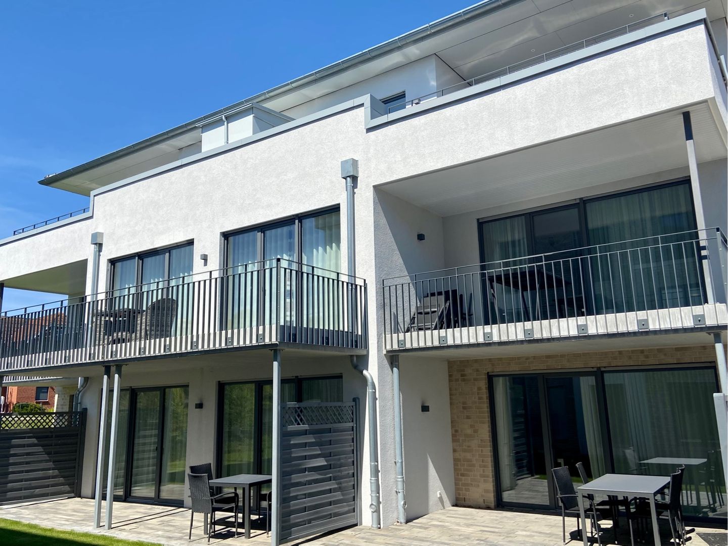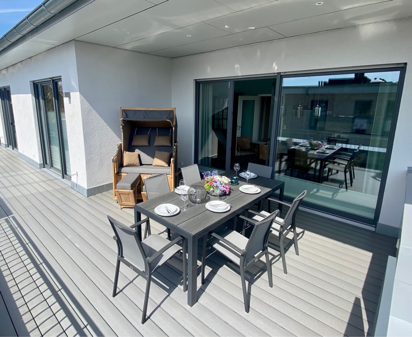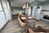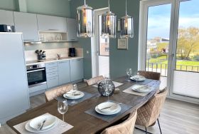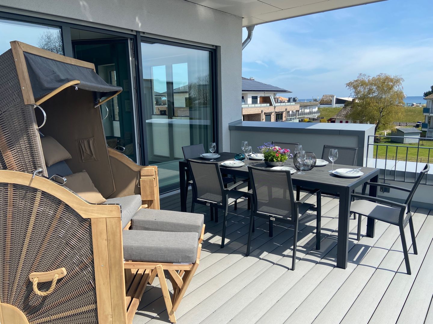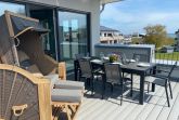 Traumwohnung an der Ostsee: Diese Penthousewohnung befindet sich in der beliebten Strandwiese. Ein Fahrstuhl bringt Sie nach oben und lässt den Urlaub sofort beginnen. Hier empfängt Sie eine modern eingerichtete 3 Zimmer-Wohnung mit großer Dachterrasse - teilüberdacht mit Strandkorb und bequemen Gartenmöbeln - in unmittelbarer Strandnähe. Die Wohnung verfügt über zwei Schlafzimmer, beide mit TV und jeweils einem Boxspring-Doppelbett 1,80 x 2,00 m (mit durchgängigen Matratzen) ausgestattet. Vom Wohnzimmer mit TV und vom Esszimmer aus haben Sie einen direkten Zugang zur sonnigen Südterrasse. Ein Schreibtisch lässt Sie auch beim Homeoffice mit kostenlosen WLAN entspannt arbeiten. Die sehr gute Raumaufteilung und die hochwertige Ausstattung sorgen für höchsten Urlaubskomfort. Die bodentiefer Dusche im großzügigen Badezimmer mit Waschmaschine ergänzen die gehobene und moderne Ausstattung dieser Wohnung. Die komplett ausgestattete Küche ist offen in den Wohnraum integriert. Die Fußbodenheizung sorgt für wohlige Wärme. Der PKW-Stellplatz für diese bezaubernde Wohnung befindet sich direkt vor dem Haus, das insgesamt aus acht Ferienwohnungen besteht. Auf dem Grundstück finden auch eine Unterstellmöglichkeit für mitgebrachte Fahrräder und E-Bikes. In dieser Wohnung können Sie Ihren Ostseetraum verwirklichen und schöne Urlaubstage verbringen ! Einziehen, wohlfühlen … und ab ins Meer ! Lifestyle Ferienwohnung für den besonderen Urlaub in Dahme. Auf den Bildern erkennen Sie, dass der Ausblick zur Ostsee von der Terrasse sowie vom Esszimmer grandios ist.