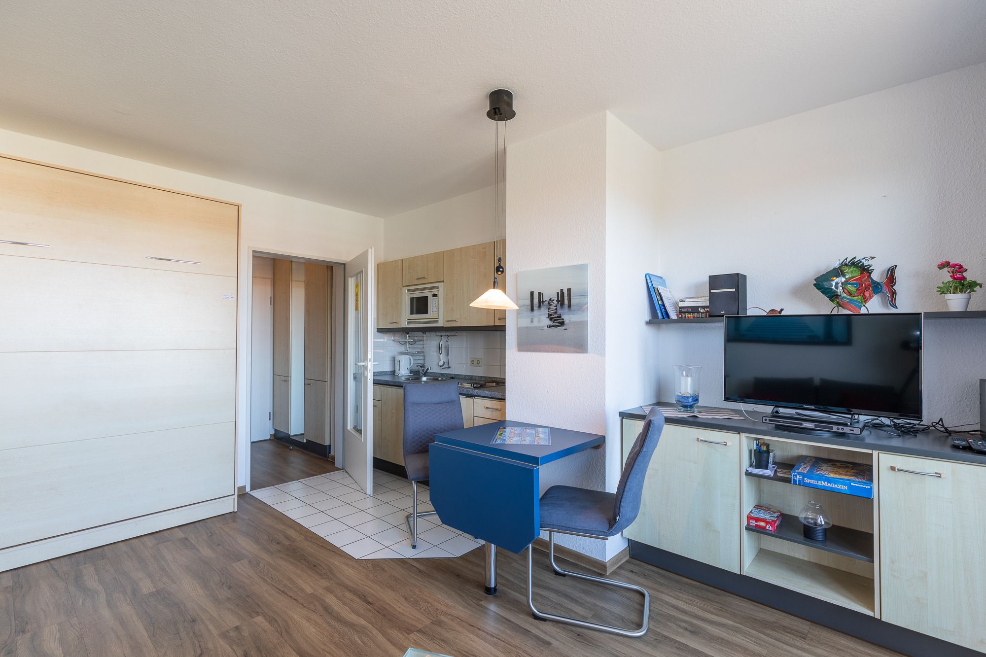 Die geschmackvoll eingerichtete Ferienwohnung mit einer Größe von ca. 35 m² Wohnfläche ist bis zu 2 Personen ausgestattet. 1 Wohn-Schlafzimmer mit Schrankbett, Sofa (kann als Schlafsofa genutzt werden), Küchenzeile (Herd, Mikrowelle, Kühlschrank mit Gefrierfach), Esstisch (der bei Bedarf aufgeklappt und wieder eingeklappt werden kann), Bad mit WC und Dusche und direktem Zugang zum großen Balkon mit Strandkorb. Nichtraucherwohnung, PKW-Stellplatz direkt am Haus.
