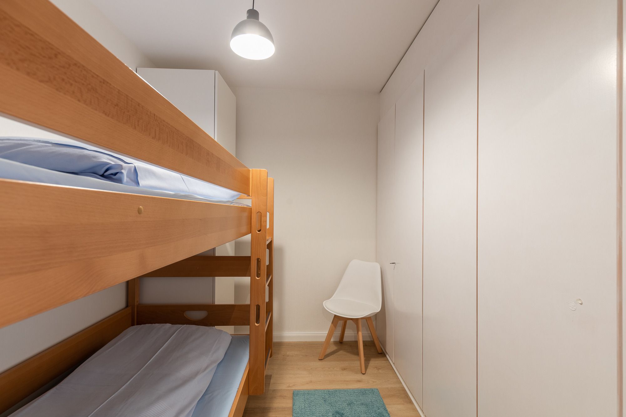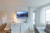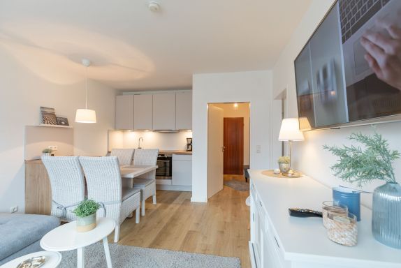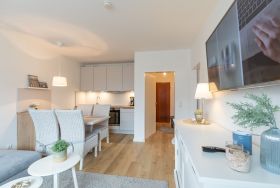 Mit einer Größe von ca. 54 m² Wohnfläche ist die Wohnung komplett bis zu 4 Personen ausgestattet, Wohnzimmer mit kompletter Einbauküche (Backofen, Cerankochfeld, Geschirrspüler, Toaster, Wasserkocher, Kühlschrank), Essplatz, Sofa-Ecke und direktem Zugang zum Balkon, 1 Schlafzimmer mit Doppelbett und TV, 2. Schlafzimmer innenliegend mit Etagenbett, Bad mit Dusche und WC, 1 Flatscreen TV im Wohnzimmer, Nichtraucherwohnung, keine Haustiere, PKW-Stellplatz direkt am Haus.