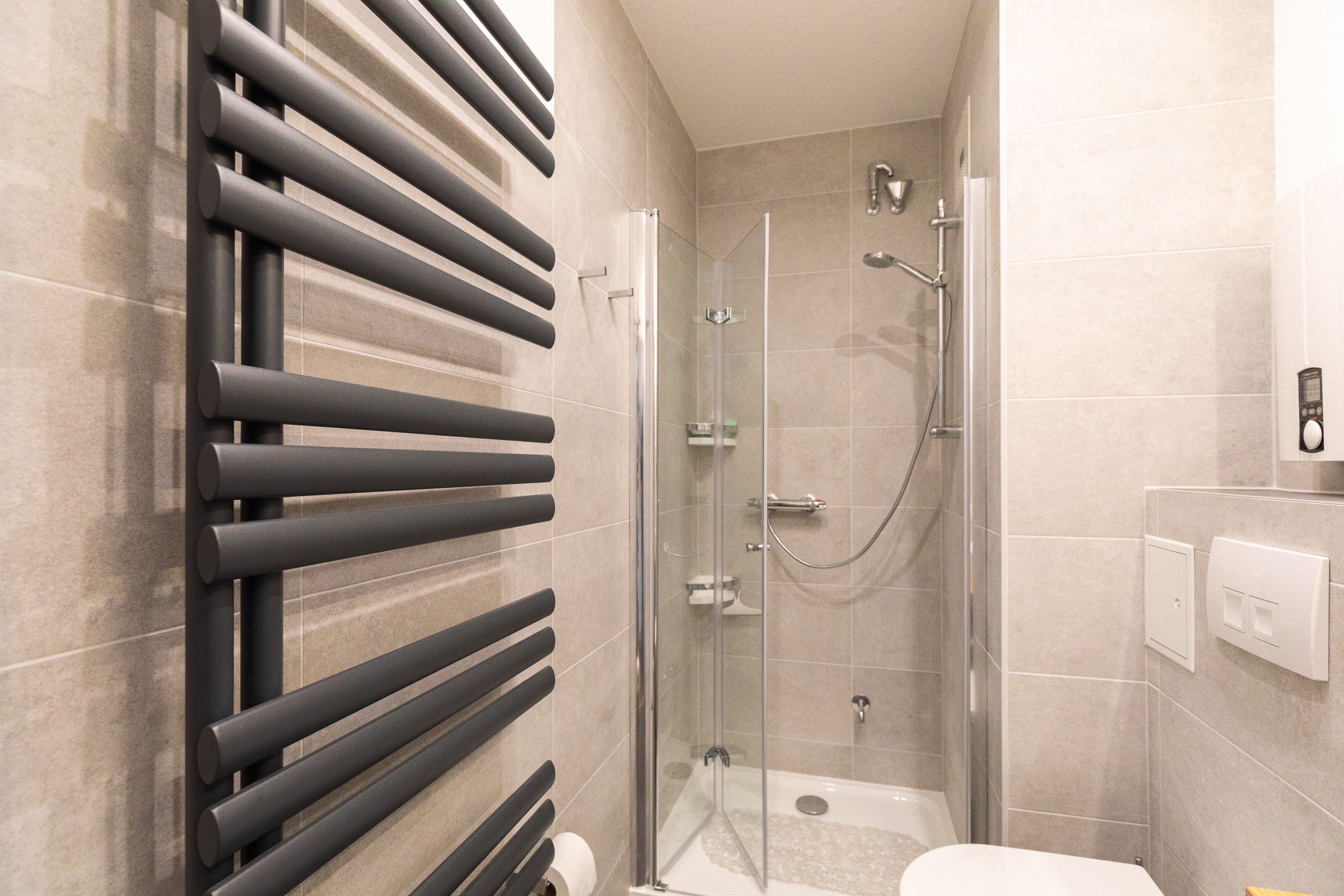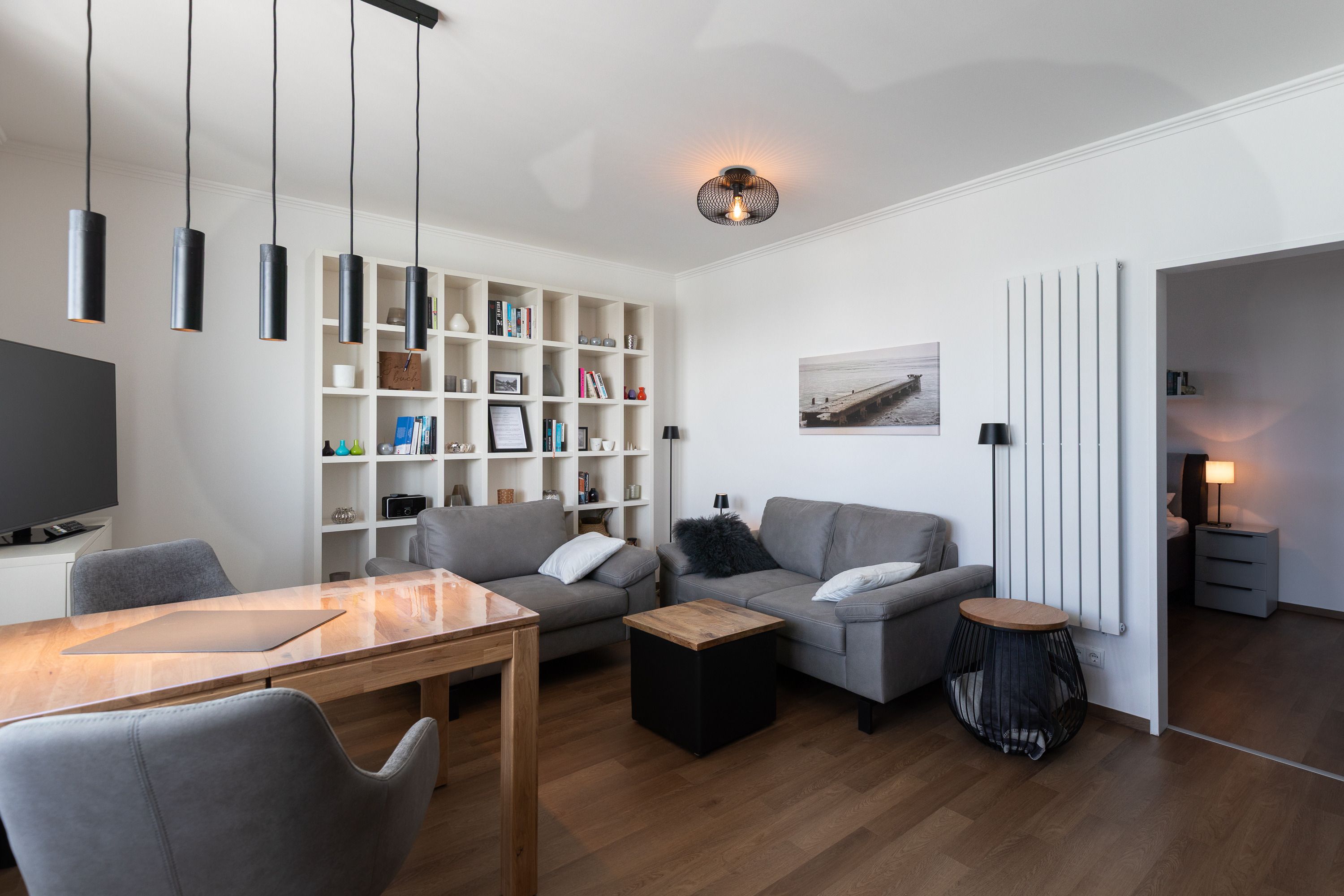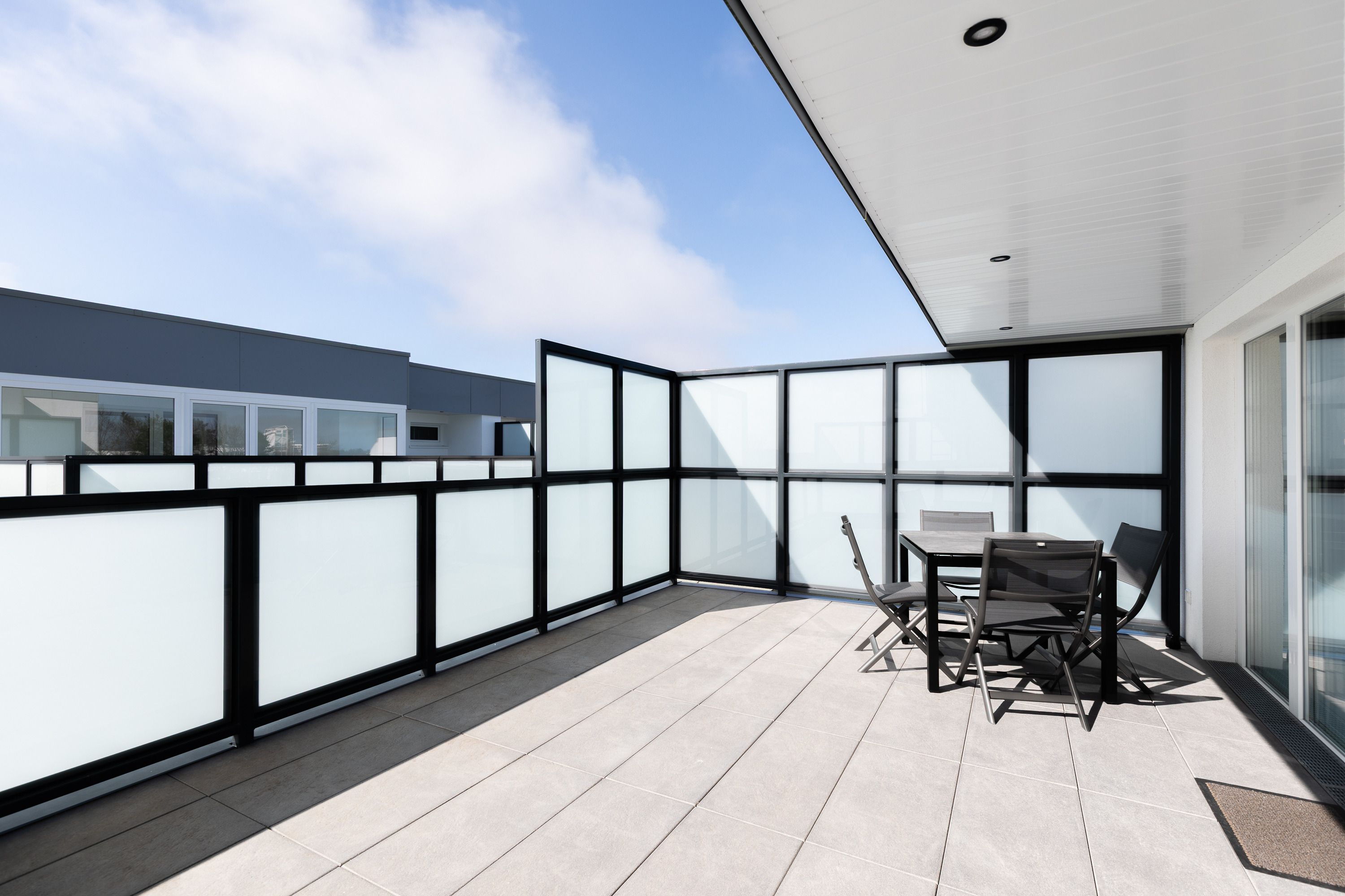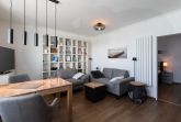 Mit einer Größe von ca. 50 m² Wohnfläche ist die Wohnung komplett bis zu 2 Personen ausgestattet, Wohnzimmer mit kompletter Einbauküche (Backofen (mit Mikrowelle), Cerankochfeld, Toaster, Wasserkocher, Kühlschrank), Essplatz für 2 Personen, Sofa-Ecke und direktem Zugang zur großen Dachterrasse, 1 Schlafzimmer mit Doppelbett (Kleiderschrank, 1 Flatscreen TV), Bad mit Dusche und WC, 1 Flatscreen TV im Wohnzimmer, Nichtraucherwohnung, keine Haustiere, PKW-Stellplatz direkt am Haus. Die kompletten Außen-Türen und die Fenster sind mit Insektenschutz versehen.