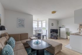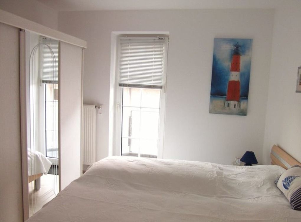 Schöne 2 Raum Wohnung mit einer Größe von ca. 45 m² Wohnfläche im 1. OG, ist komplett für bis zu 4 Personen ausgestattet. 1 Schlafzimmer mit Doppelbett und Kleiderschrank, Wohnzimmer mit Einbauküche (Geschirrspüler, 4 Platten Herd, Backofen, Mikrowelle, Kühlschrank mit Gefrierfach, Wasserkocher, Toaster und Kaffeemaschine), Essplatz für 4 Personen im Erker, Sofa (kann als Schlafsofa genutzt werden), Flatscreen TV, Bad mit Dusche und WC. Die Wohnung verfügt über 1 kleinen Balkon, von hier hat man einen seitlichen Meerblick.