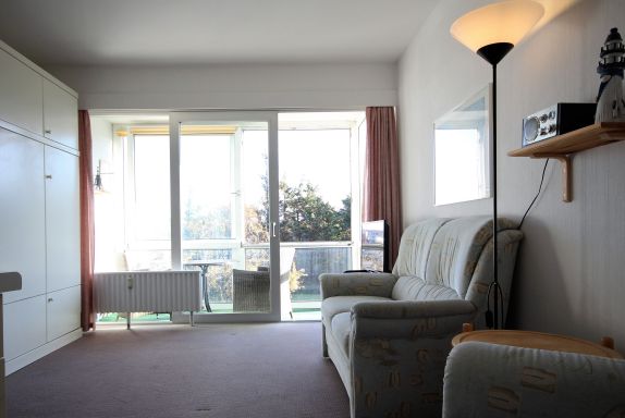 Die 1 Raum Ferienwohnung mit Seesicht Richtung Elbe - den Weltschifffahrtsweg, in der 4. Etage eine Größe von ca. 35 m² Wohnfläche ist komplett bis zu 2 Personen ausgestattet. Das Wohnzimmer verfügt über 2 Schrankbetten (mit 2 Einzelnen Matratzen), Küchenzeile (2 Plattenherd, Wasserkocher, Kaffeemaschine, Toaster), 2 Sessel und kleinem Tisch, Zugang zur verglasten Loggia mit Essplatz für 2 Personen, 1 Bad mit Dusche (ebenerdig) und WC, Waschmaschine und Wäschetrockner im Haus (kostenpflichtig, mit Münzautomat),1 Flatscreen TV (Wohnzimmer), Nichtraucherwohnung, Fahrstuhl im Haus, keine Haustiere, reservierter PKW Stellplatz am Haus.