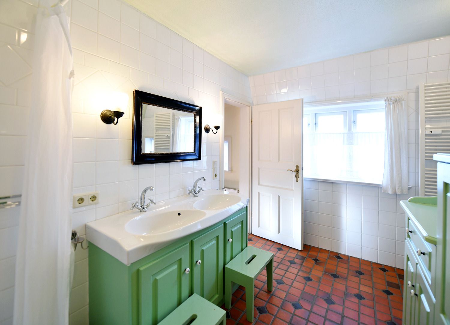 Das Bad verfügt über Badewanne, Dusche, Doppelwaschbecken und Toilette. Separat steht noch eine Gästetoilette zur Verfügung.