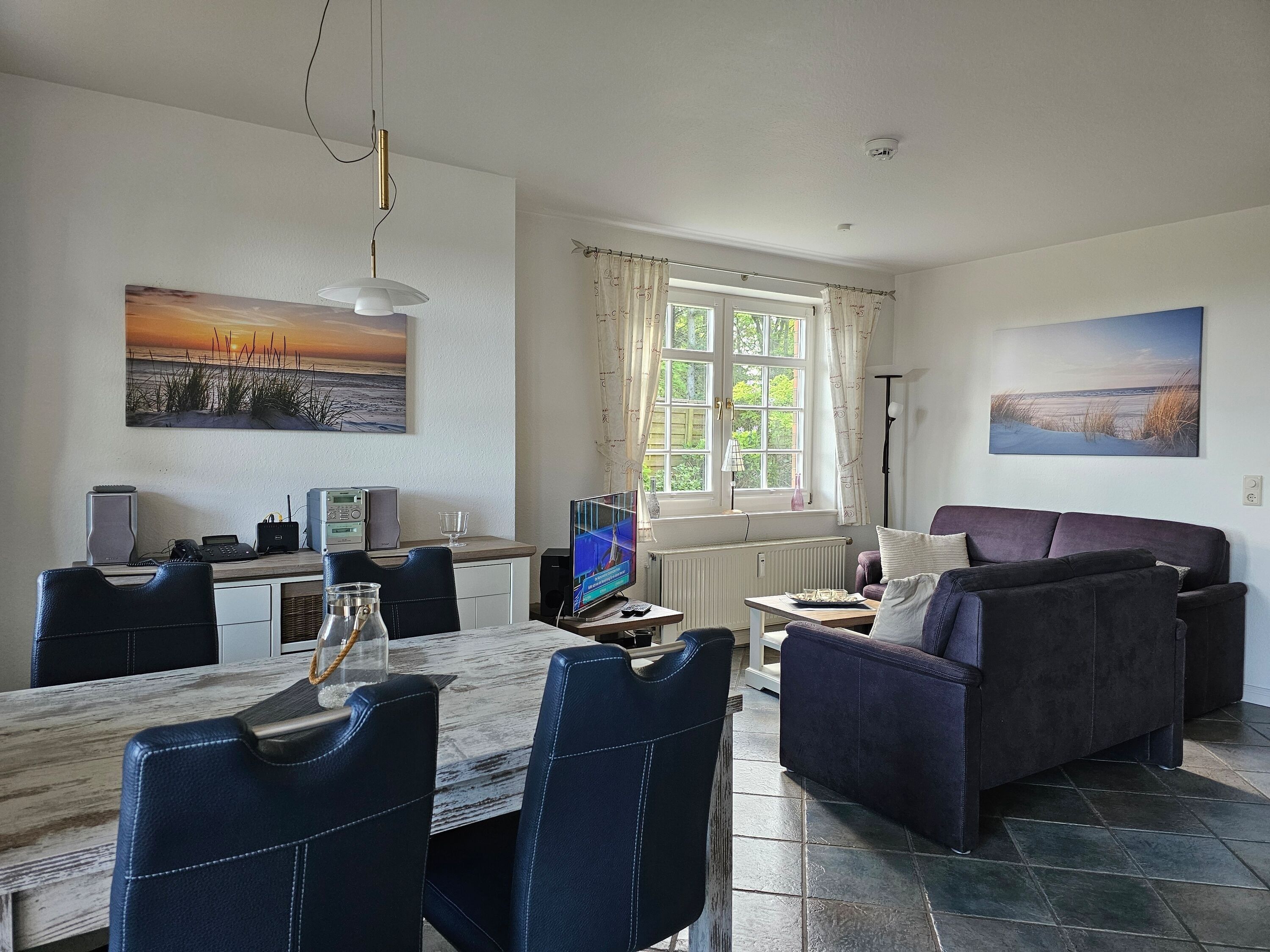 Die Wohnung befindet sich im Erdgeschoss und verfügt über eine teilweise überdachte Terrasse. Im Wohnbereich gibt es eine voll ausgestattete Küche mit Esstisch, eine gemütliche Couch, ein Duschbad und zwei Schlafzimmer. Im Keller des Hauses befindet sich eine Sauna für kühle Abende sowie Waschmaschine und Trockner (gegen Gebühr und zur gemeinschaftlichen Nutzung).