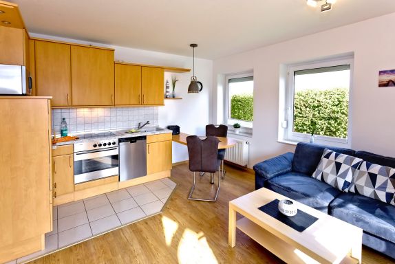 Gemütliche 2-Raum-Wohnung in ruhiger Wohnanlage. Auf 38m² komplett ausgestattet für 2 Personen. Wohnzimmer mit integrierter Küchenzeile (Backofen, Mikrowelle, Ceranfeld etc.), TV, W-Lan kostenfrei, Stereoanlage und Zugang zur überdachten Südterrasse. Schlafzimmer mit Doppelbett & TV, Dusche/WC. Alle Fenster sind mit Außenrollläden versehen. reservierter PKW-Stellplatz #7 am Haus, natürlich Nichtraucher und keine Haustiere.