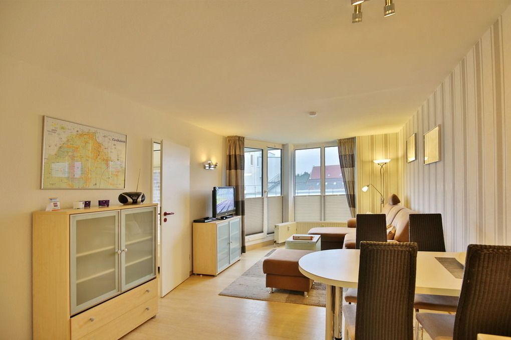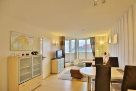 Schöne 2-Raum-Wohnung auf ca. 40m², 3. Etage, komplett ausgestattet bis 4 Pers., 1 Schlafzimmer mit 2 Einzelbetten, 1 kombiniertes Wohn/Schlafzimmer mit Eckschlafcouch, Sat-TV, kostenloses W-Lan, neue Einbauküche mit Mikrowelle, Backofen, Geschirrspüler. Dusche/WC, Flur, Balkon (ost, mit Balkonmöbeln & Sonnenschirm, saisonabhängig) mit Teilseesicht, keine Haustiere, Nichtraucher, Pkw-Stellplatz in der Tiefgarage #309.