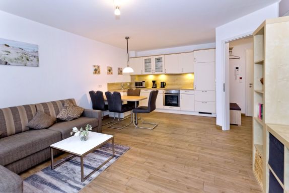 Die angebotene Wohnung befindet sich im 1. Obergeschoss und verfügt über eine Wohnfläche von ca. 49 m². Sie ist vollständig ausgestattet und bietet Platz für bis zu 4 Personen. Zur Verfügung stehen ein Schlafzimmer mit einem Doppelbett, ein gemütlicher Wohn- und Schlafraum mit einer Schlafcouch, ein separater Essplatz sowie ein SAT-TV. Die Küchenzeile ist mit 4 Herdplatten, einem Backofen, einem Wasserkocher, einem Toaster, einem Kühlschrank mit Gefrierfach, einer Mikrowelle, einer Spülmaschine und einer Kaffeemaschine ausgestattet. Ein Bad mit Dusche und WC sowie ein Föhn sind ebenfalls vorhanden. Die Wohnung ist für Nichtraucher und Haustiere sind nicht erlaubt. Zum Parken steht ein nummerierter Stellplatz hinter dem Haus zur Verfügung (Durchfahrtshöhe 2 m). Außerdem gibt es ein abschließbares Fahrradhaus.