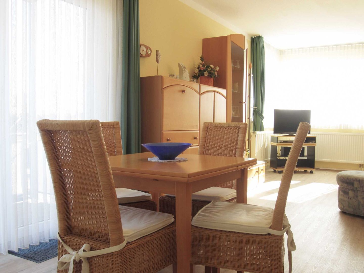 Das großzügige Wohnzimmer verfügt über eine gemütliche Sofaecke, eine Kommode und einen Esstisch, der zu gemeinsamen Mahlzeiten einlädt. Für entspannte Abende sorgt ein moderner Kabel-TV (35–44 Zoll). Der Bodenbelag in Wohn- und Schlafzimmer besteht aus pflegeleichtem Laminat. Das Schlafzimmer ist mit Schlafmöglichkeiten für insgesamt bis zu drei Gäste ausgestattet. Leider verfügt die Wohnung über KEIN Wlan.
