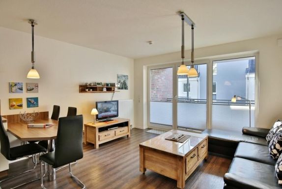Sehr schöne, vollständig ausgestattete Wohnung über ca.49m², 1.Etage mit großem, geschützten Balkon (süd), 1 Schlafzimmer mit Doppelbett und TV, Wohn-/Schlafzimmer mit Schlafcouch, teilweise mit Insektenschutz, SAT-TV, DVD, Stereo, kostenloses W-LAN, komplette Küchenzeile mit Geschirrspüler, Backofen, Mikrowelle, Gefrierfach, Du/Wc, Föhn, Rollladen an allen Fenstern, Pkw-Stellplatz #4, Nichtraucher, keine Haustiere gestattet.