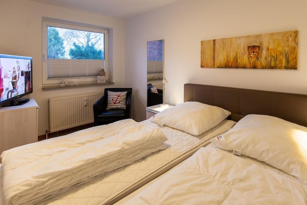 2-Raum-Parterrewohnung mit ca. 52m². Komplett ausgestattet bis 4 Pers. Wohnzimmer mit Küchenzeile vollausgestatter Küchenzeile (Geschirrspüler, Backofen etc.), Doppelbettcouch und Zugang zur Terrasse (west), Kabel-TV, W-Lan kostenfrei. 1 Schlafzimmer mit Doppelbett & TV, Du/WC, keine Haustiere, Nichtraucher, reservierter Pkw-Stellplatz #13 vor dem Haus.