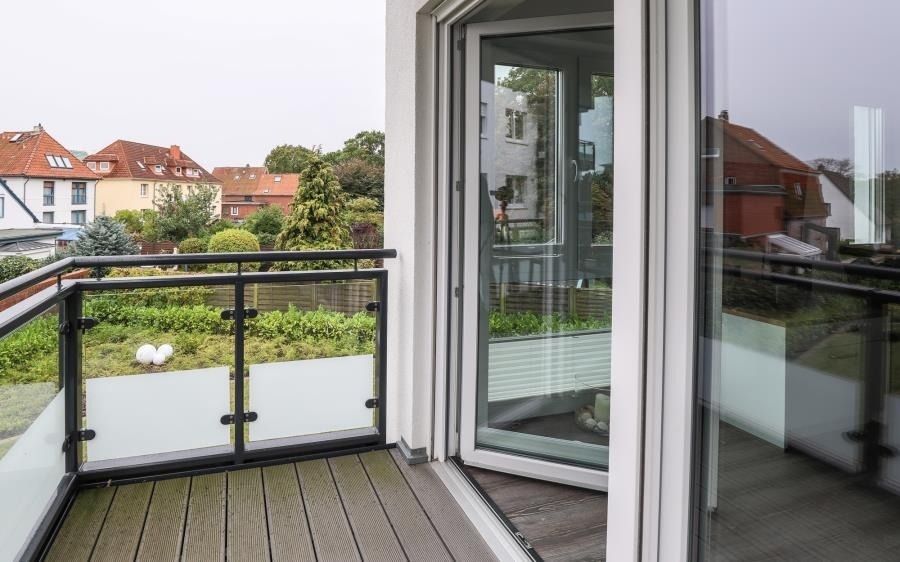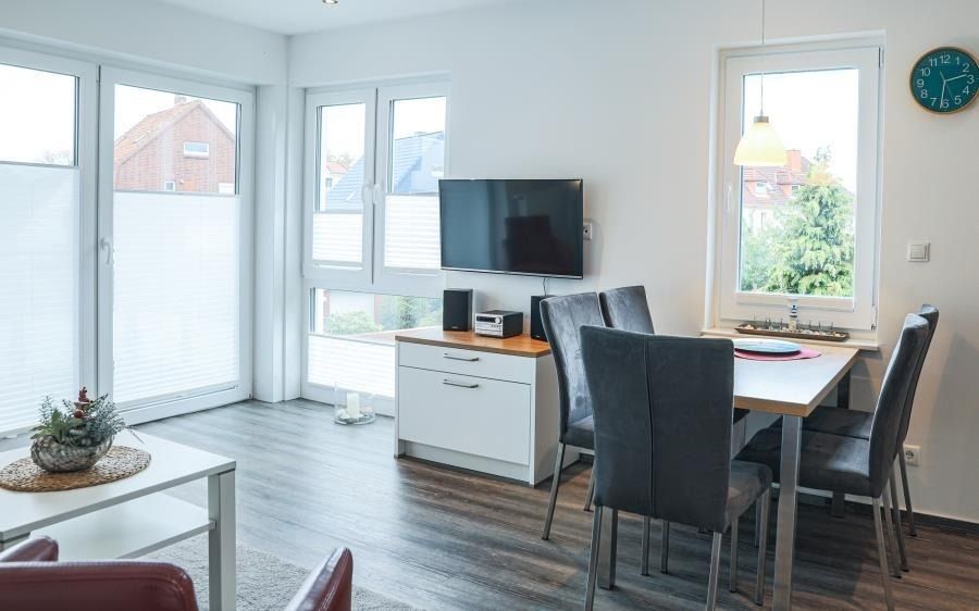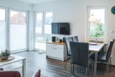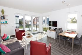 Die Wohnung befindet sich in der 1. Etage des Hauses Steuerbord und ist bequem mit dem Fahrstuhl erreichbar. Barrierefreiheit ist bei uns selbstverständlich. Der Wohn-, Ess- und Küchenbereich erwartet Sie mit einer hellen, gemütlichen Atmosphäre und stilvollen Möbeln. Von hier aus gelangen Sie auf den großzügigen Balkon, der mit bequemen Sitzmöbeln ausgestattet ist und Ihnen einen entspannten Platz im Freien bietet.