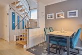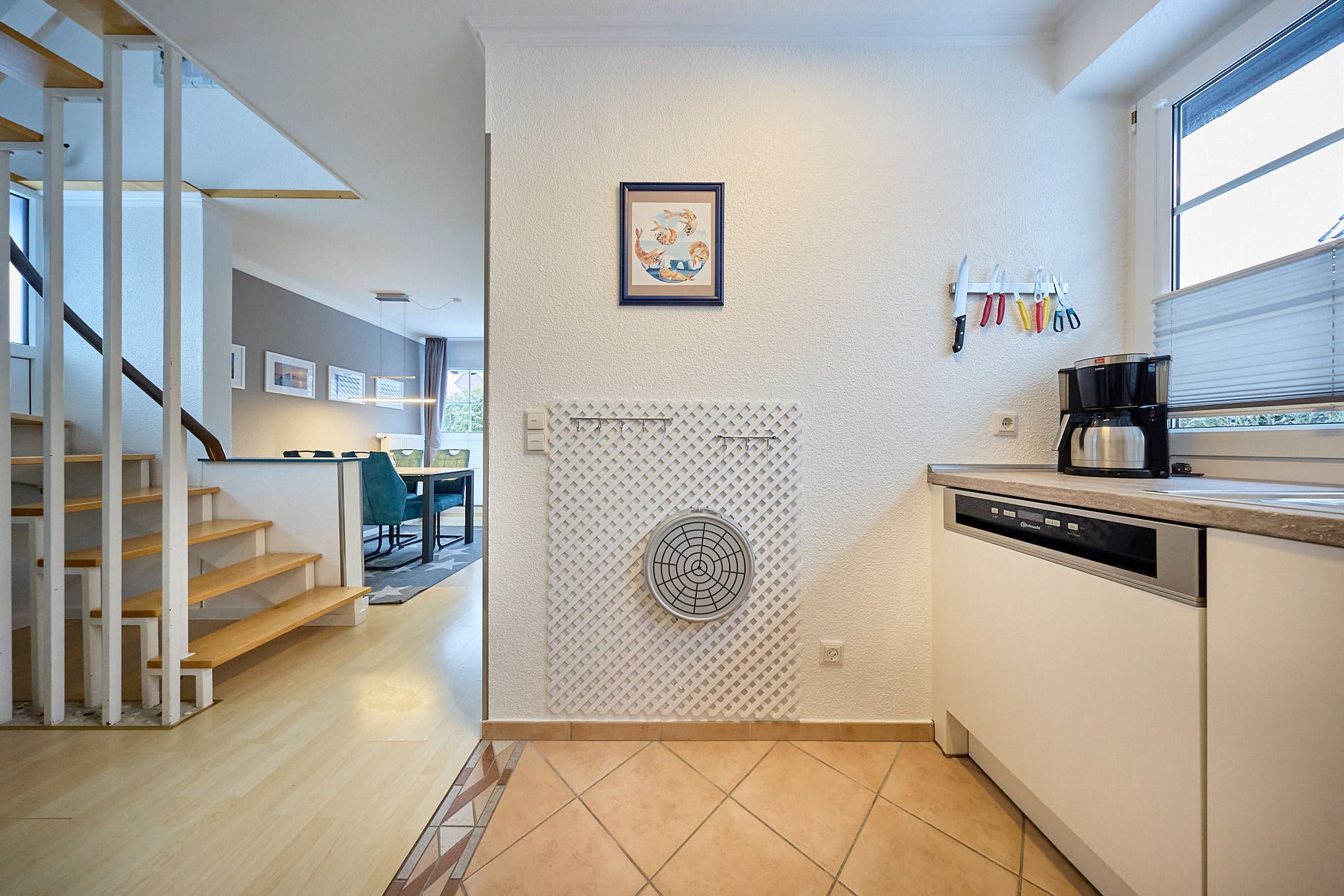 Im Erdgeschoss erwartet Sie ein offener Wohn- und Essbereich mit gemütlicher Sitzecke, Zugang zur Terrasse mit Garten, sowie einer komplett ausgestatteten Einbauküche. Ideal für gemeinsame Mahlzeiten und entspannte Abende. Ebenfalls im Erdgeschoss befindet sich ein modernes Duschbad mit Waschbecken – bitte beachten Sie: ohne WC.