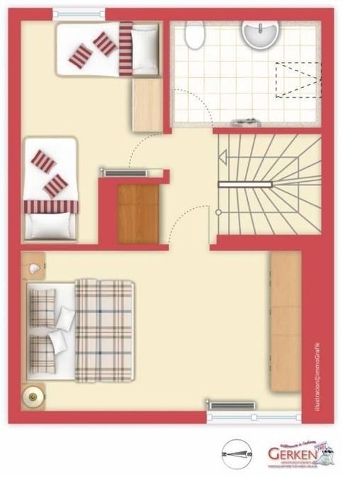 Im Obergeschoss finden Sie ein separates WC mit Waschbecken sowie die beiden Schlafbereiche:
