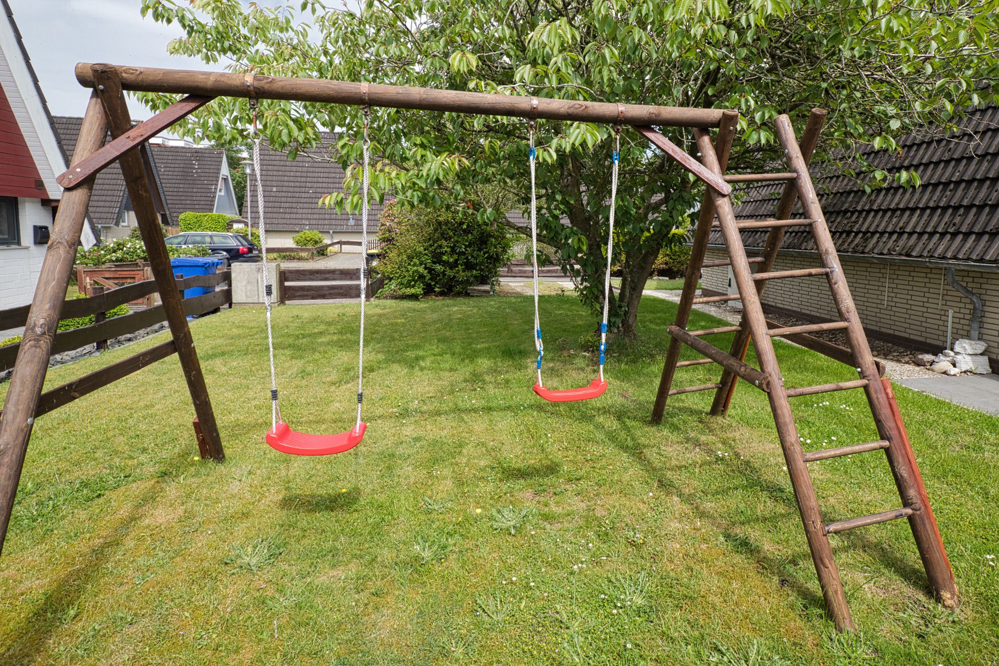 Der Außenbereich bietet etwas Abwechslung: Ein Garten mit Sandkiste, Schaukel und einem Gartenhaus als Abstellplatz für Fahrräder steht Ihnen zur Verfügung. Das gesamte Grundstück ist umzäunt, ideal für die Sicherheit der kleinen Abenteurer. Die großzügige Terrasse lädt zu geselligen Grillabenden und entspanntem Sonnenbaden ein.