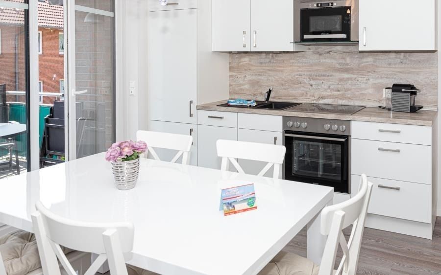 Die gut ausgestattete Küchenzeile fügt sich harmonisch in den Wohnbereich ein und bietet alles, was für eine entspannte Selbstversorgung benötigt wird: