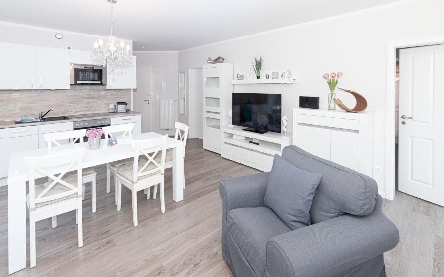 Die Wohnung besticht durch bodentiefe Fenster, viel Tageslicht und eine freundliche Atmosphäre. Der offen gestaltete Wohn- und Essbereich ist geschmackvoll eingerichtet und lädt zu gemeinsamen Stunden ein – ob entspannt auf dem Sofa, beim Essen oder am Abend vor dem Smart-TV. Ein hochwertiges Bose SoundTouch Internetradio sorgt für angenehme Klangqualität, während das kostenfreie WLAN die digitale Kommunikation erleichtert.