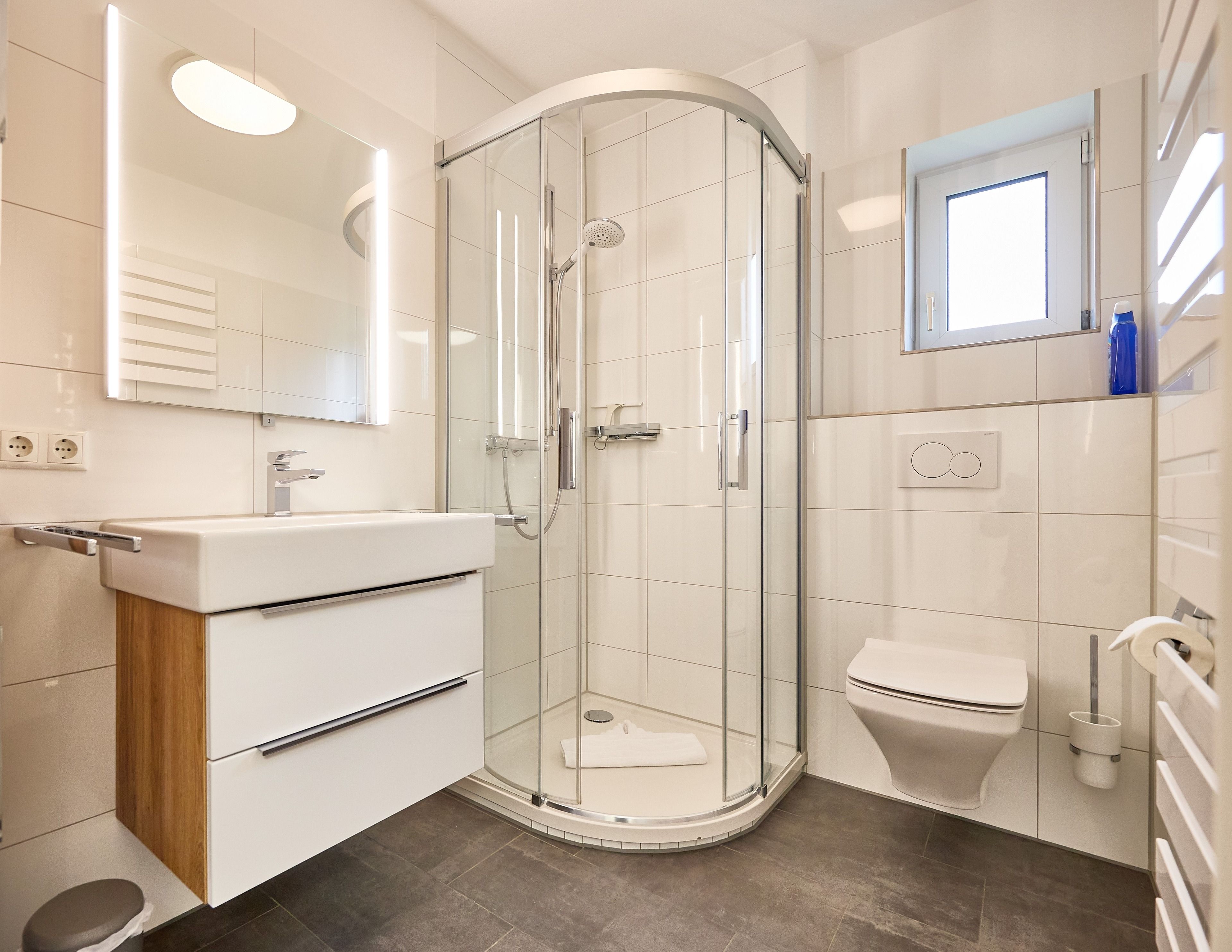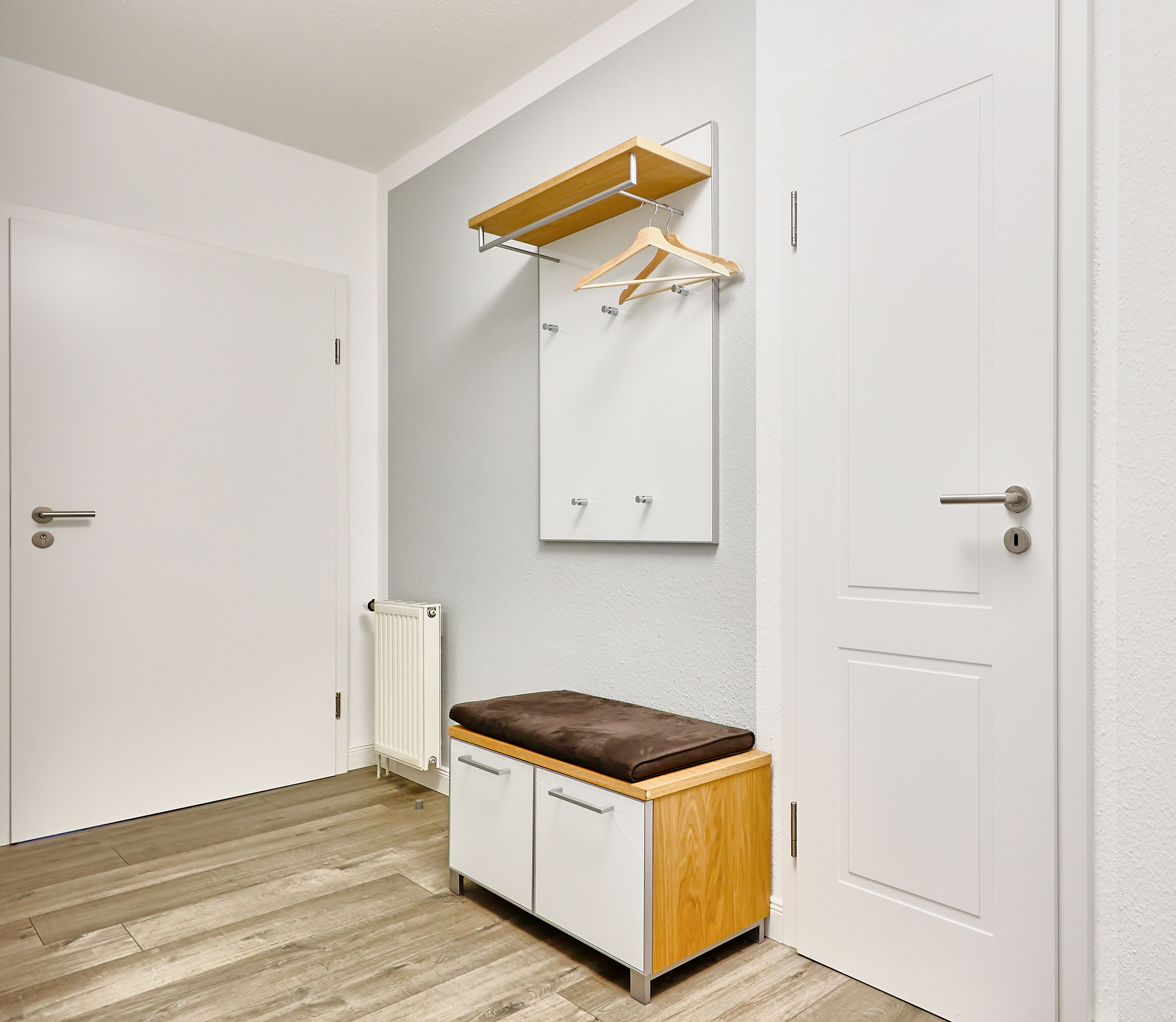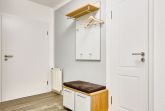 Der Eingangsbereich, mit einer praktischen Garderobe ausgestattet, führt Sie direkt ins Schlafzimmer. Dort erwartet Sie ein geräumiger Kleiderschrank, ein kuscheliges Doppelbett und Verdunklungsmöglichkeiten für traumhafte Nächte. Das Duschbad mit WC punktet mit einem Außenfenster und einem Handtuchheizkörper.