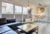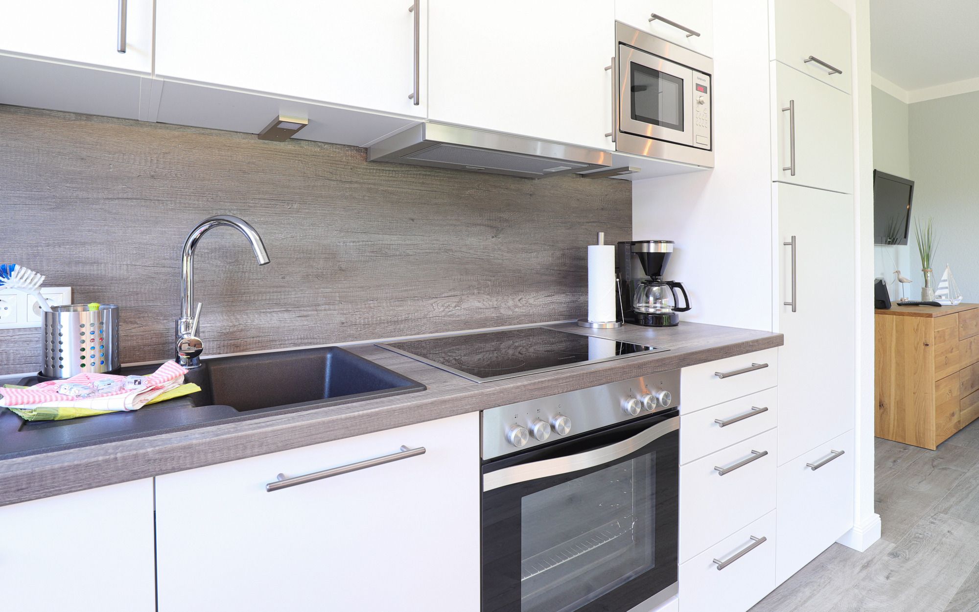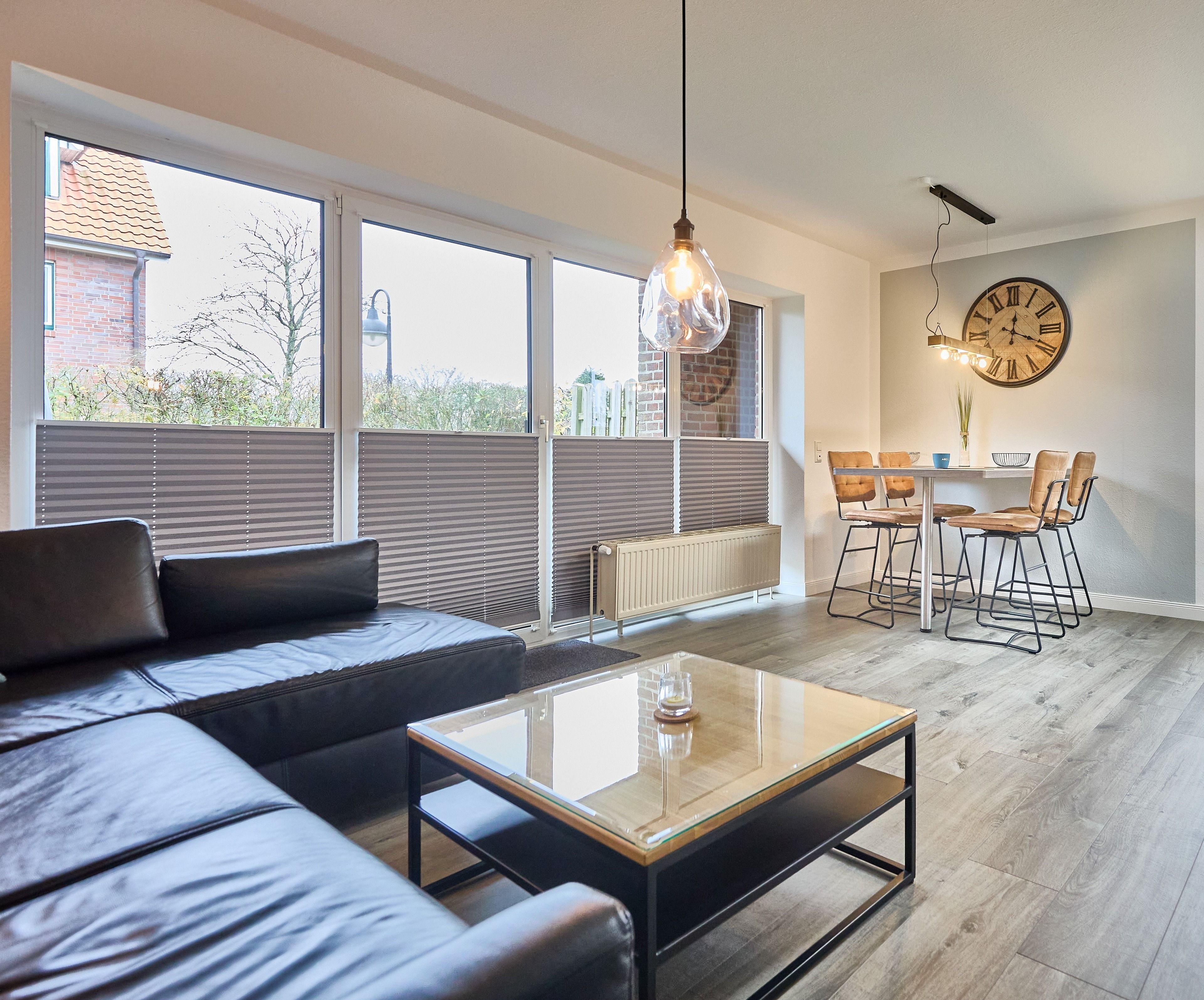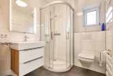 Der Wohnbereich, gestaltet mit einer stylischen Ledercouch und einem wandhängenden Flat-TV, öffnet sich zur westlich gelegenen Terrasse. Einladend für entspannte Momente und abendliches Relaxen. Ein großer Esstisch und die komplett ausgestattete Einbauküche mit Geschirrspüler lassen keine Wünsche offen. Der Abstellraum mit Waschmaschine komplettiert das Rundum-sorglos-Paket.